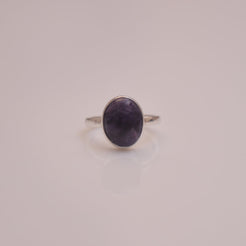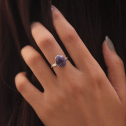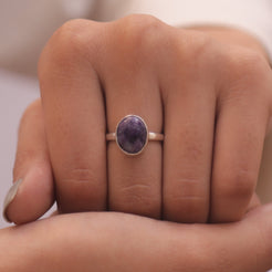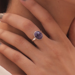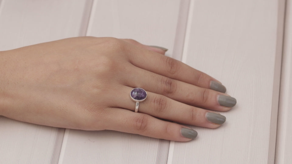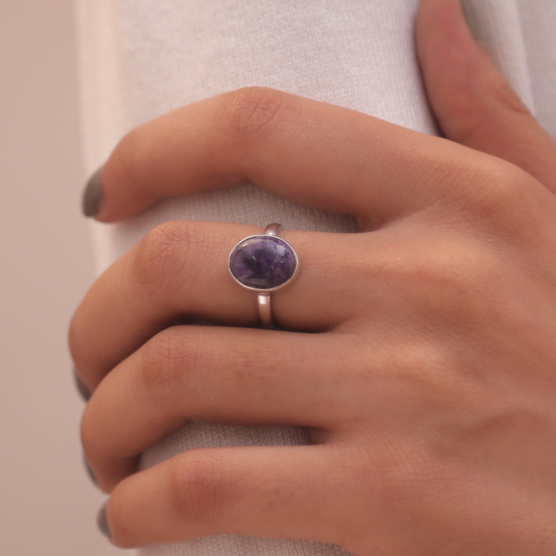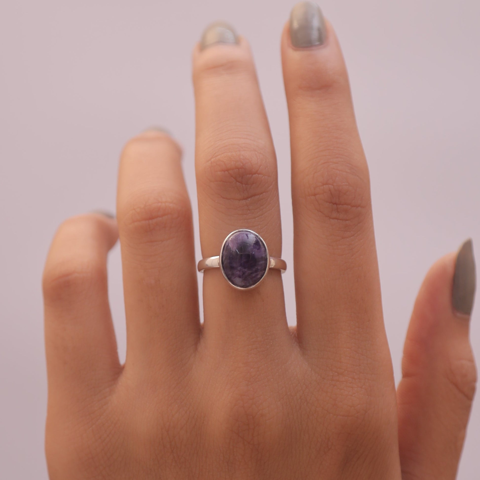 Elevate your style with the Charoite Ring, a masterpiece that blends natural beauty with refined craftsmanship. The ring features a radiant Charoite centerpiece, carefully cut to enhance its inherent allure and brilliance. Set in a band crafted from 925 sterling silver, it offers durability and a lasting shine that complements the gemstone's vibrant hue.
