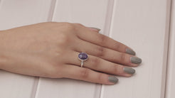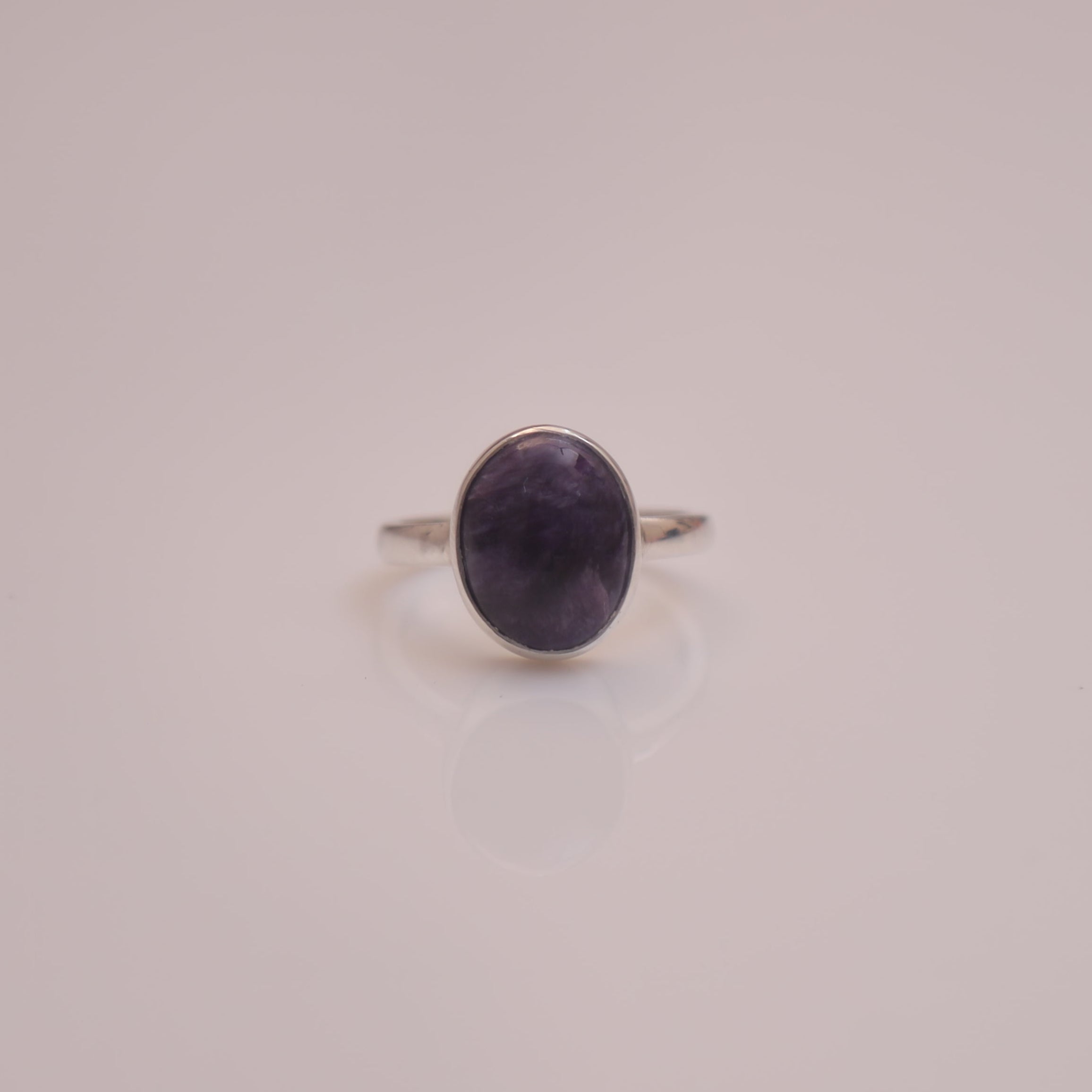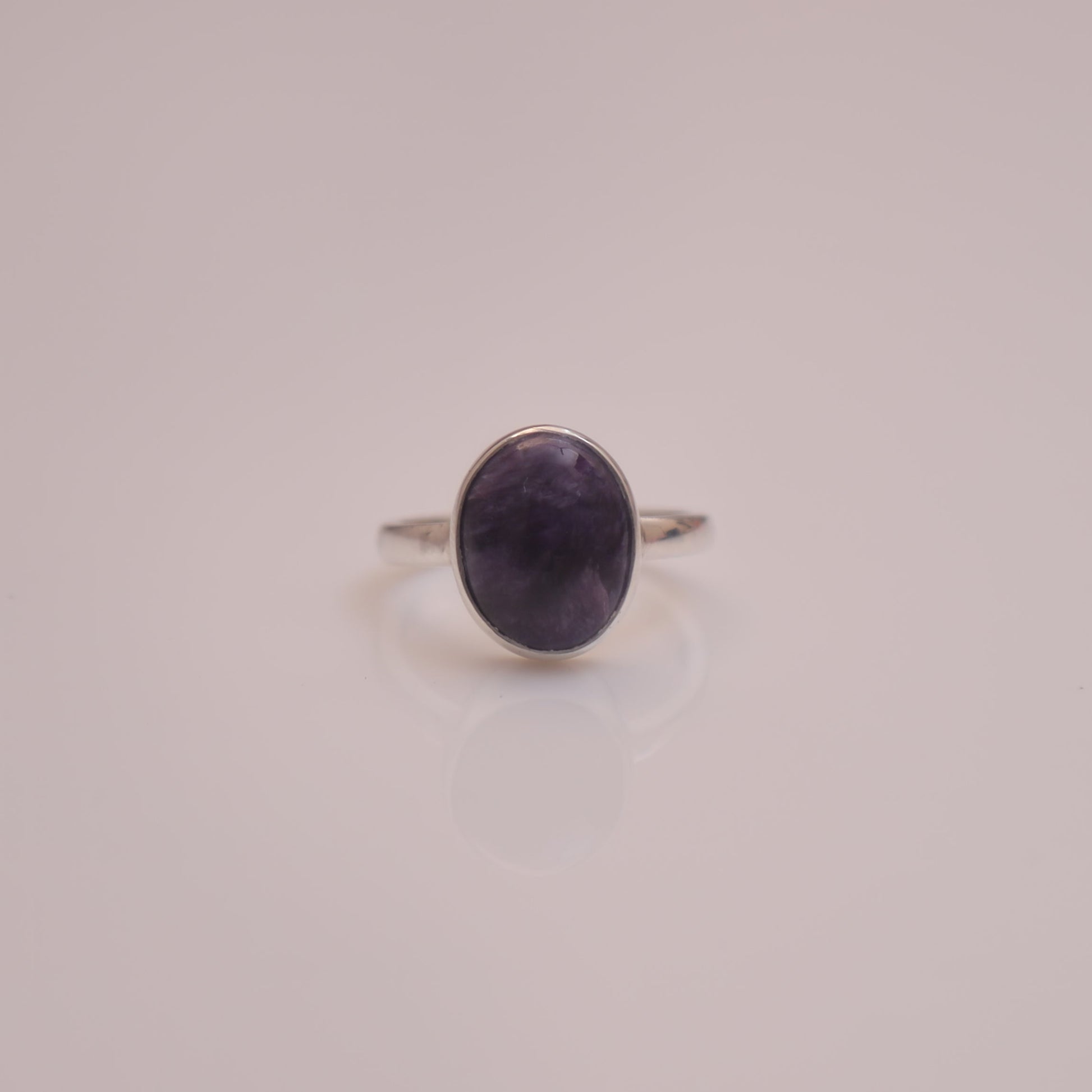 Each detail of the ring showcases expert craftsmanship, from the precisely set prongs securing the Charoite to the polished silver band ensuring a comfortable fit. The design allows the Charoite to shine as the focal point, making it a versatile accessory suitable for everyday wear or special occasions.