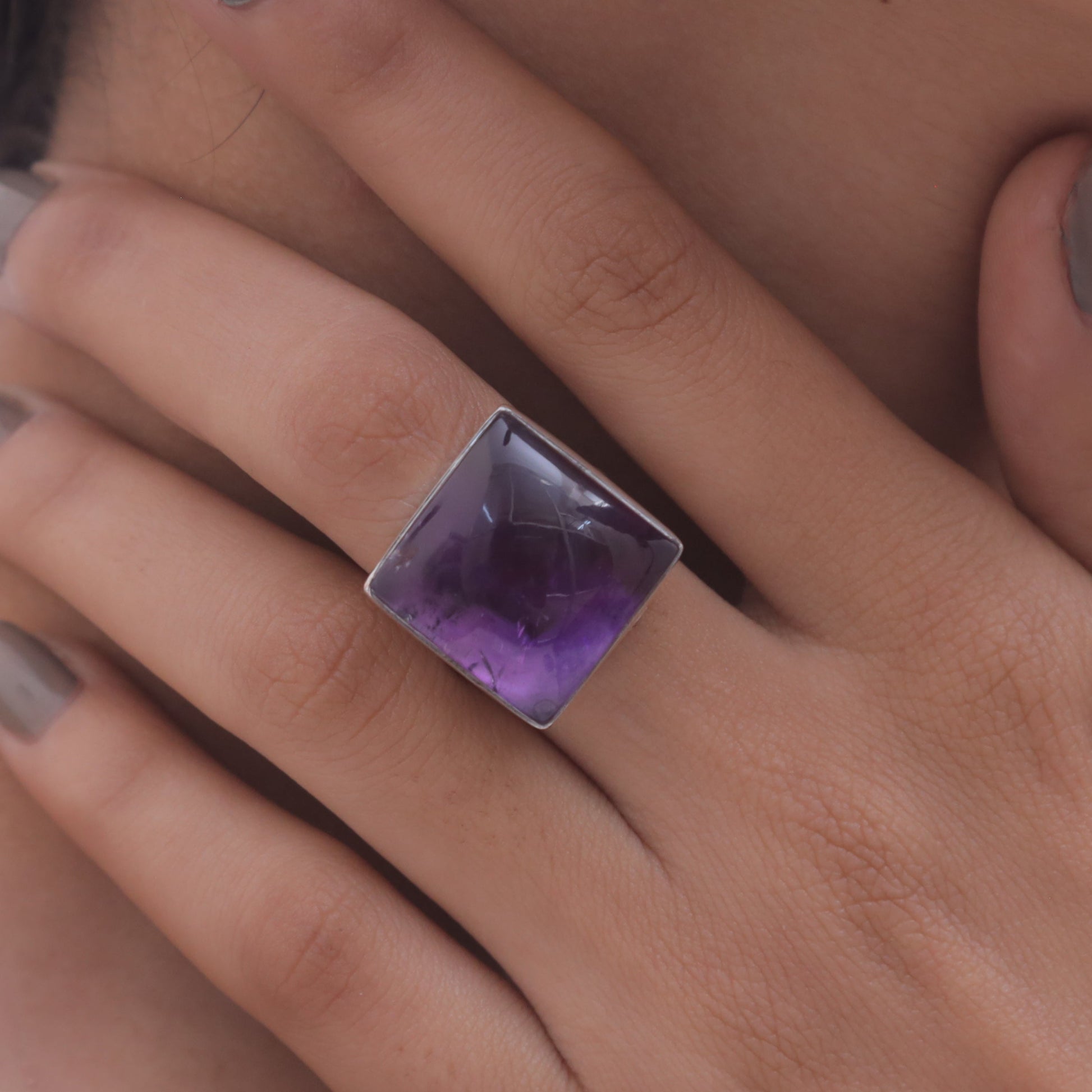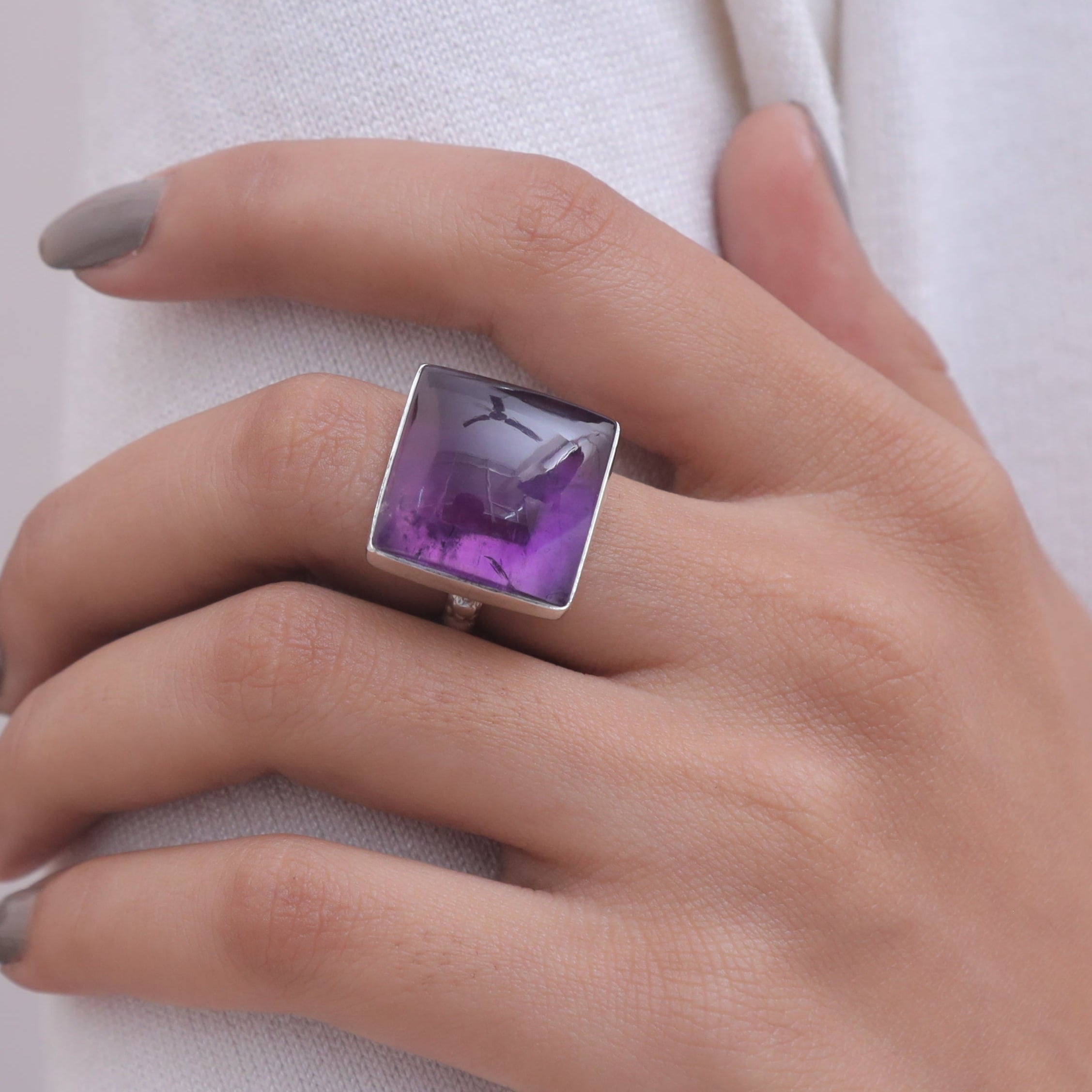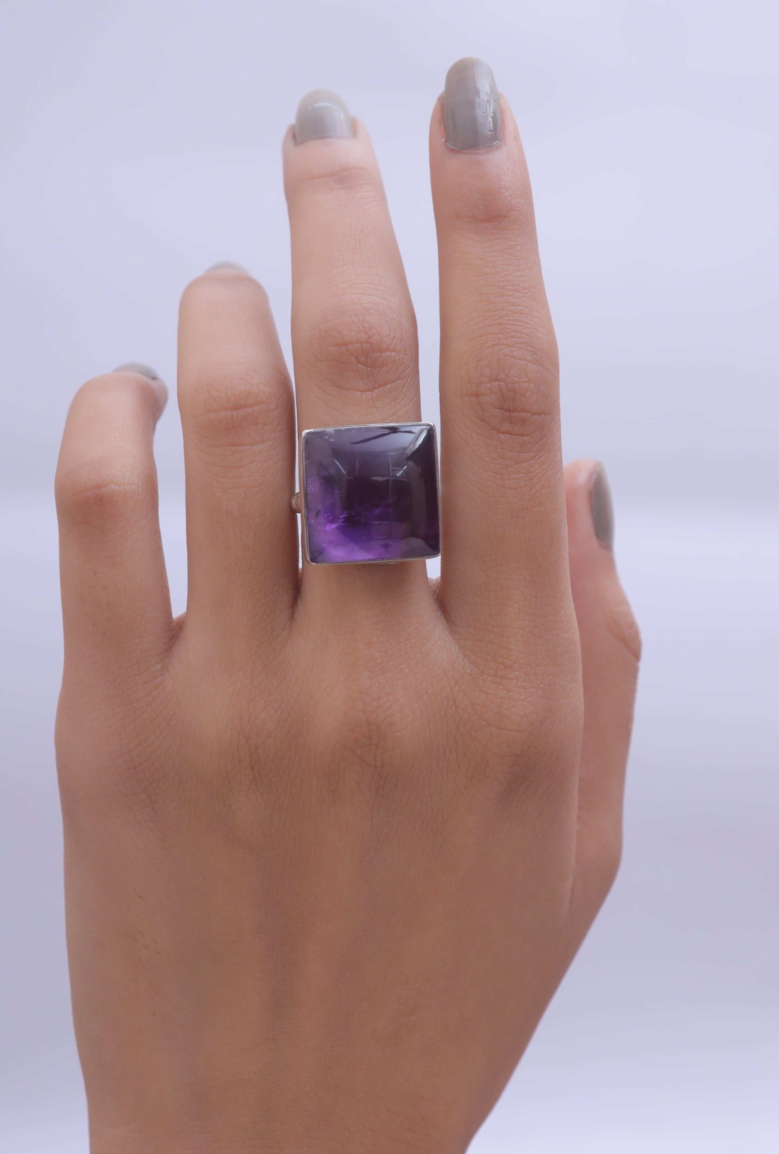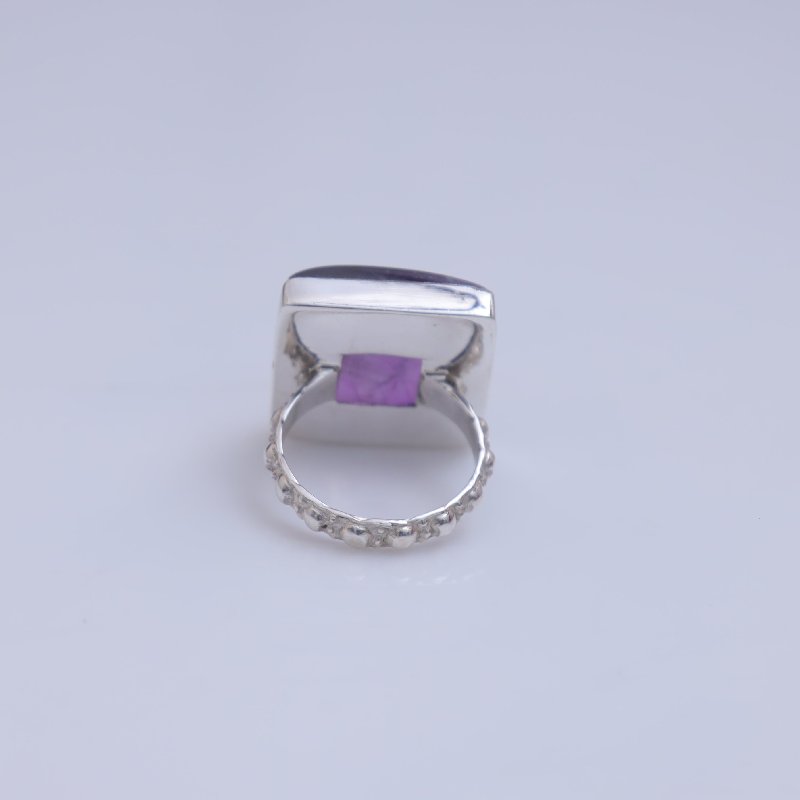 Each detail of the ring showcases expert craftsmanship, from the precisely set prongs securing the Amethyst to the polished silver band ensuring a comfortable fit. The design allows the Amethyst to shine as the focal point, making it a versatile accessory suitable for everyday wear or special occasions.