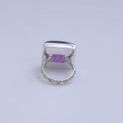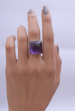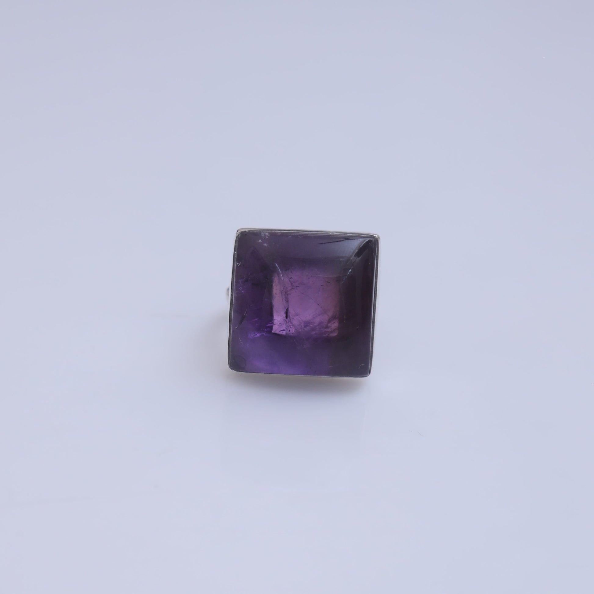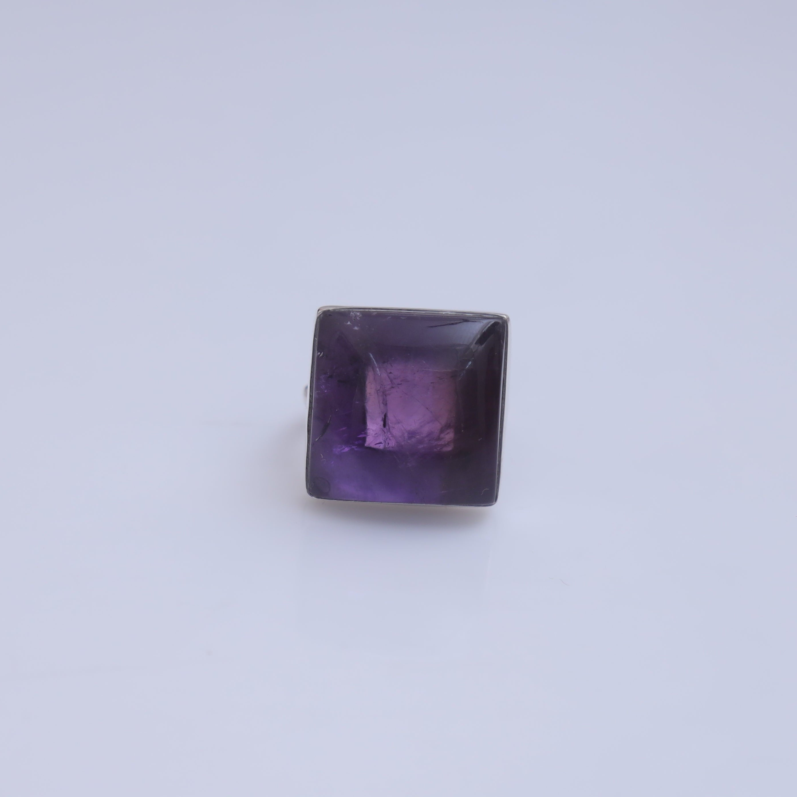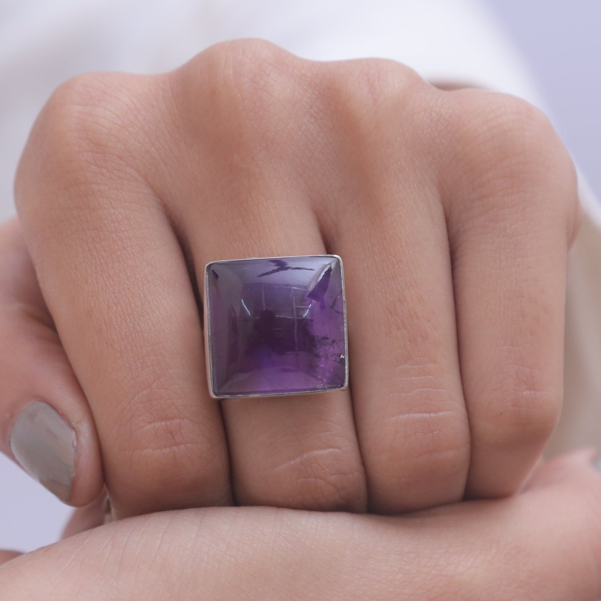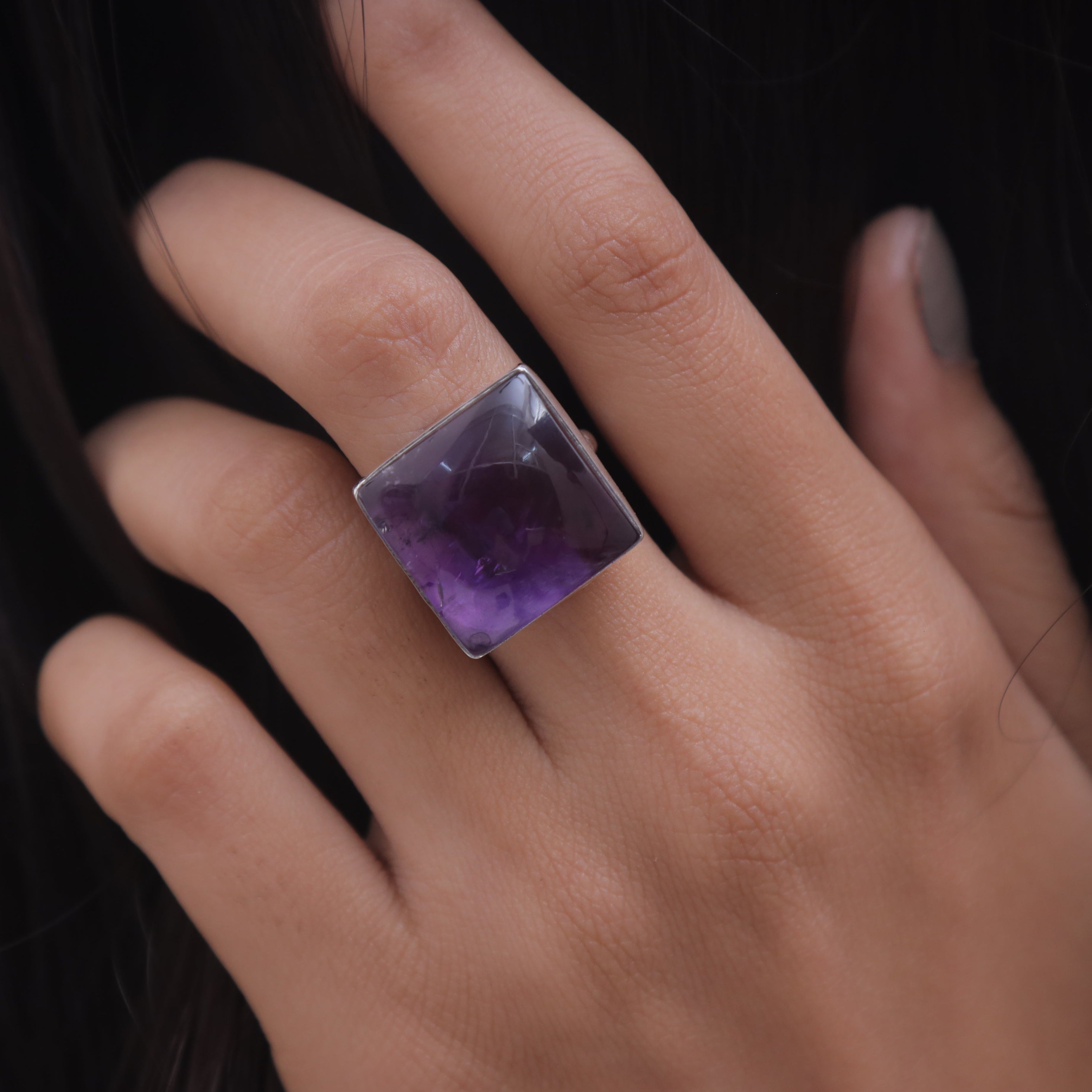 Each detail of the ring showcases expert craftsmanship, from the precisely set prongs securing the Amethyst to the polished silver band ensuring a comfortable fit. The design allows the Amethyst to shine as the focal point, making it a versatile accessory suitable for everyday wear or special occasions.