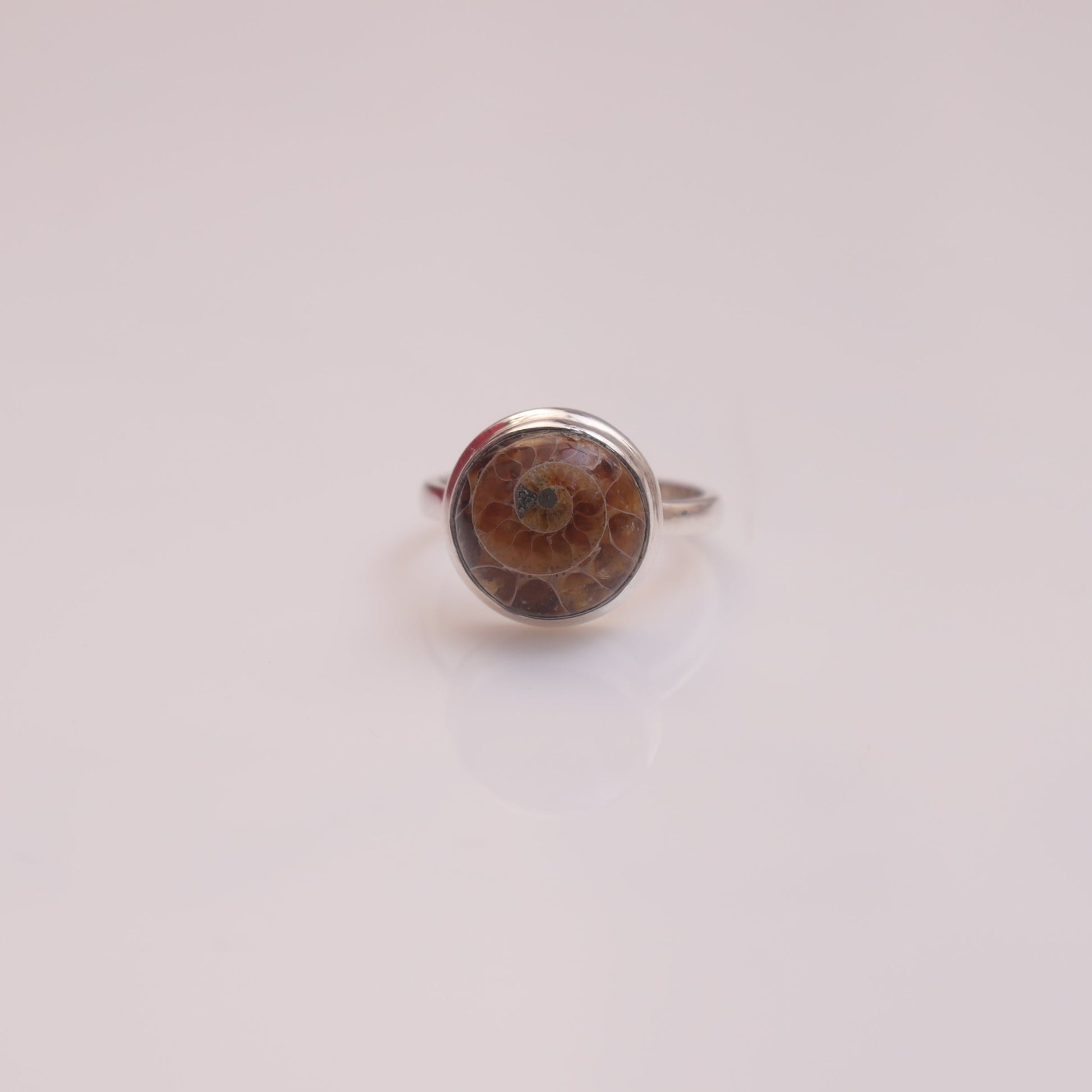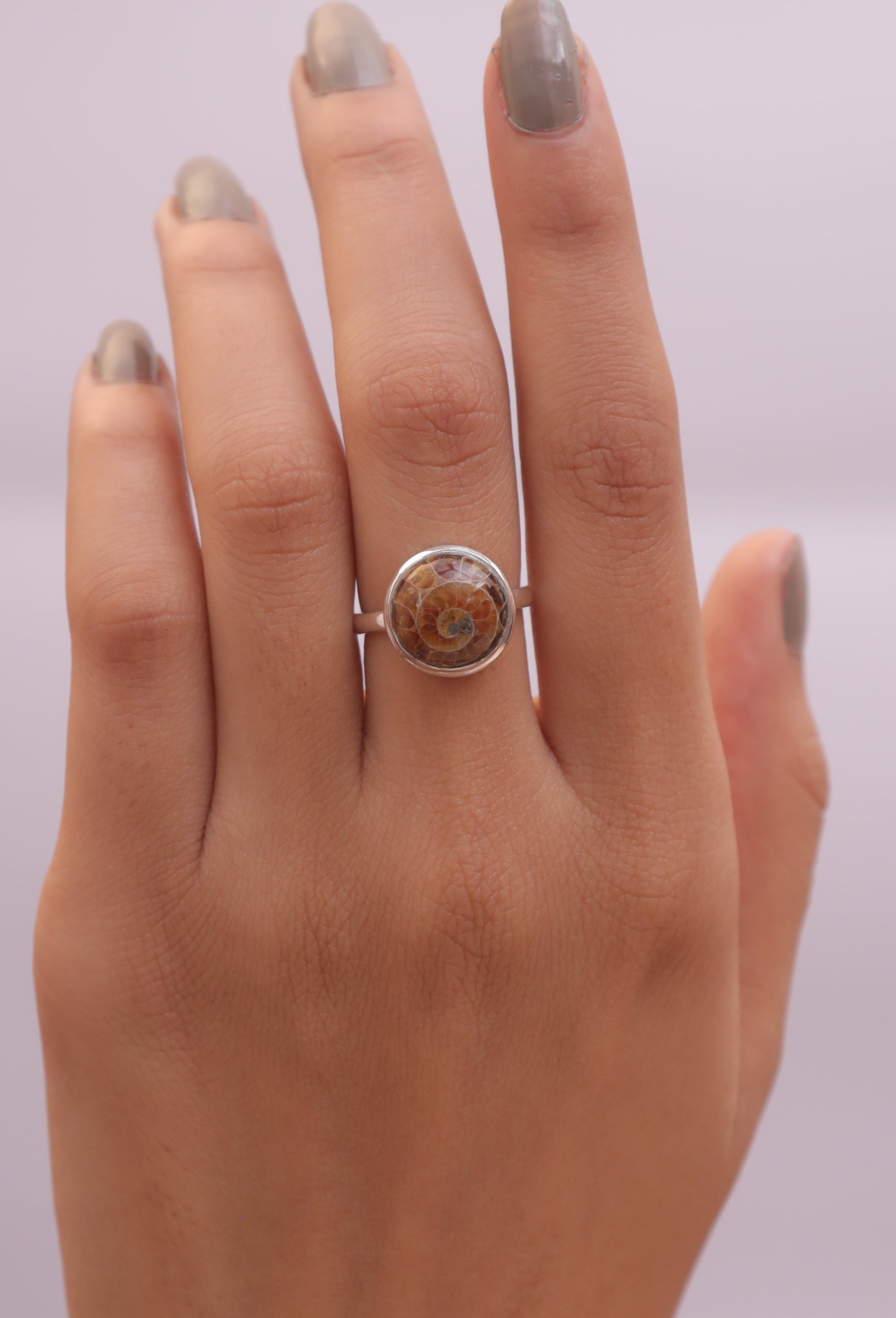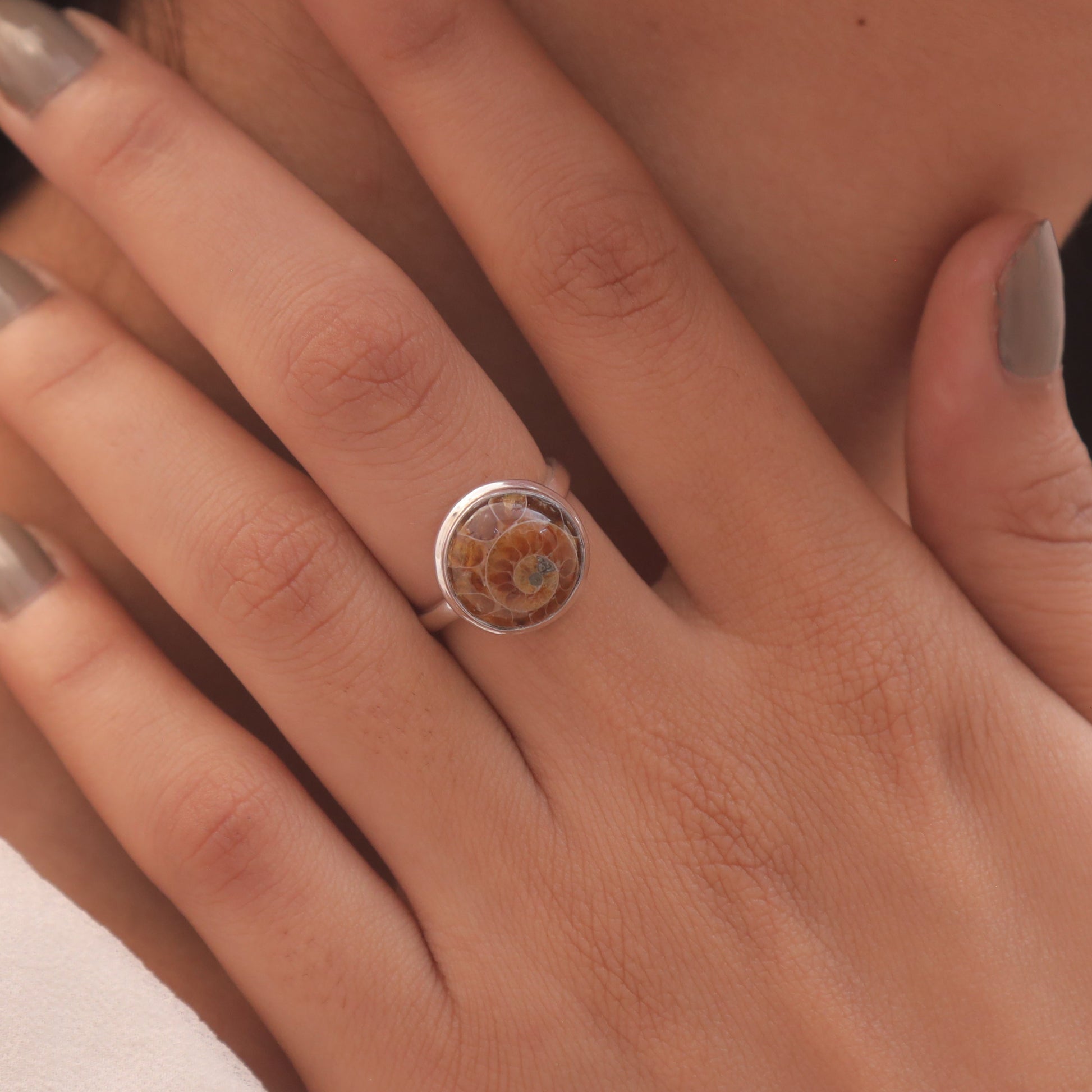 Crafted with precision, the Ammonite is securely held by polished prongs, allowing it to shine as the focal point of each ring. The design ensures comfort and a perfect fit, making these rings versatile for everyday wear or special occasions.