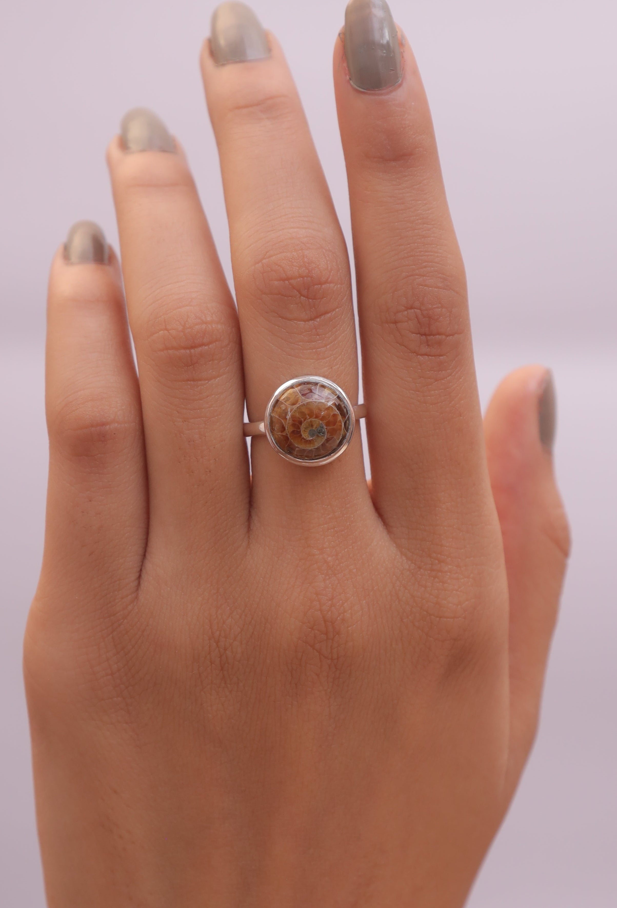 Elevate your style with the Ammonite Sterling Silver Ring, a testament to blending natural beauty with refined craftsmanship. Each ring features a radiant Ammonite gemstone, carefully cut to enhance its inherent allure and brilliance. Set in 925 sterling silver, these rings offer durability and a lasting shine that complements the gemstone's vibrant hue.
