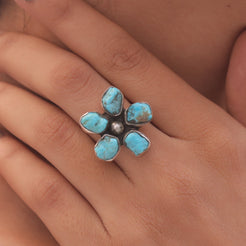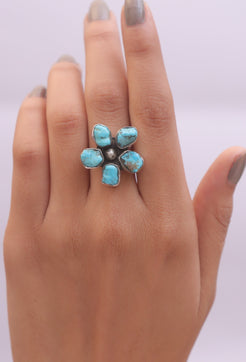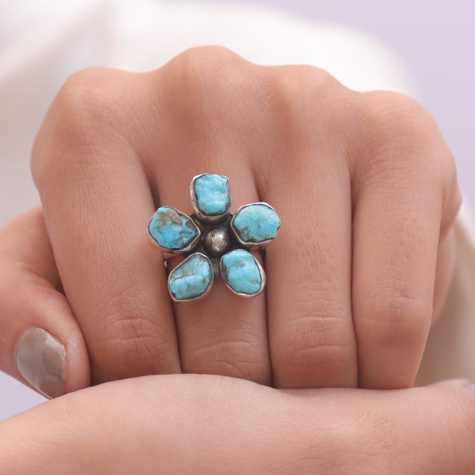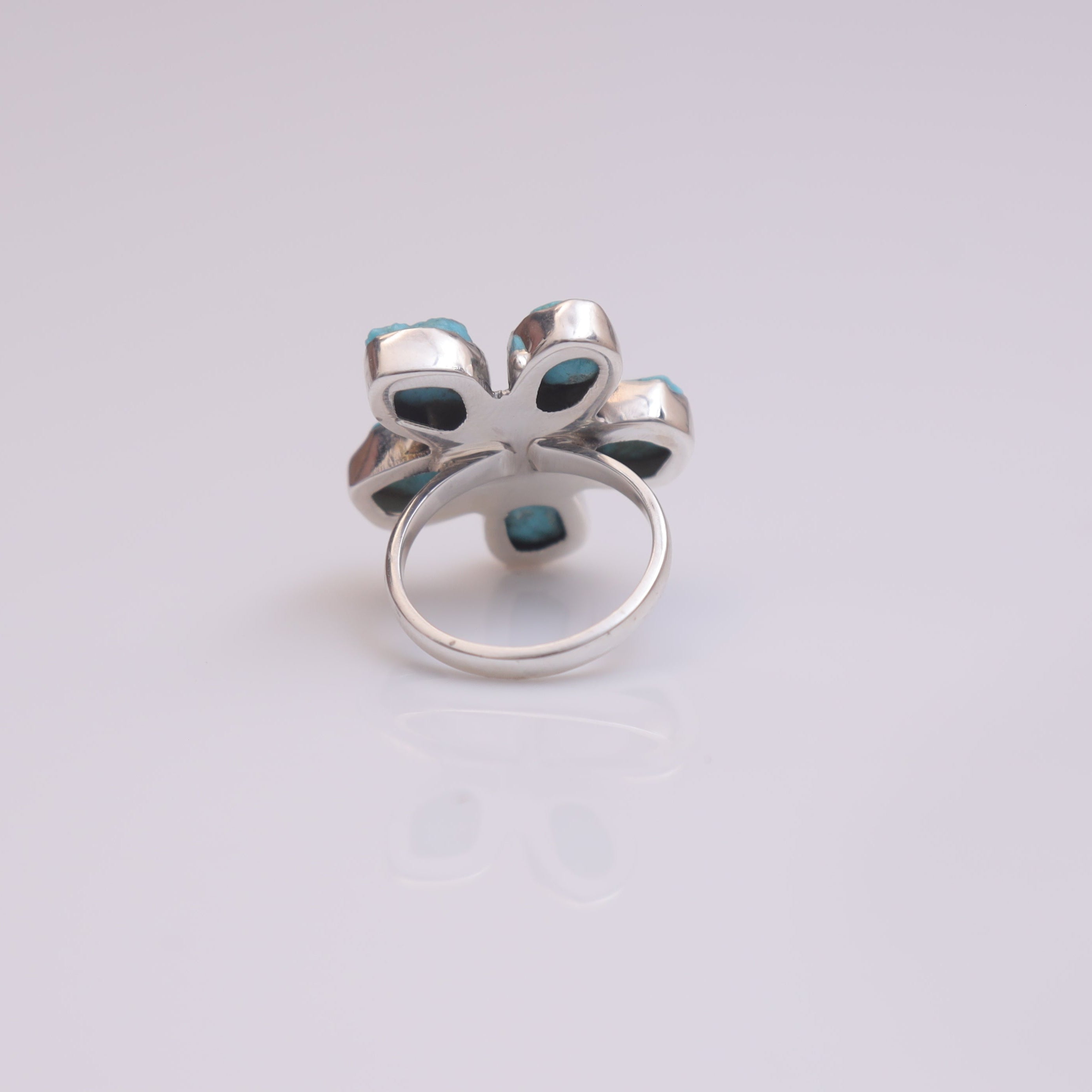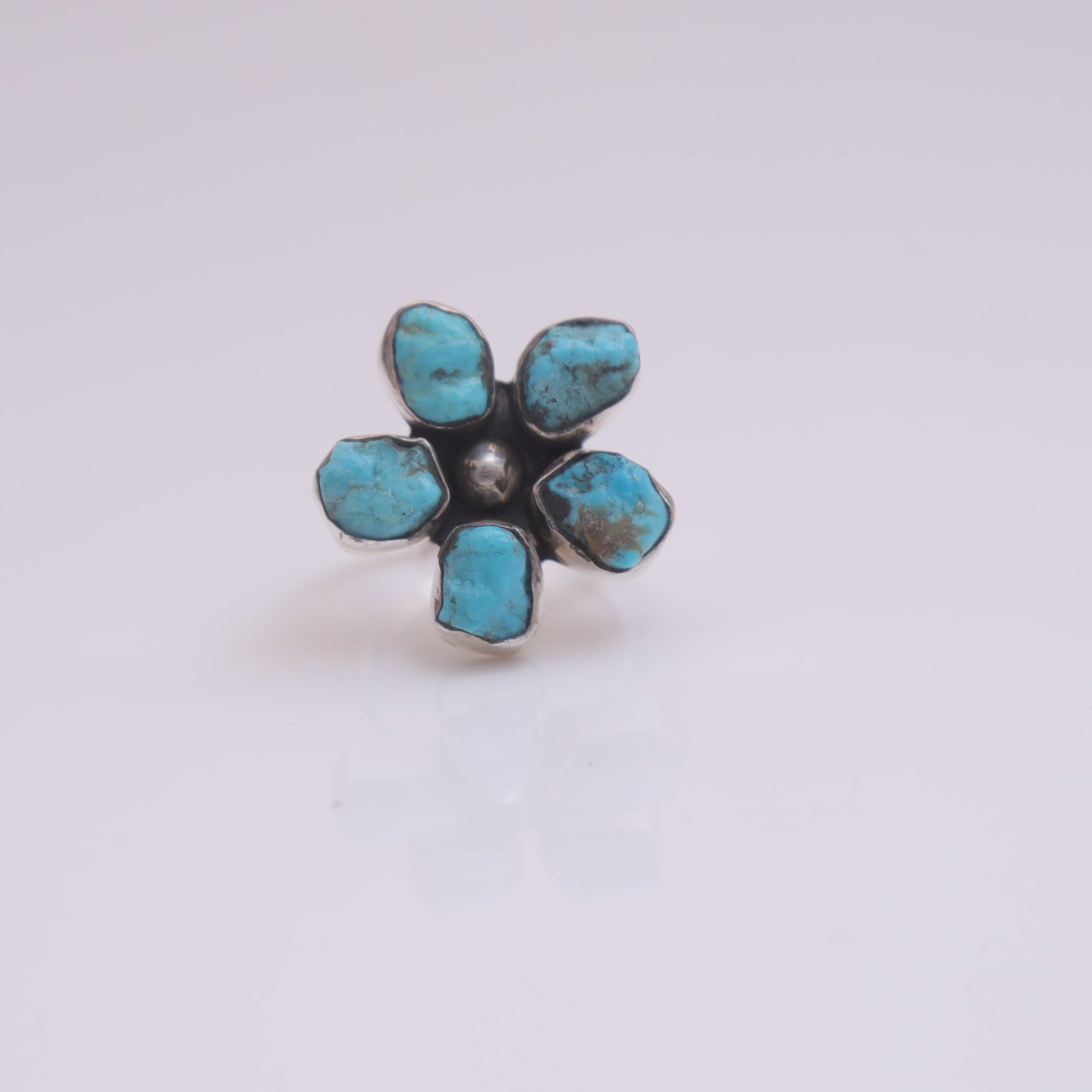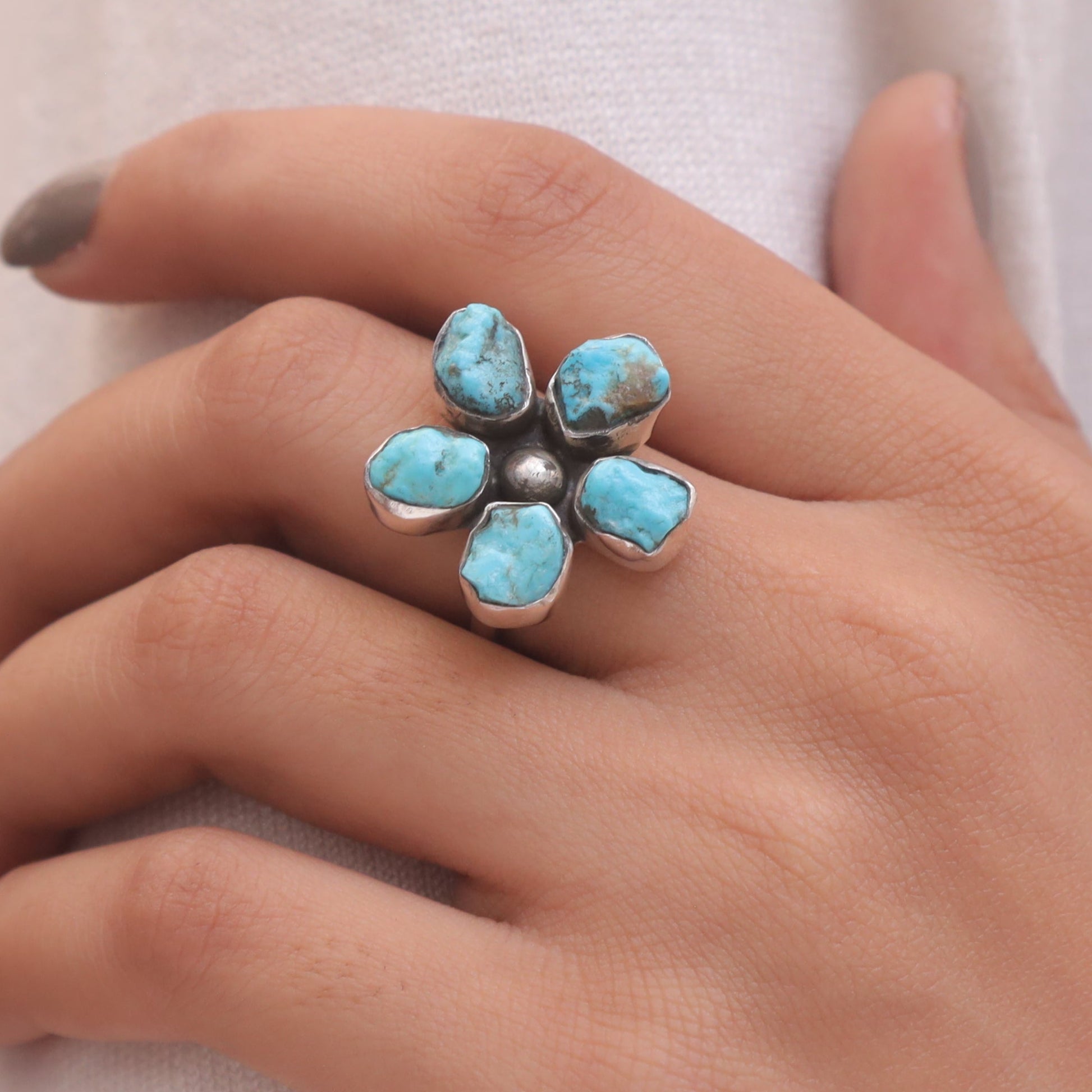Each detail of the ring showcases expert craftsmanship, from the precisely set prongs securing the Arizona Turquoise to the polished silver band ensuring a comfortable fit. The design allows the Arizona Turquoise to shine as the focal point, making it a versatile accessory suitable for everyday wear or special occasions.