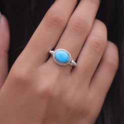 Each detail of the ring showcases expert craftsmanship, from the precisely set prongs securing the Arizona Turquoise to the polished silver band ensuring a comfortable fit. The design allows the Arizona Turquoise to shine as the focal point, making it a versatile accessory suitable for everyday wear or special occasions.