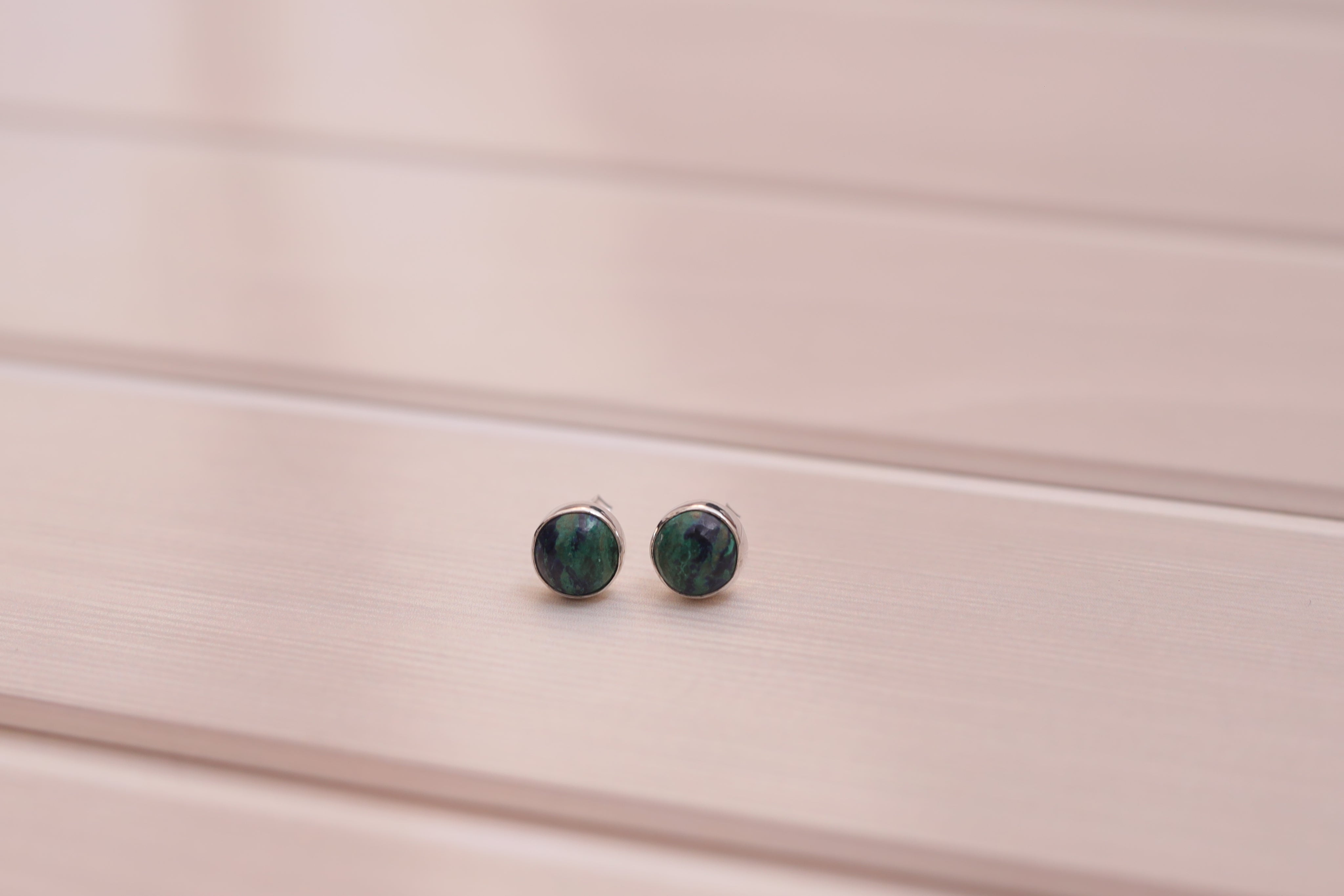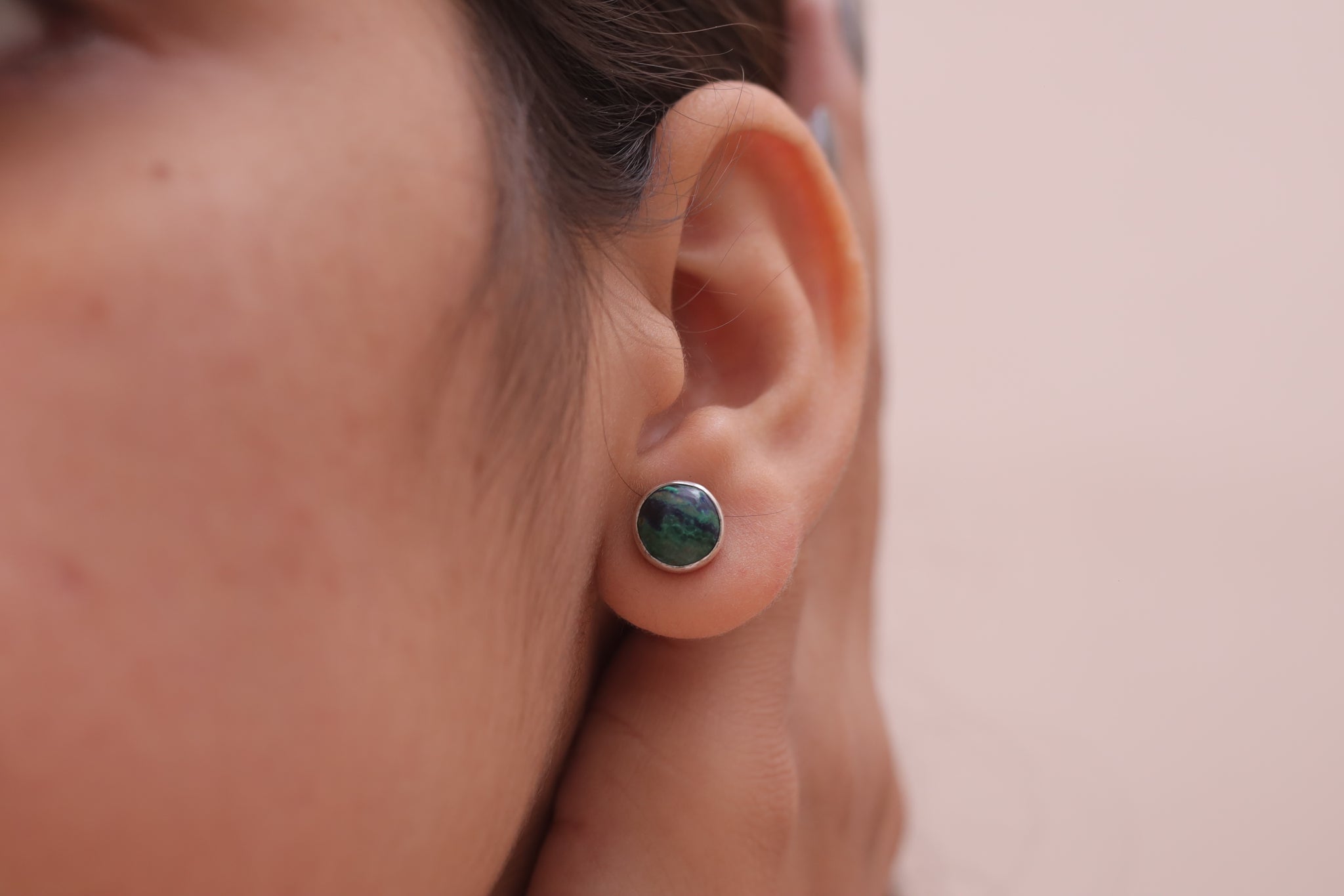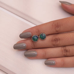 Elevate your style with the Azurite Malachite Sterling Silver Studs, a masterpiece that blends natural beauty with refined craftsmanship. The Studs features a radiant azurite malachite centerpiece, carefully cut to enhance its inherent allure and brilliance. Set in a band crafted from 925 sterling silver, it offers durability and a lasting shine that complements the gemstone's vibrant hue.