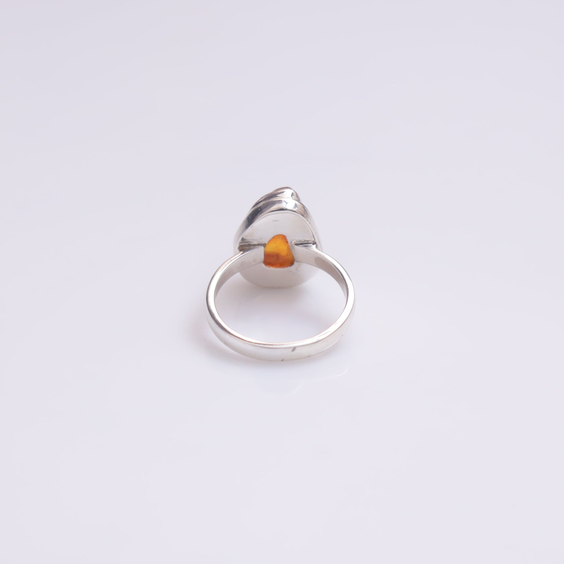 Each detail of the ring showcases expert craftsmanship, from the precisely set prongs securing the Baltic Amber to the polished silver band ensuring a comfortable fit. The design allows the Baltic Amber to shine as the focal point, making it a versatile accessory suitable for everyday wear or special occasions.