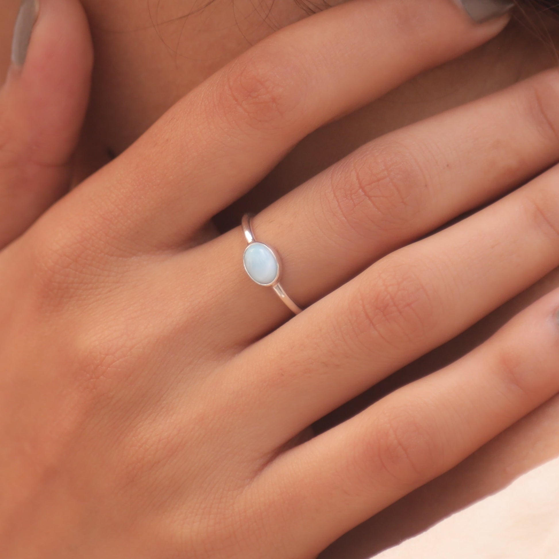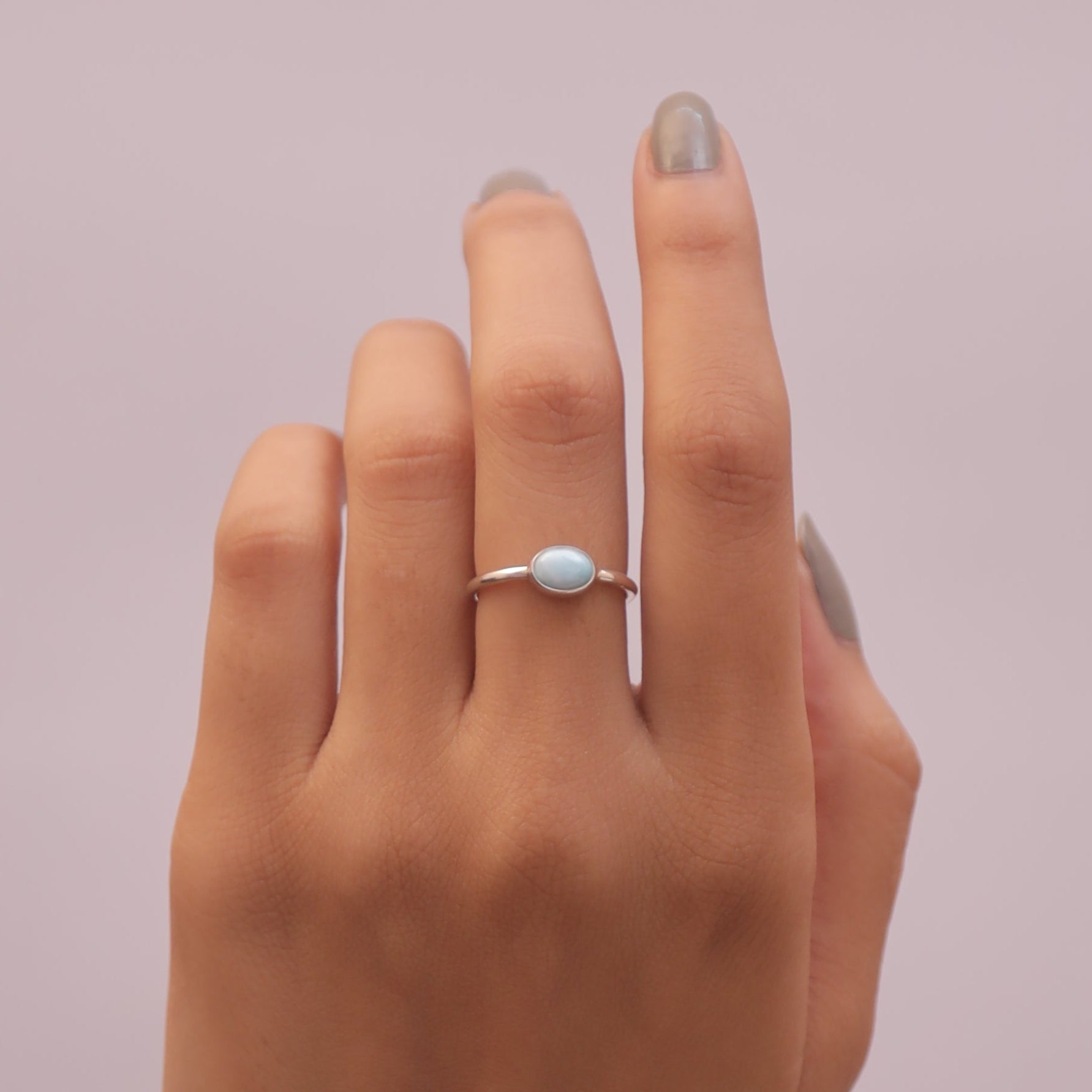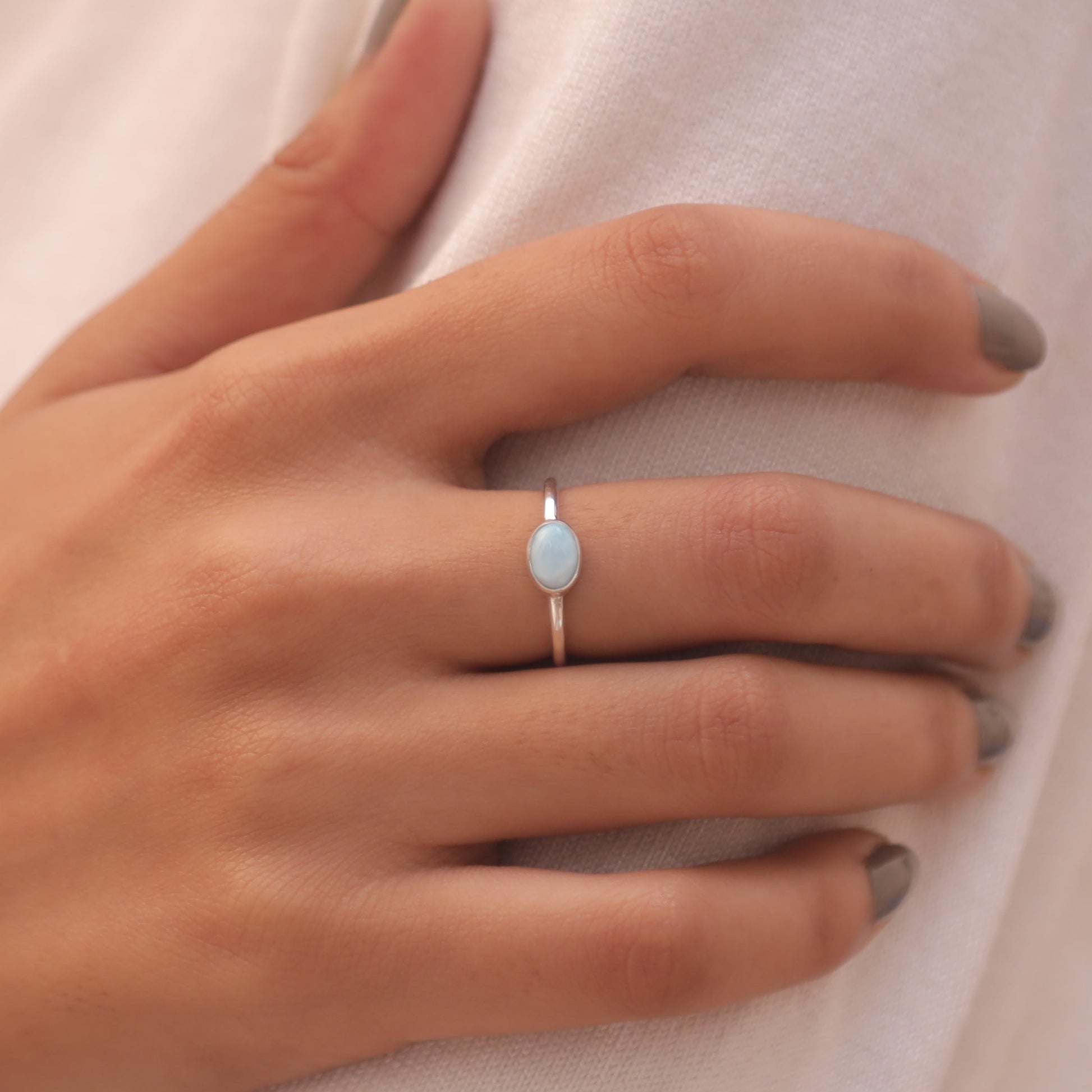 Elevate your style with the Larimar Ring, a masterpiece that blends natural beauty with refined craftsmanship. The ring features a radiant Larimar centerpiece, carefully cut to enhance its inherent allure and brilliance. Set in a band crafted from 925 sterling silver, it offers durability and a lasting shine that complements the gemstone's vibrant hue.