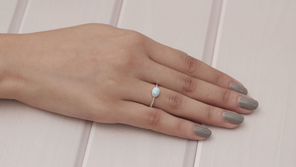 Each detail of the ring showcases expert craftsmanship, from the precisely set prongs securing the Larimar to the polished silver band ensuring a comfortable fit. The design allows the Larimar to shine as the focal point, making it a versatile accessory suitable for everyday wear or special occasions.