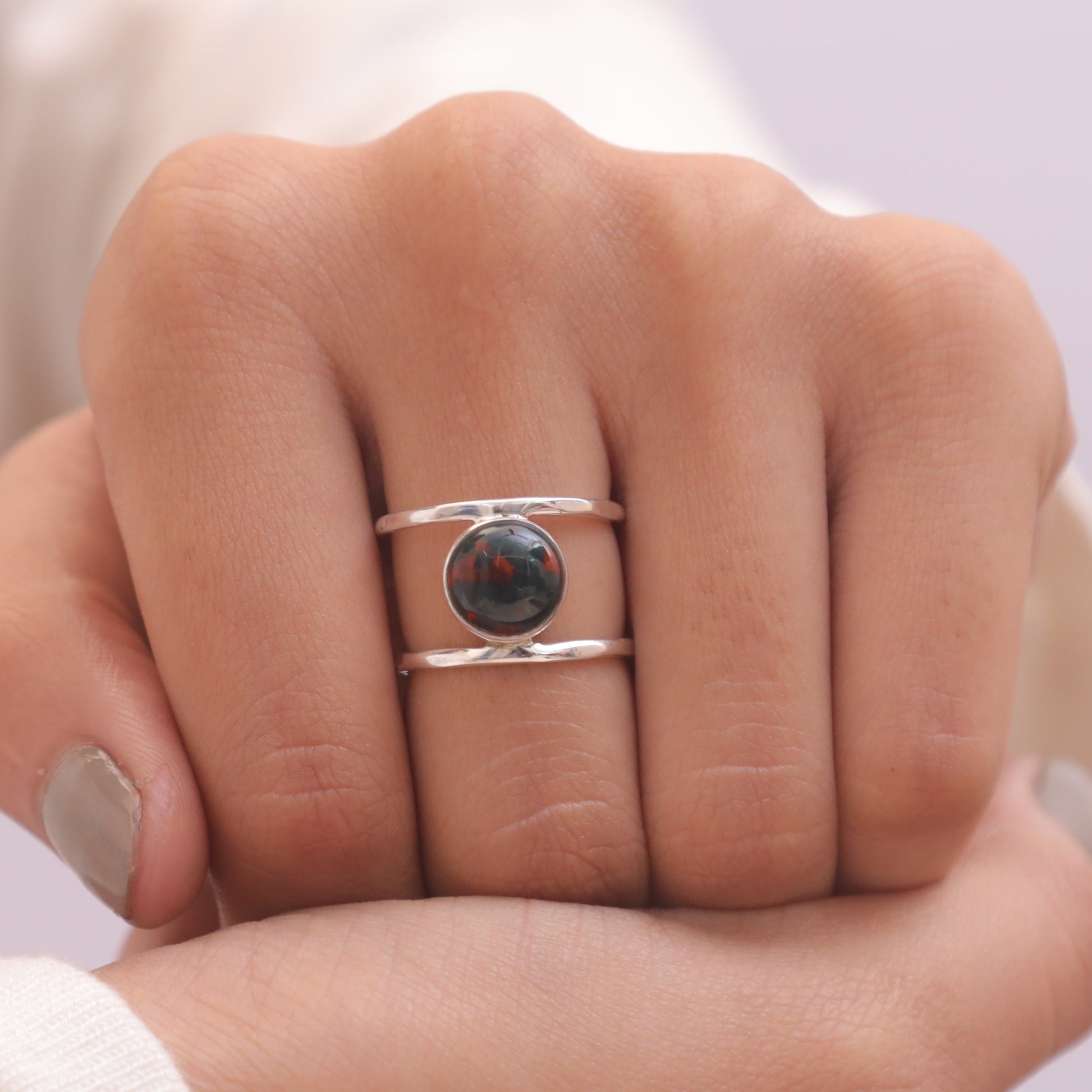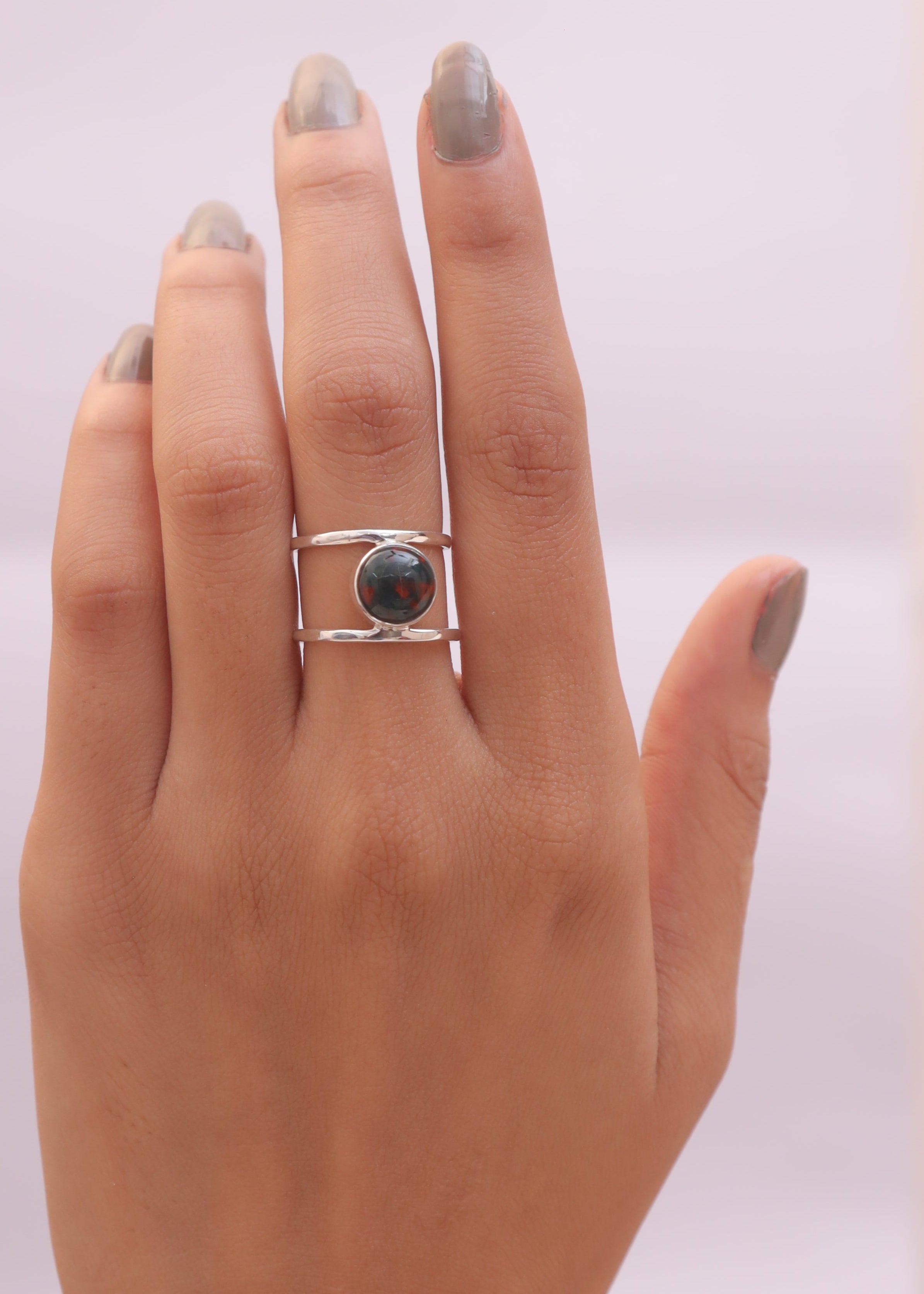 Each detail of the ring showcases expert craftsmanship, from the precisely set prongs securing the Bloodstone to the polished silver band ensuring a comfortable fit. The design allows the Bloodstone to shine as the focal point, making it a versatile accessory suitable for everyday wear or special occasions.