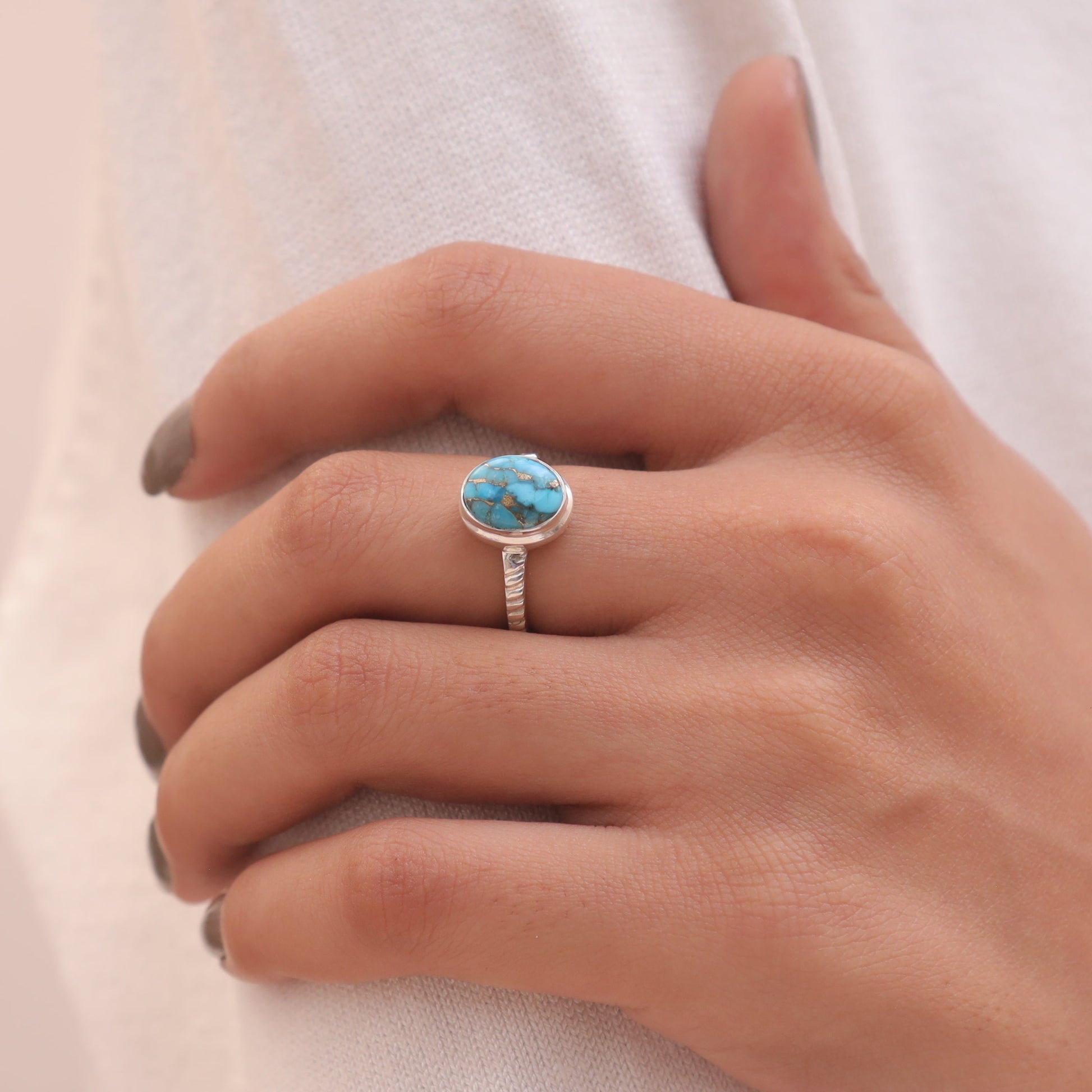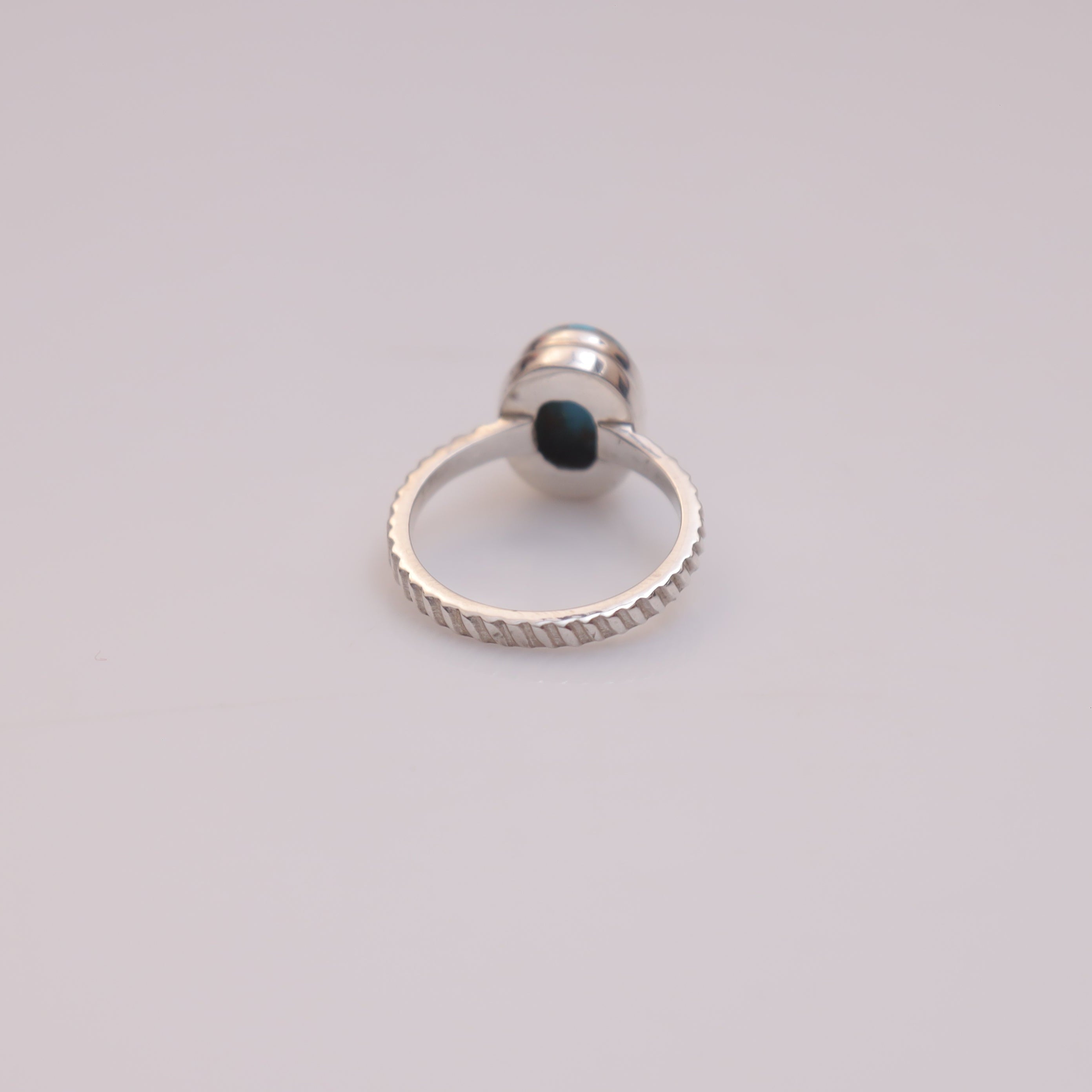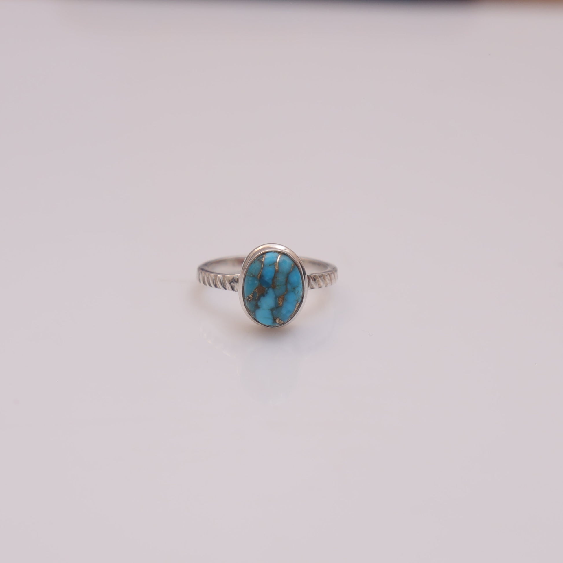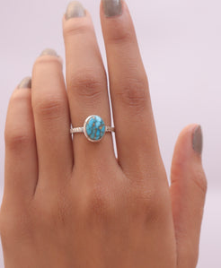 Each detail of the ring showcases expert craftsmanship, from the precisely set prongs securing the Blue Copper Turquoise to the polished silver band ensuring a comfortable fit. The design allows the Blue Copper Turquoise to shine as the focal point, making it a versatile accessory suitable for everyday wear or special occasions.