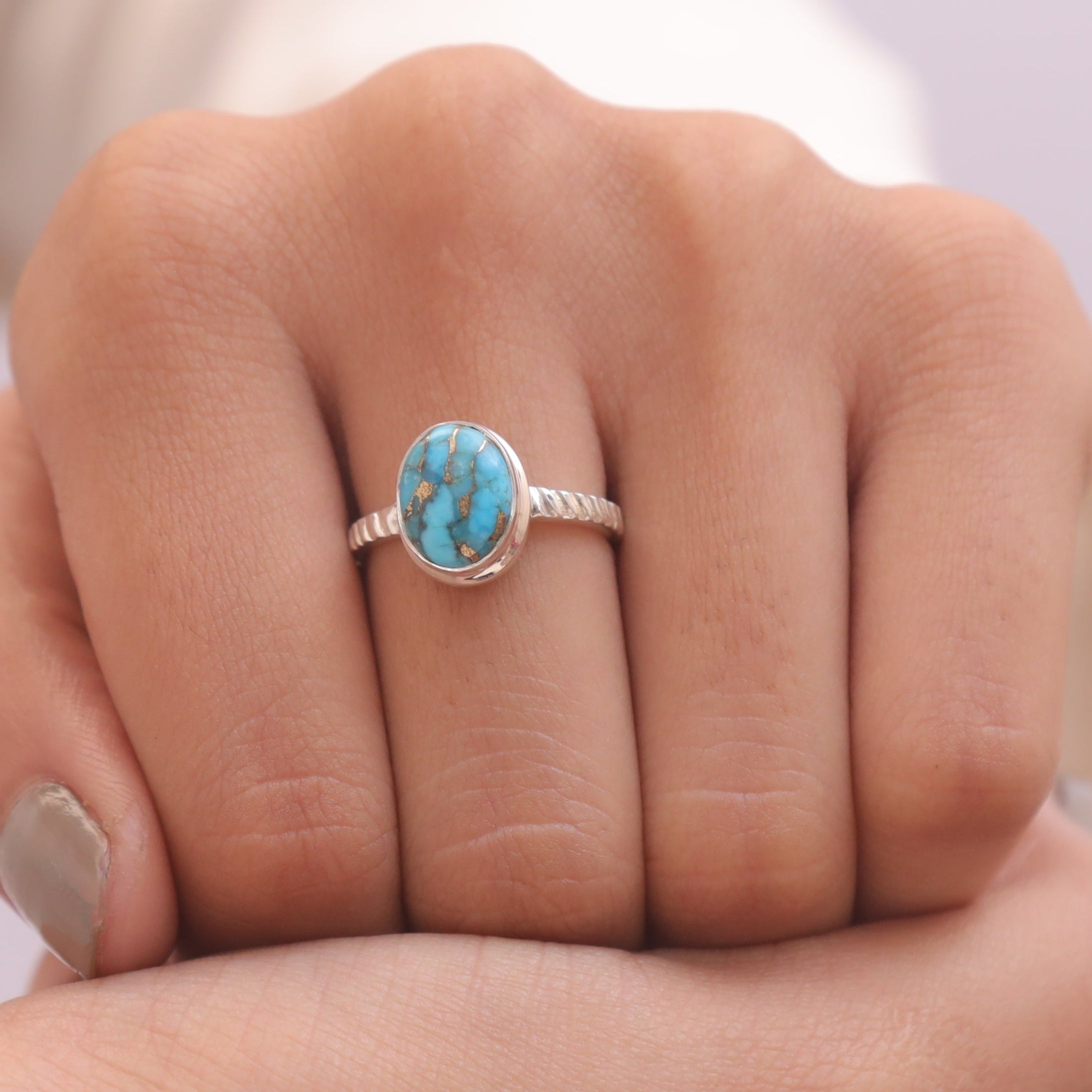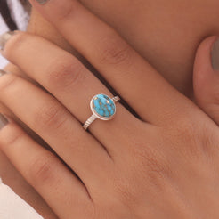 Elevate your style with the Blue Copper Turquoise Ring, a masterpiece that blends natural beauty with refined craftsmanship. The ring features a radiant Blue Copper Turquoise centrepiece, carefully cut to enhance its inherent allure and brilliance. Set in a band crafted from 925 sterling silver, it offers durability and a lasting shine that complements the gemstone's vibrant hue.