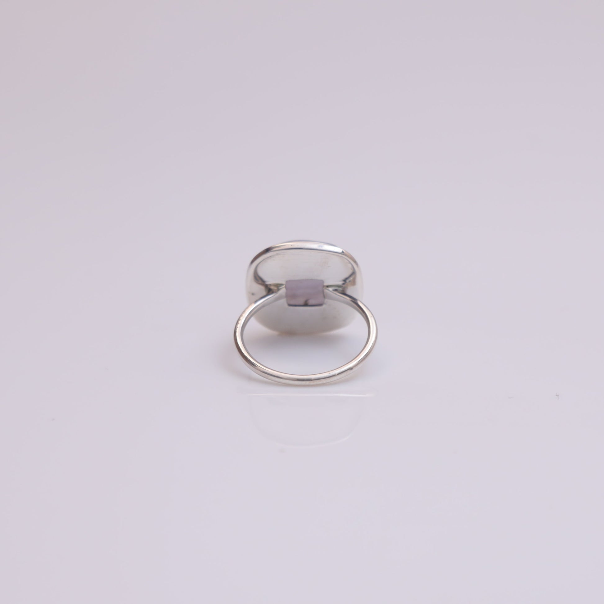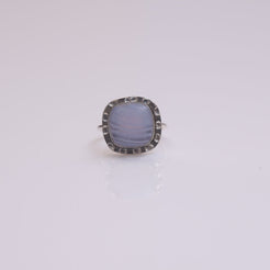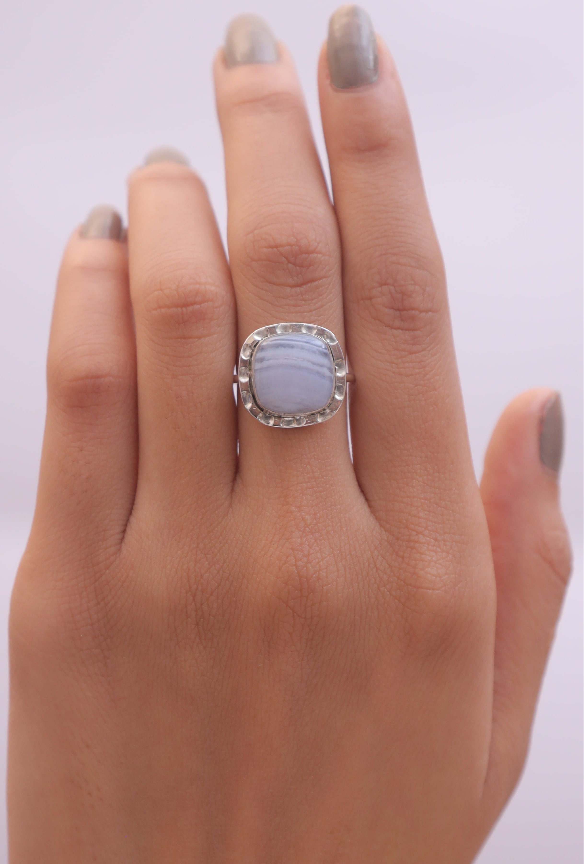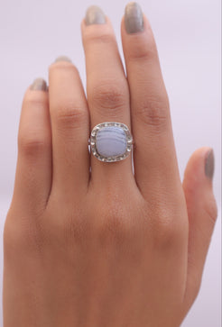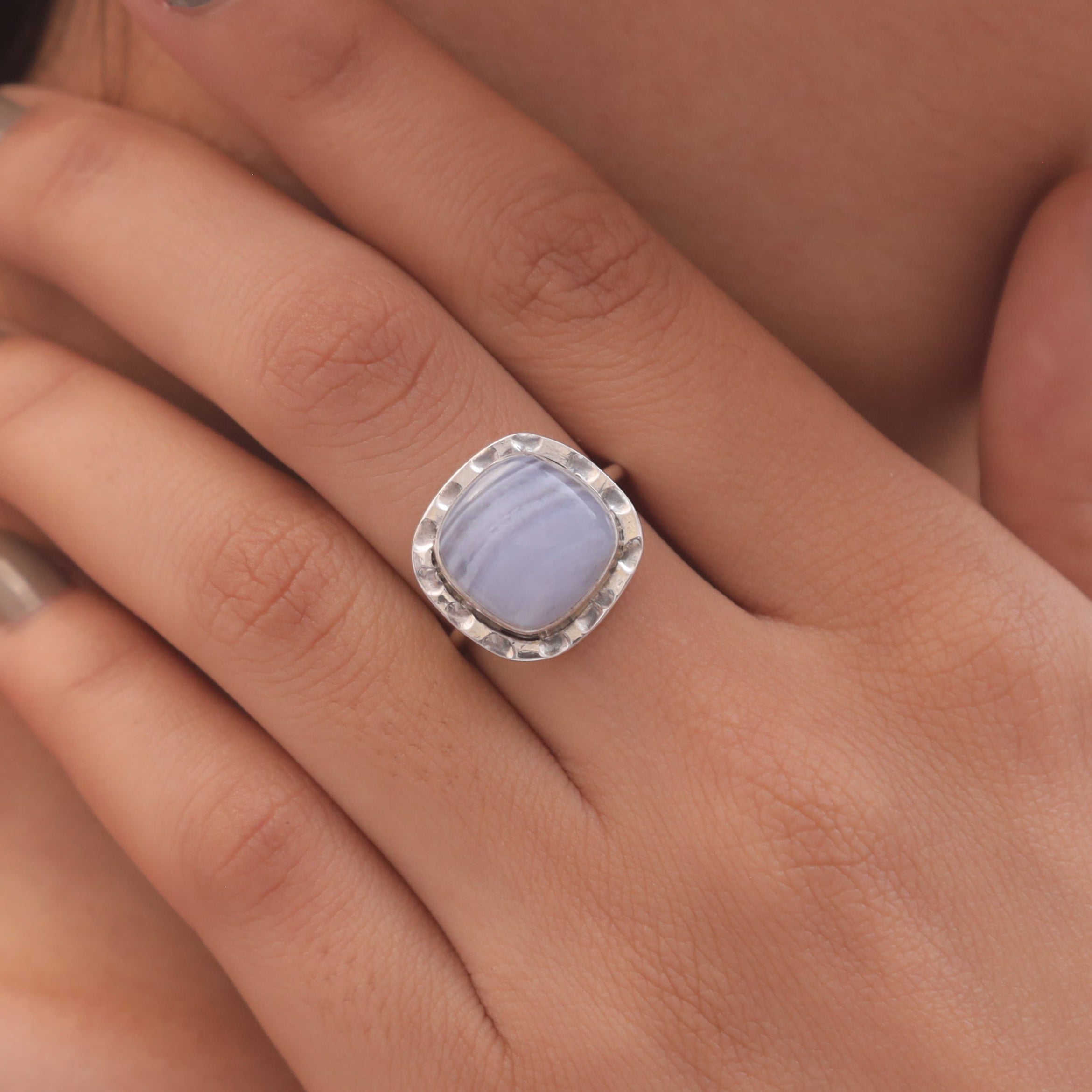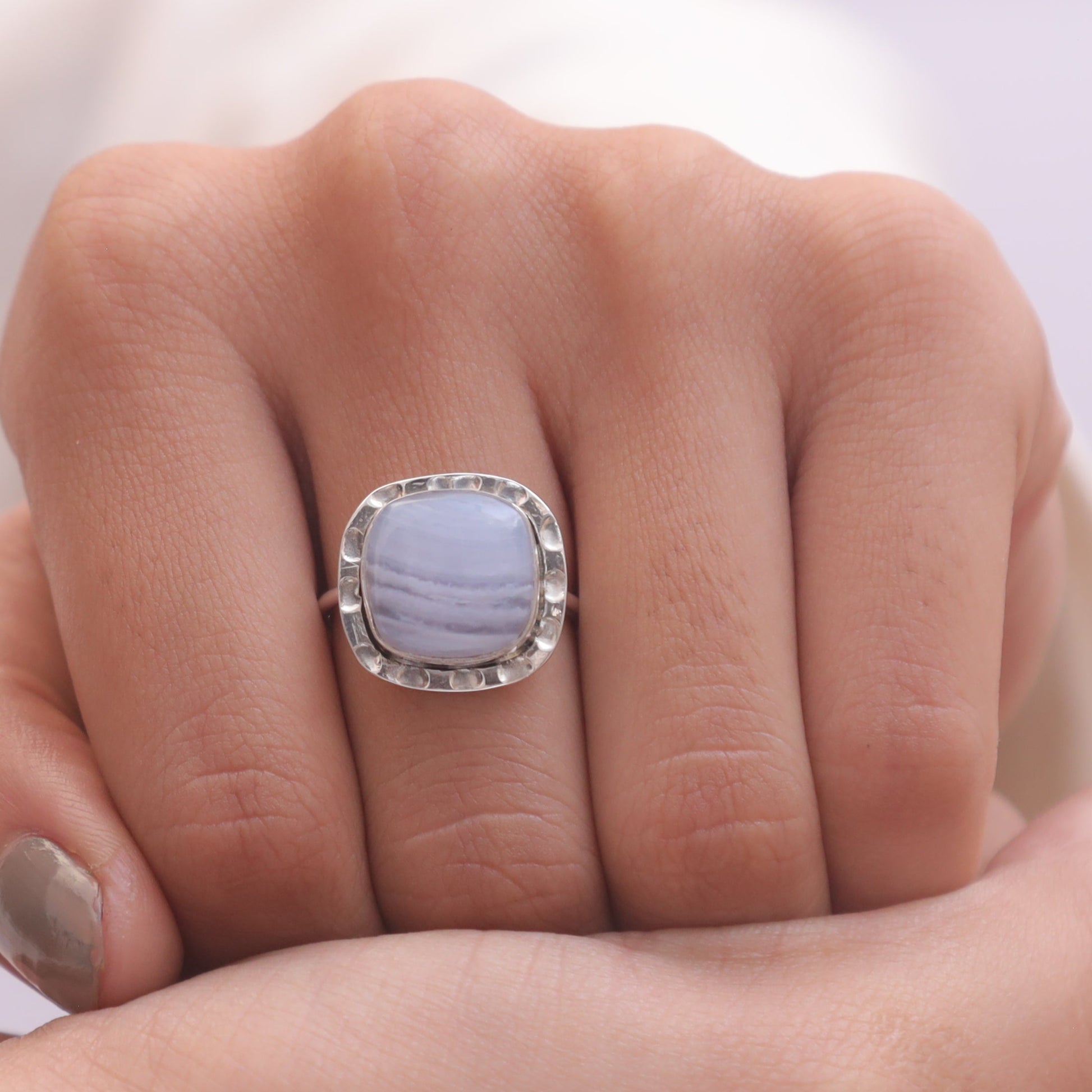 Each detail of the ring showcases expert craftsmanship, from the precisely set prongs securing the Blue Lace Agate to the polished silver band ensuring a comfortable fit. The design allows the Blue Lace Agate to shine as the focal point, making it a versatile accessory suitable for everyday wear or special occasions.