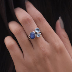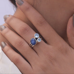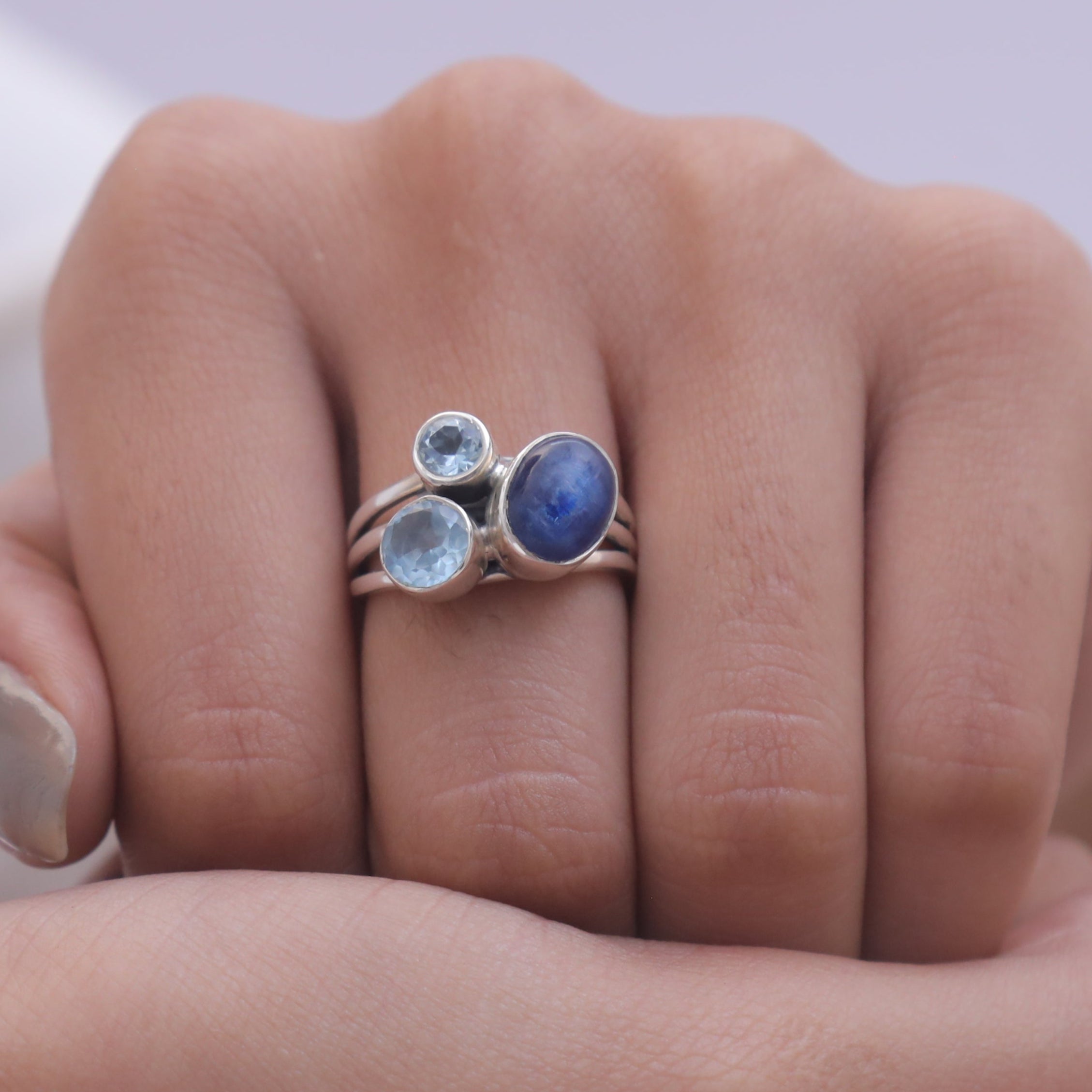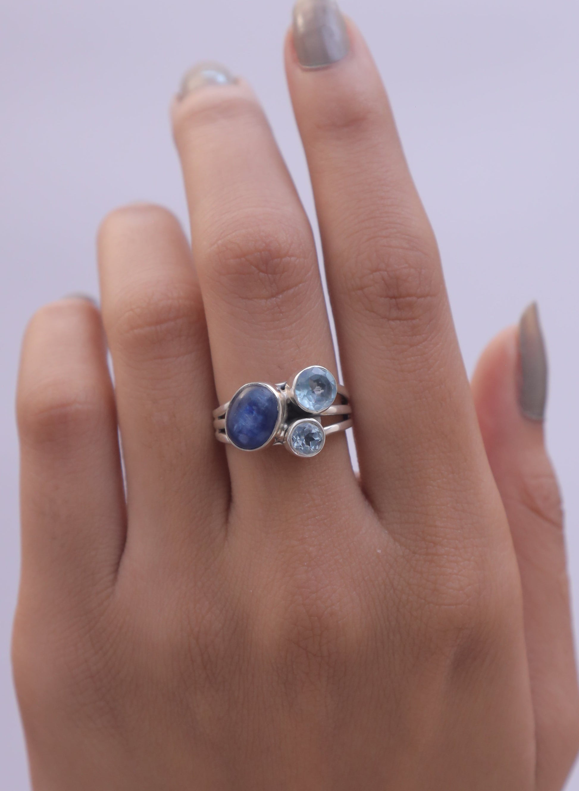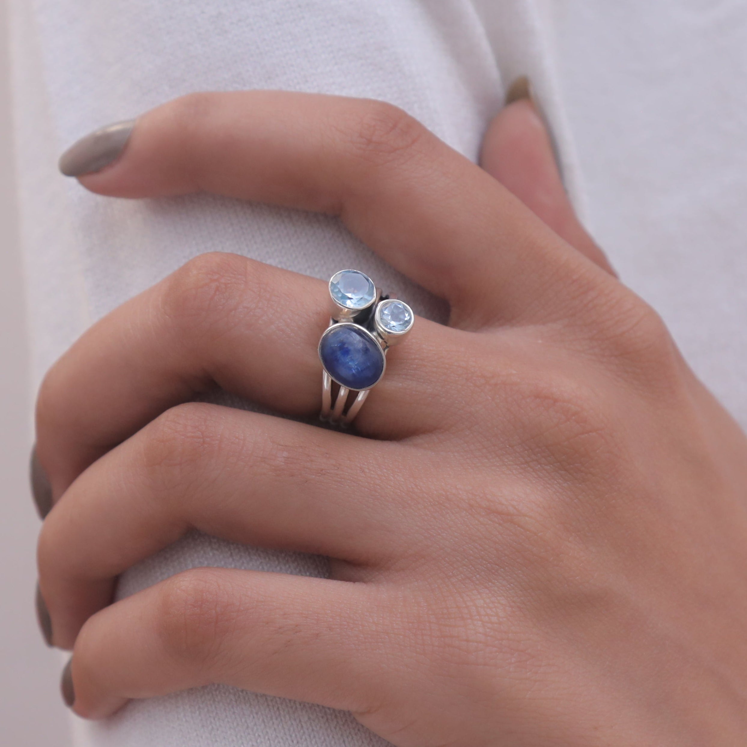 Each detail of the ring showcases expert craftsmanship, from the precisely set prongs securing the Blue Topaz & Kyanite to the polished silver band ensuring a comfortable fit. The design allows the Blue Topaz & Kyanite to shine as the focal point, making it a versatile accessory suitable for everyday wear or special occasions.