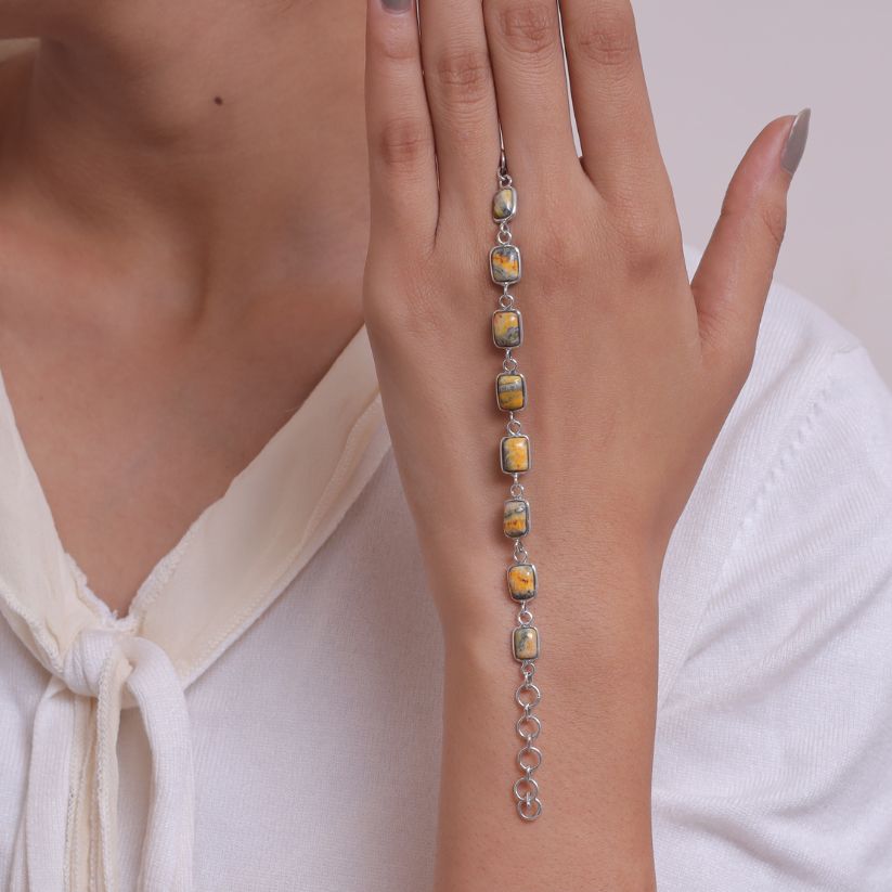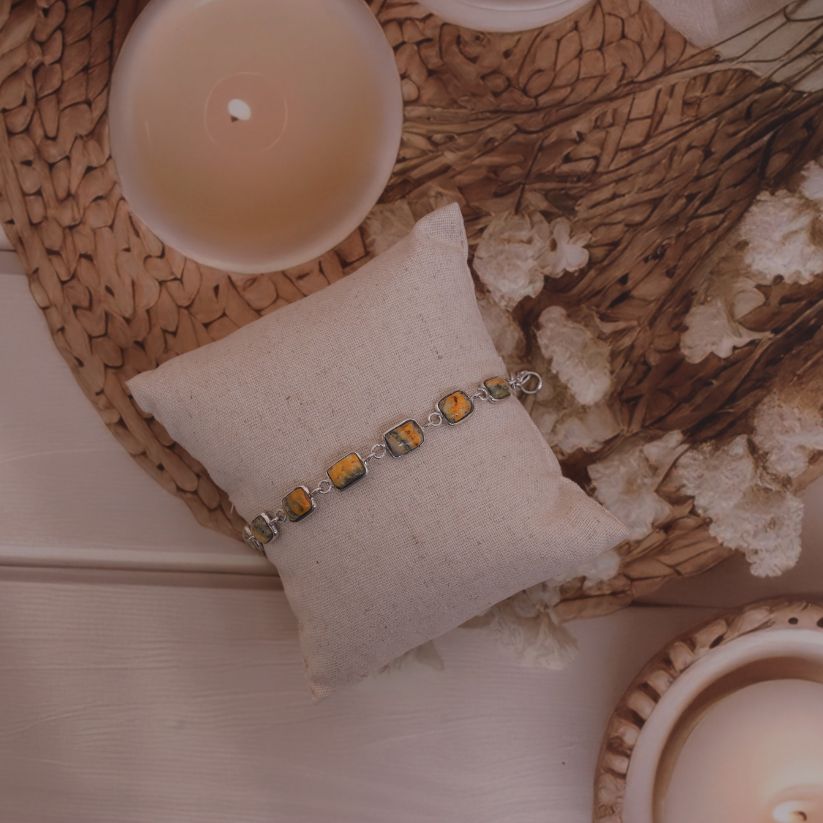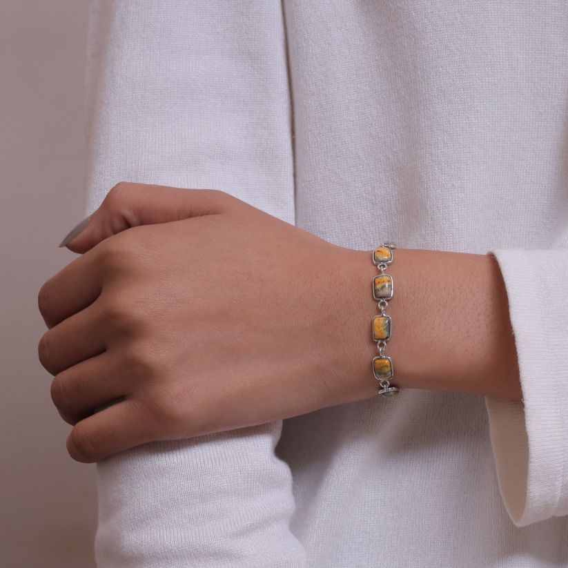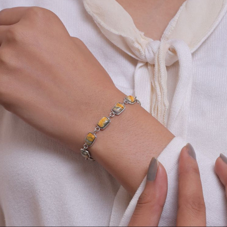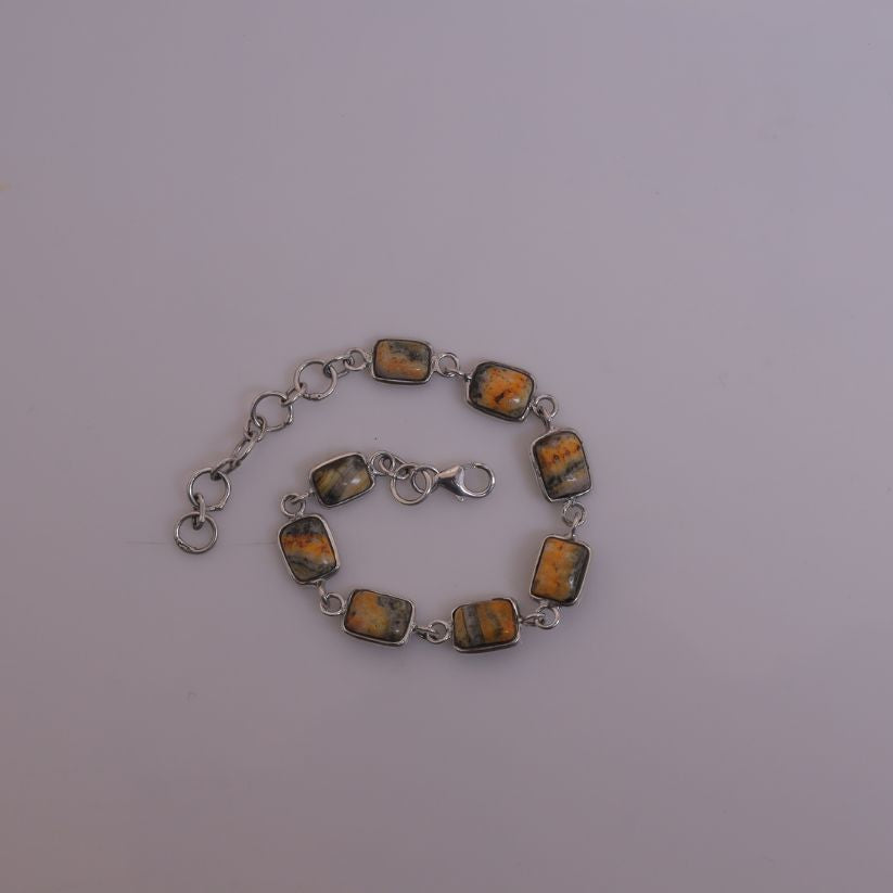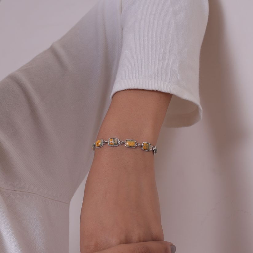 Elevate your style with the Bumble Bee Jasper Bracelet, a masterpiece that blends natural beauty with refined craftsmanship. The bracelet features a radiant Bumble Bee Jasper centerpiece, carefully cut to enhance its inherent allure and brilliance. Set in a band crafted from 925 sterling silver, it offers durability and a lasting shine that complements the gemstone's vibrant hues.