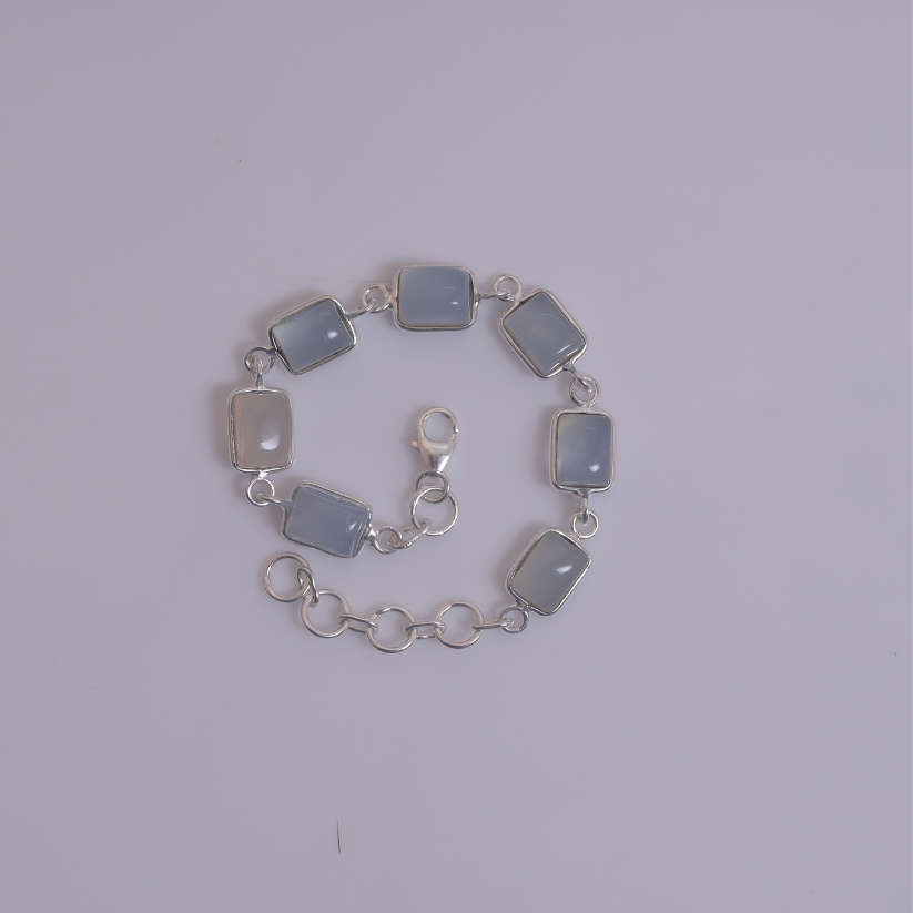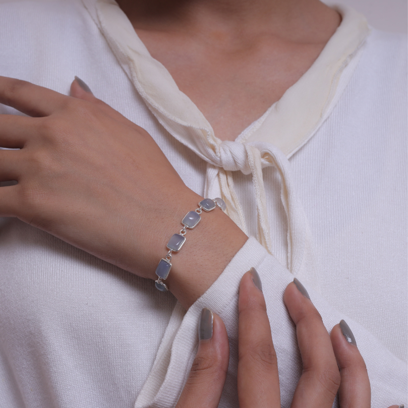 Elevate your style with the Chalcedony Bracelet, a masterpiece that blends natural beauty with refined craftsmanship. The bracelet features a radiant Chalcedony centerpiece, carefully cut to enhance its inherent allure and brilliance. Set in a band crafted from 925 sterling silver, it offers durability and a lasting shine that complements the gemstone's vibrant hue.