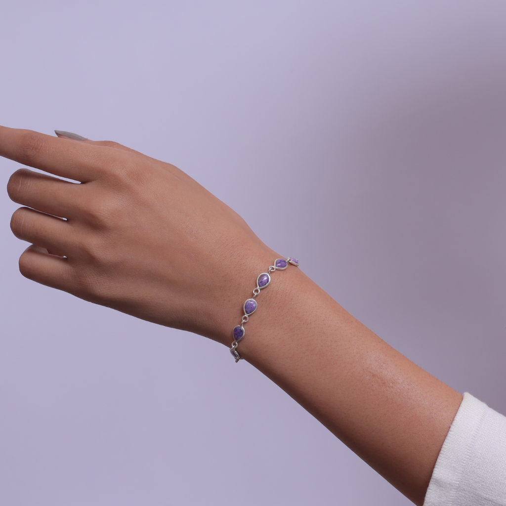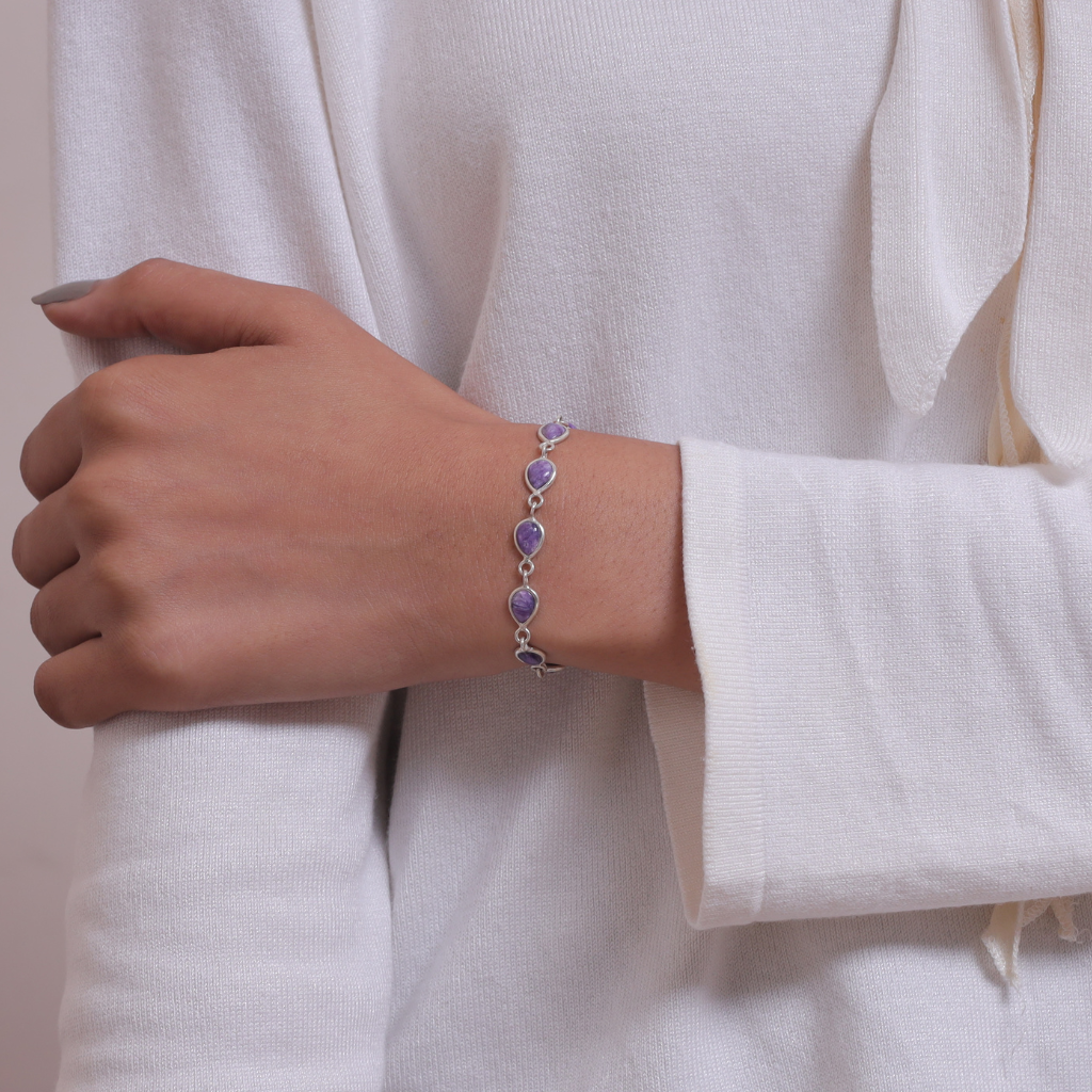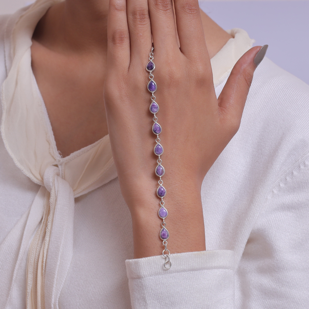 Elevate your style with the Charoite Bracelet, a masterpiece that blends natural beauty with refined craftsmanship. The bracelet features a radiant Charoite centerpiece, carefully cut to enhance its inherent allure and brilliance. Set in a band crafted from 925 sterling silver, it offers durability and a lasting shine that complements the gemstone's vibrant hue.