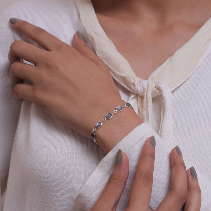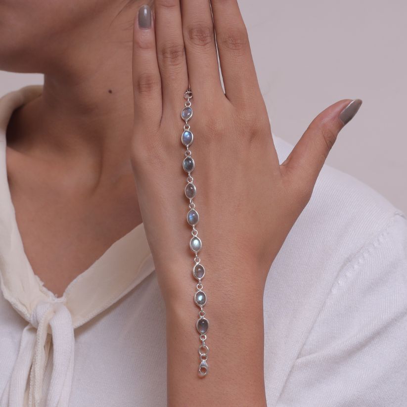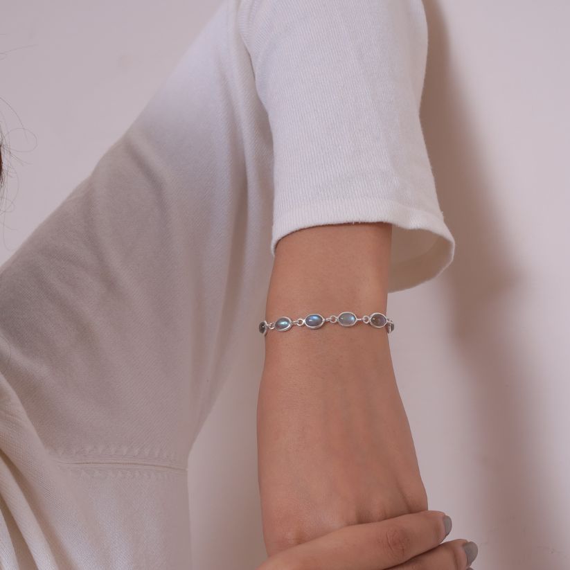 Elevate your style with the Labradorite Bracelet, a masterpiece that blends natural beauty with refined craftsmanship. The bracelet features a radiant Labradorite centerpiece, carefully cut to enhance its inherent allure and brilliance. Set in a band crafted from 925 sterling silver, it offers durability and a lasting shine that complements the gemstone's vibrant hue.