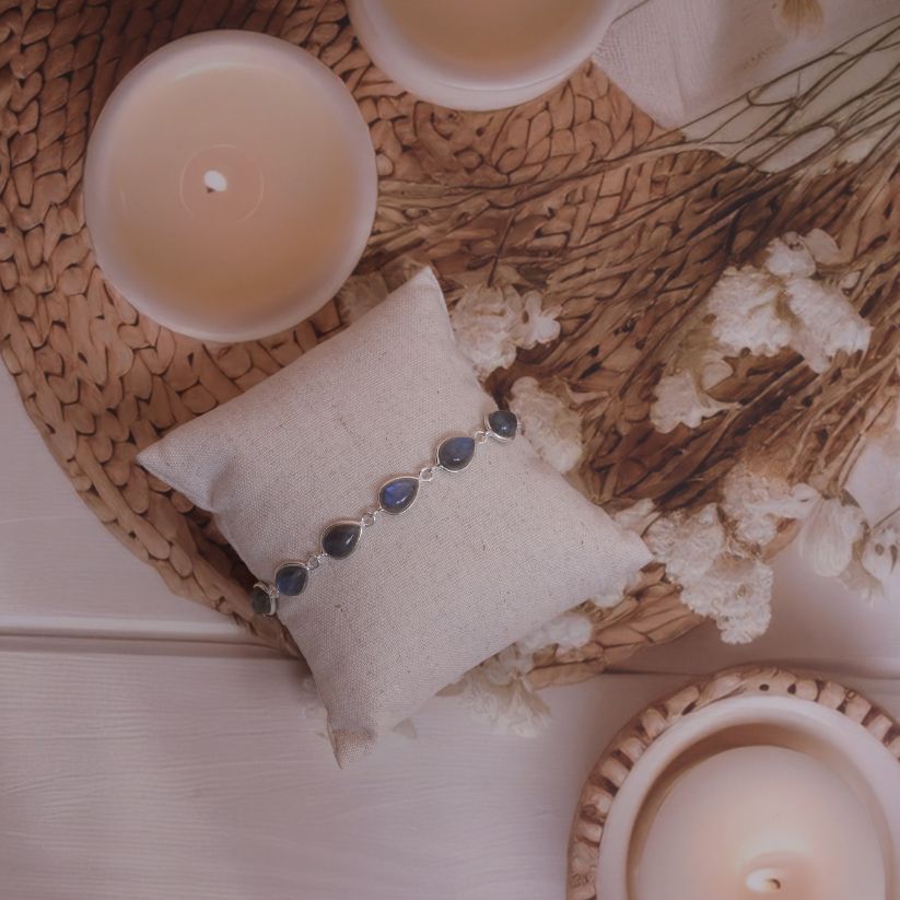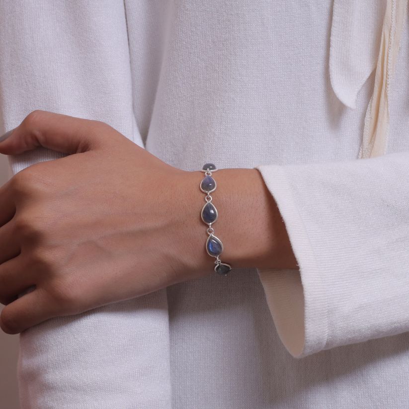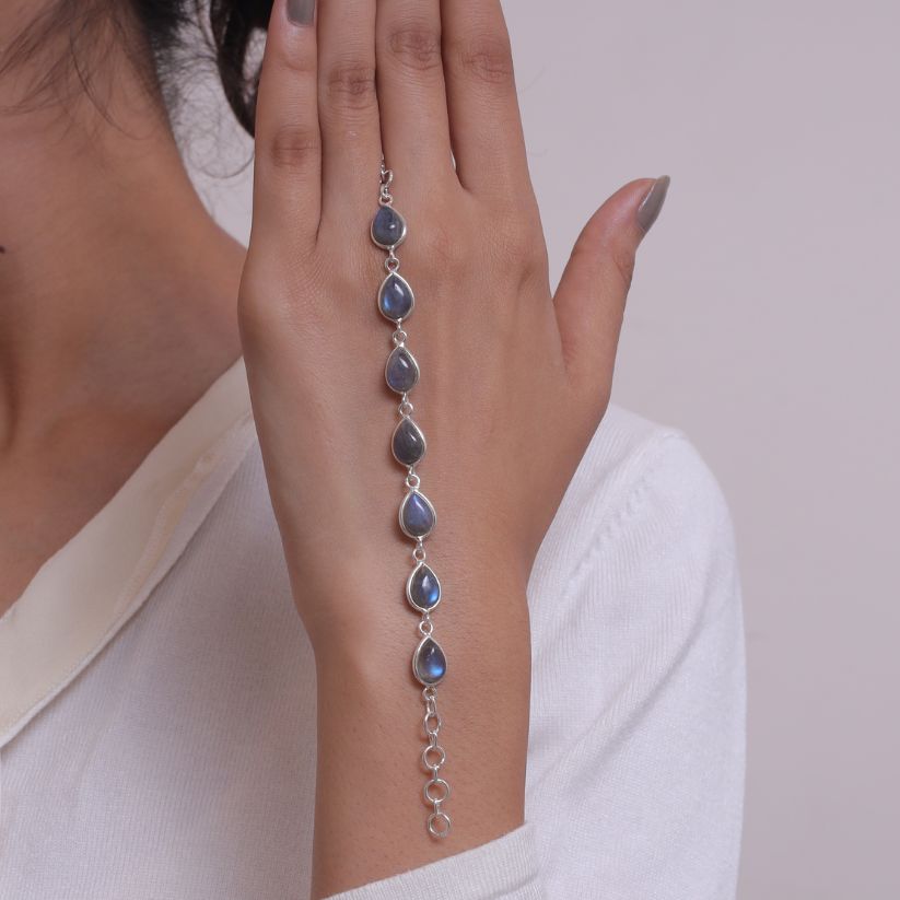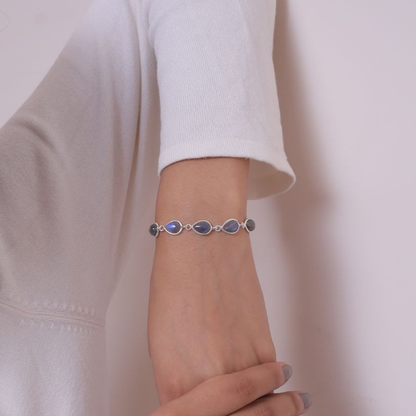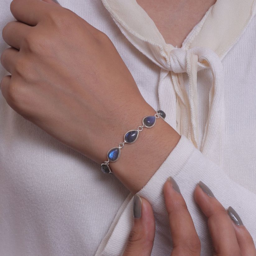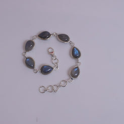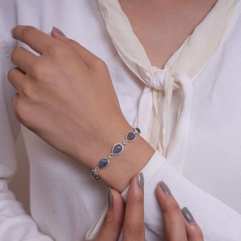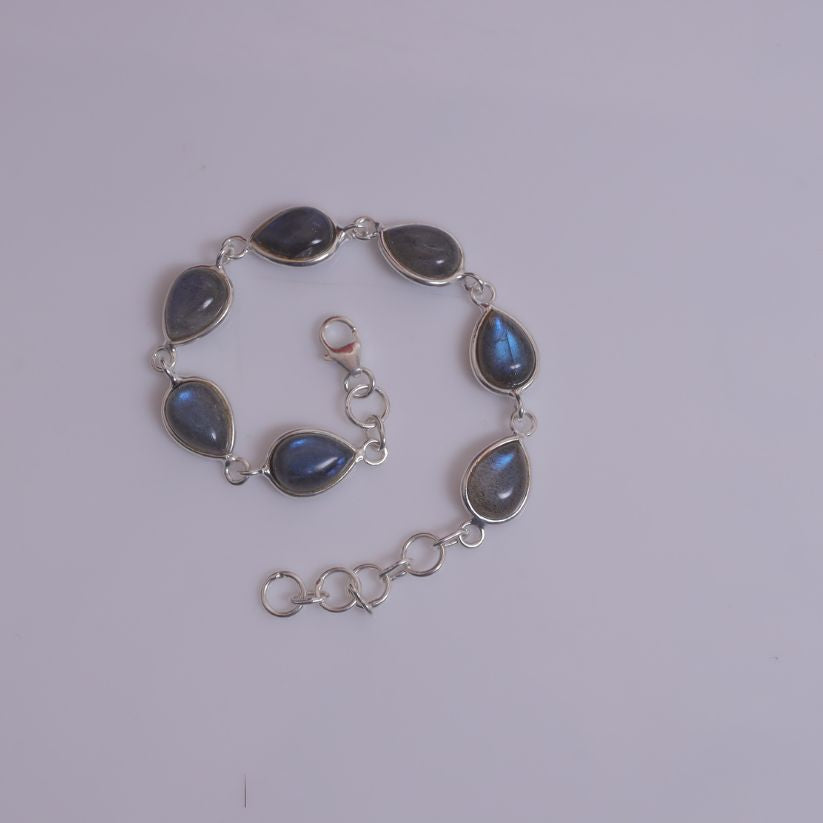 Elevate your style with the Labradorite Bracelet, a masterpiece that blends natural beauty with refined craftsmanship. The bracelet features a radiant Labradorite centerpiece, carefully cut to enhance its inherent allure and brilliance. Set in a band crafted from 925 sterling silver, it offers durability and a lasting shine that complements the gemstone's vibrant hue.