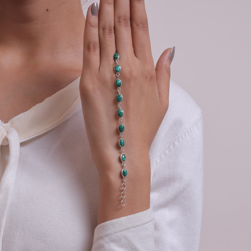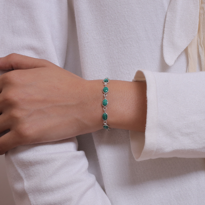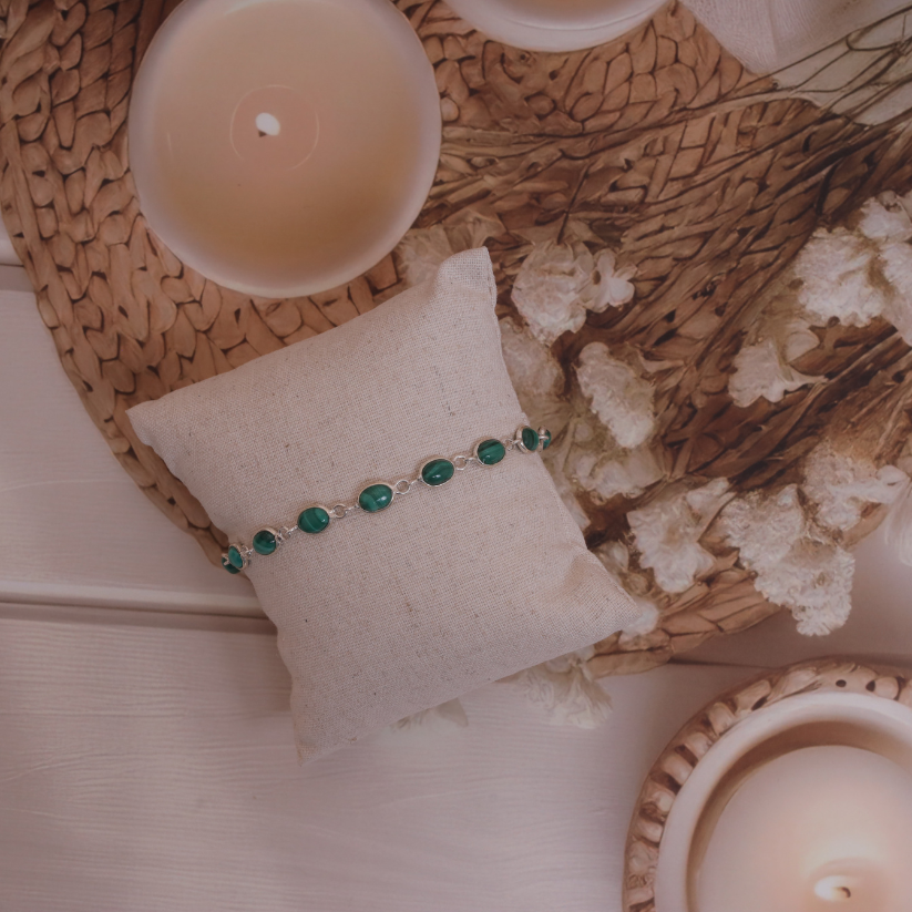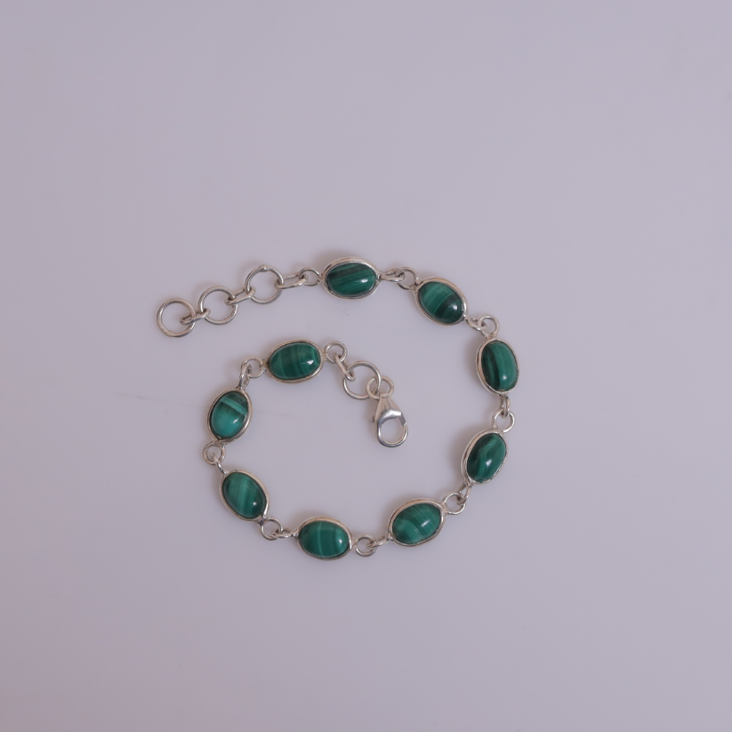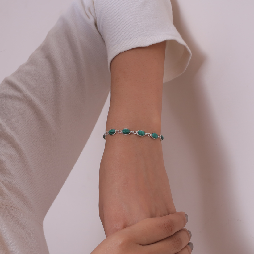 Elevate your style with the Malachite Bracelet, a masterpiece that blends natural beauty with refined craftsmanship. The bracelet features a radiant Malachite centerpiece, carefully cut to enhance its inherent allure and brilliance. Set in a band crafted from 925 sterling silver, it offers durability and a lasting shine that complements the gemstone’s unique blend of deep blues and rich greens.