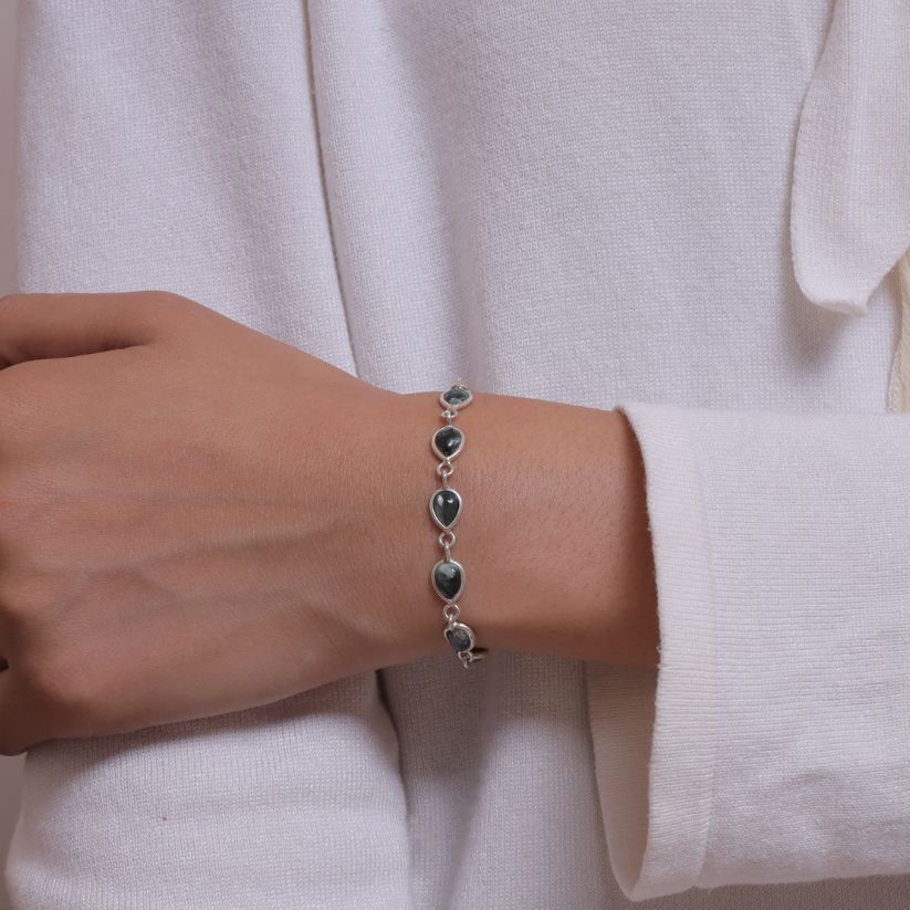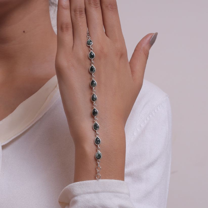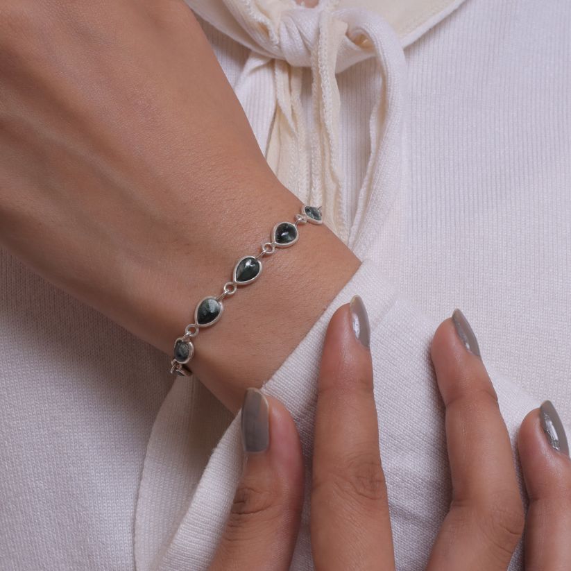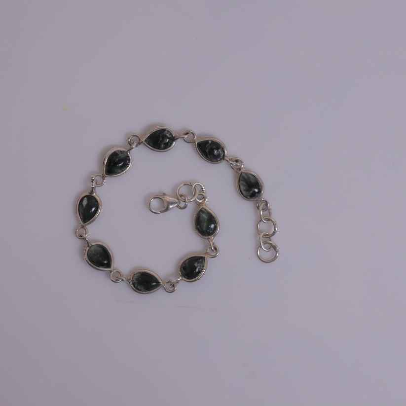 Elevate your style with the Seraphinite Bracelet, a masterpiece that blends natural beauty with refined craftsmanship. The bracelet features a radiant Seraphinite centerpiece, carefully cut to enhance its inherent allure and brilliance. Set in a band crafted from 925 sterling silver, it offers durability and a lasting shine that complements the gemstone's vibrant hue.
