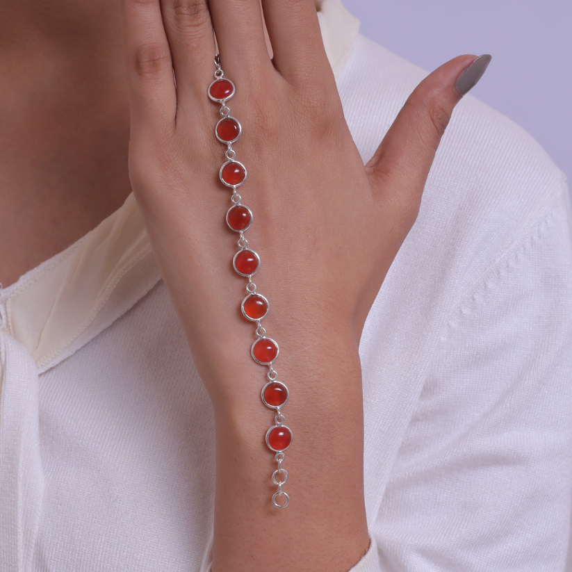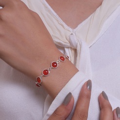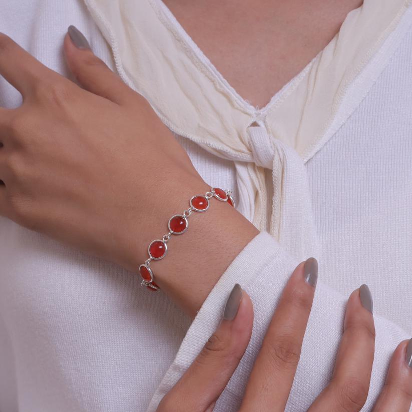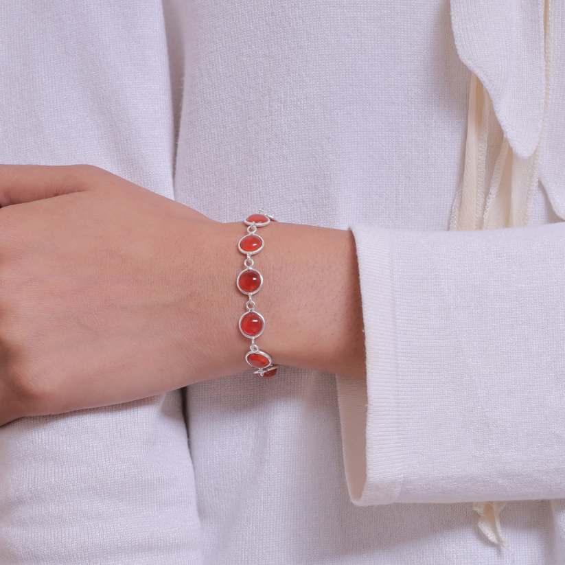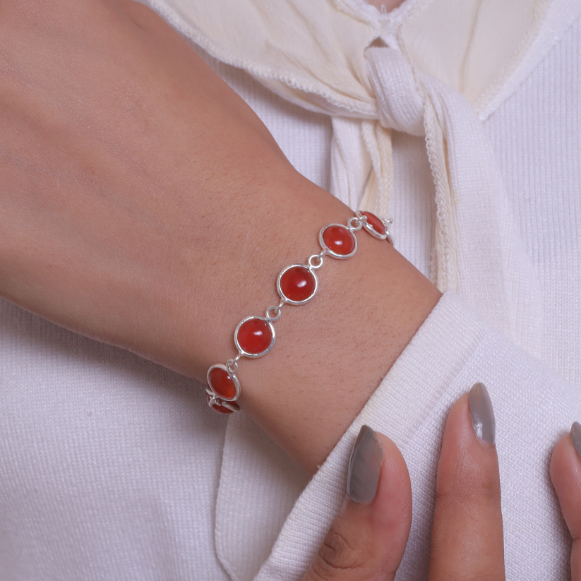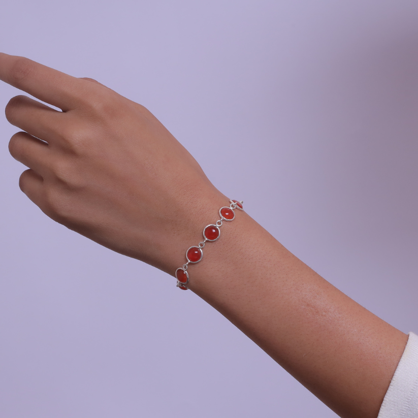 Elevate your style with the Carnelian Bracelet, a masterpiece that blends natural beauty with refined craftsmanship. The bracelet features a radiant Carnelian centerpiece, carefully cut to enhance its inherent allure and brilliance. Set in a band crafted from 925 sterling silver, it offers durability and a lasting shine that complements the gemstone’s warm orange-red hue.