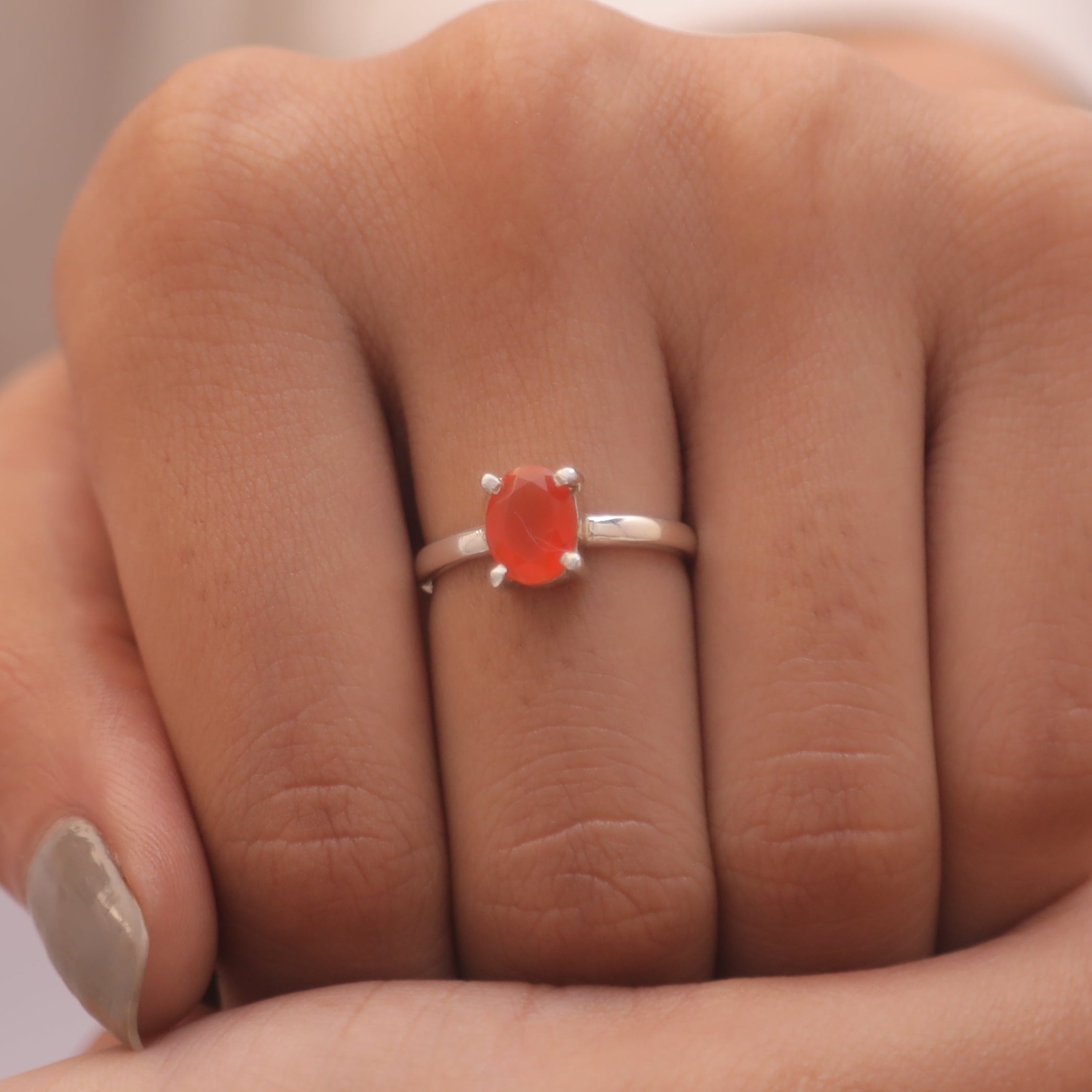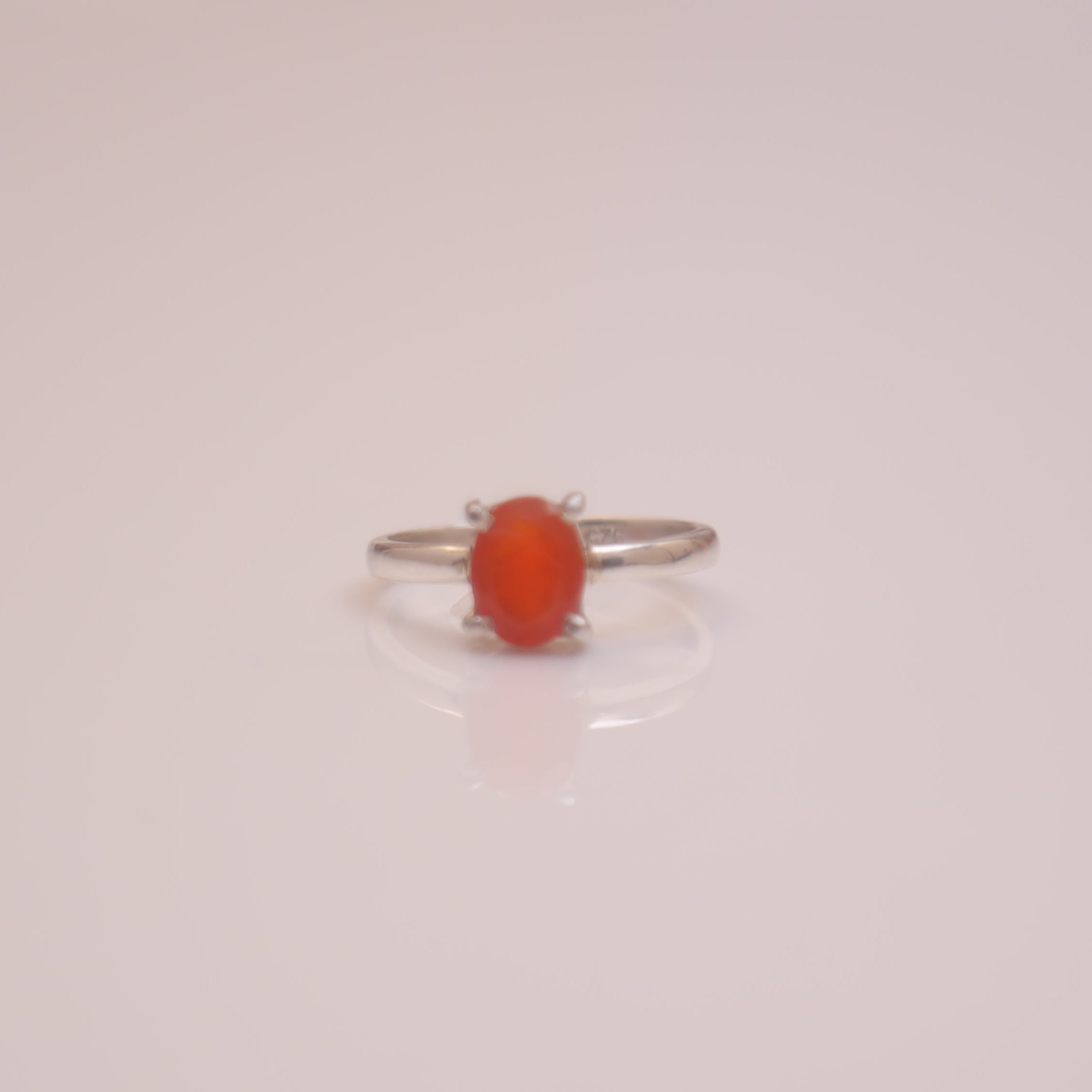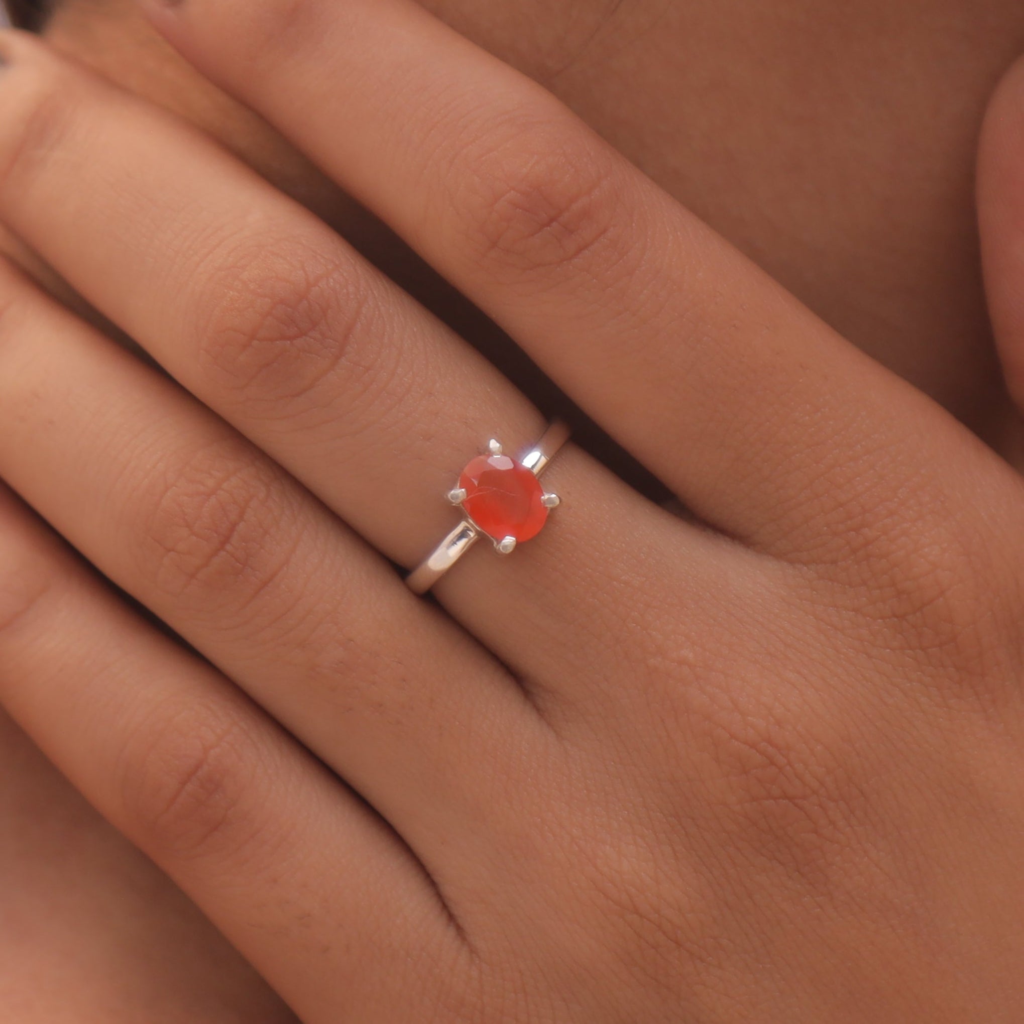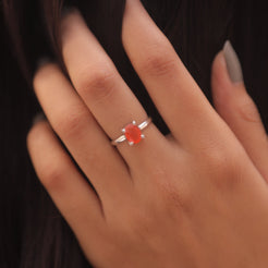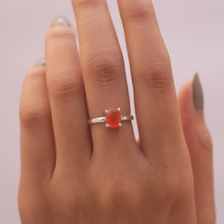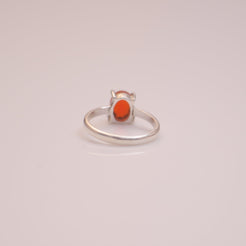Each detail of the ring showcases expert craftsmanship, from the precisely set prongs securing the Carnelian to the polished silver band ensuring a comfortable fit. The design allows the Carnelian to shine as the focal point, making it a versatile accessory suitable for everyday wear or special occasions.