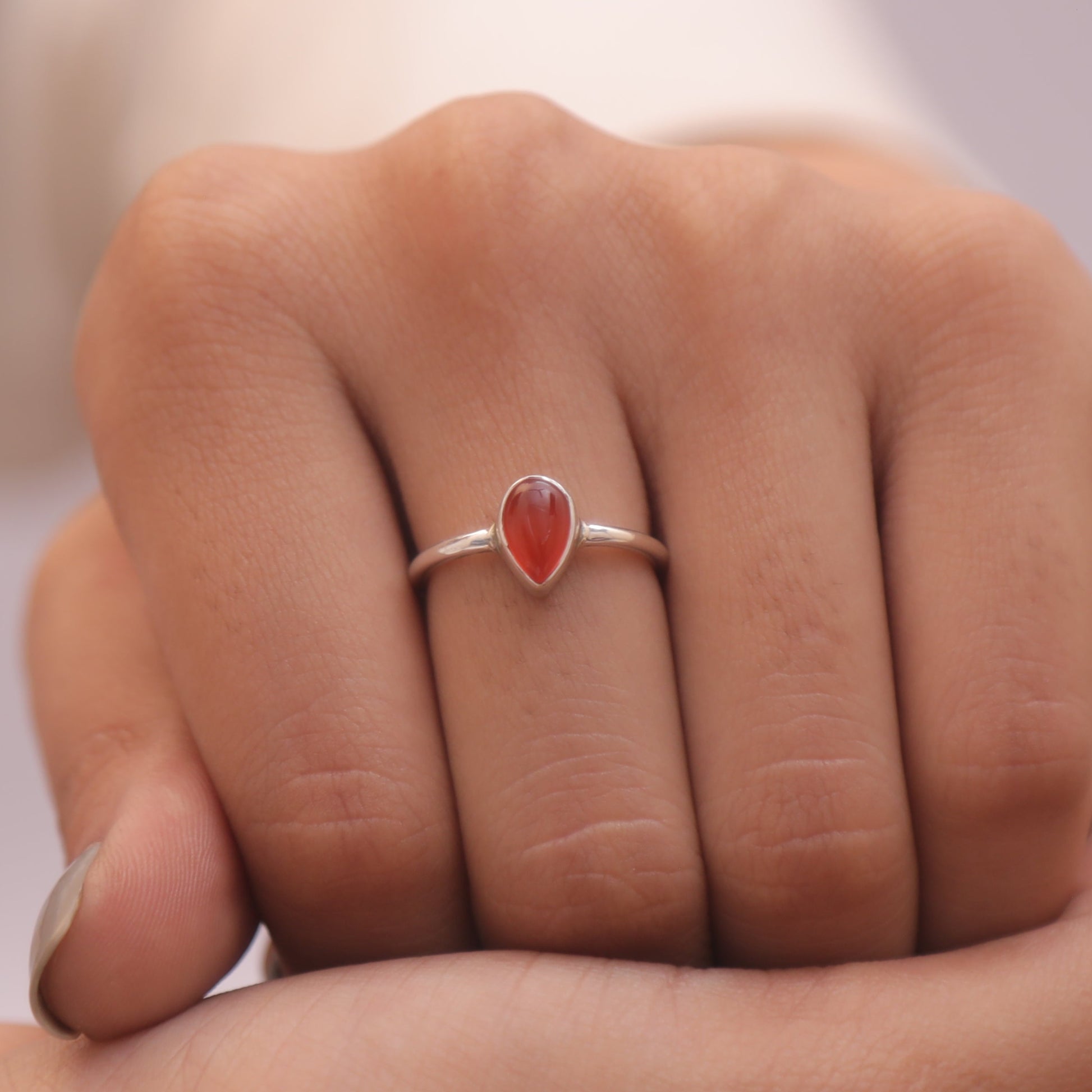 Each detail of the ring showcases expert craftsmanship, from the precisely set prongs securing the Carnelian to the polished silver band ensuring a comfortable fit. The design allows the Carnelian to shine as the focal point, making it a versatile accessory suitable for everyday wear or special occasions.
