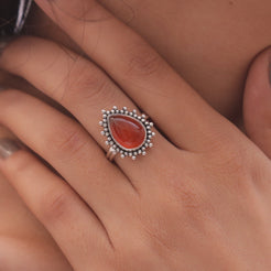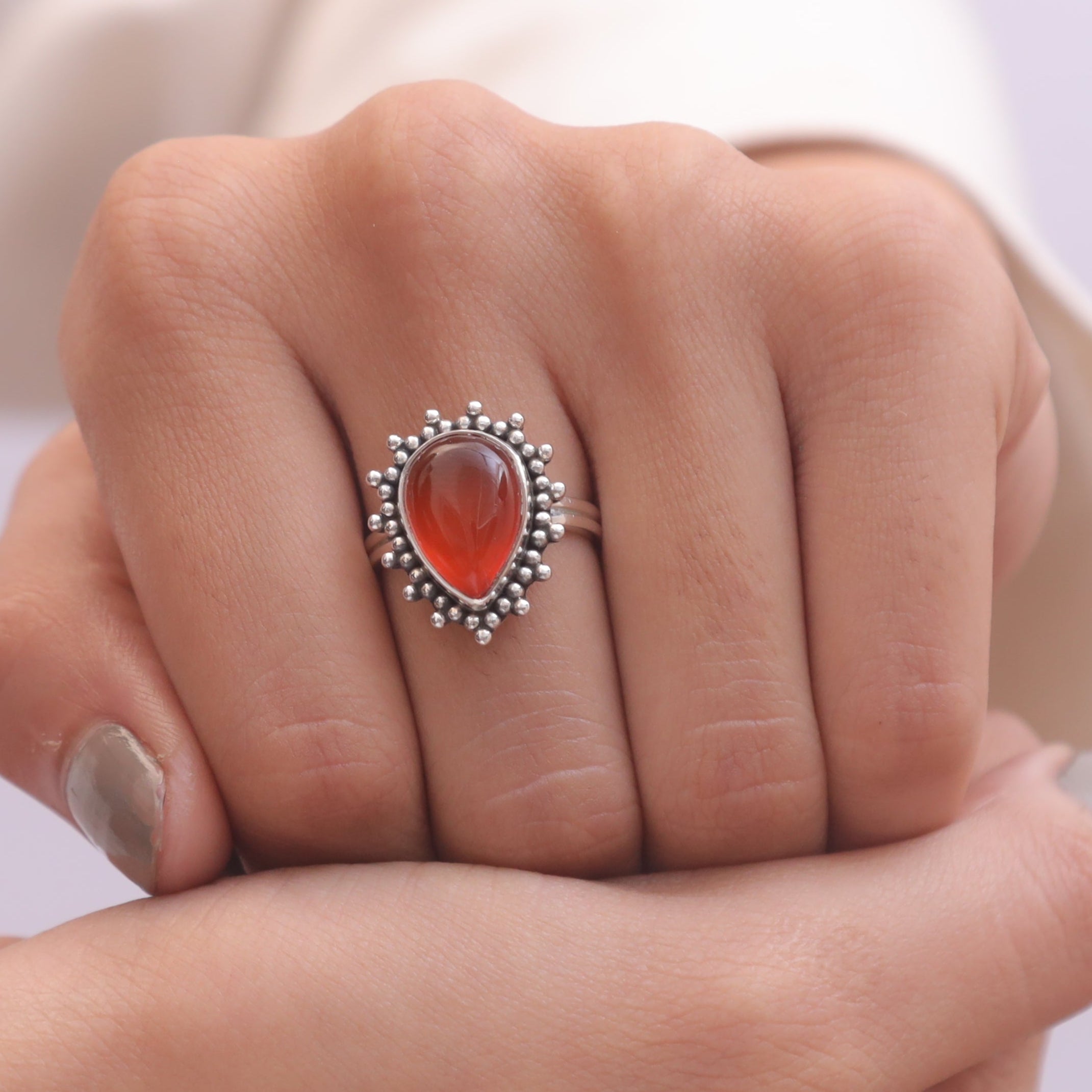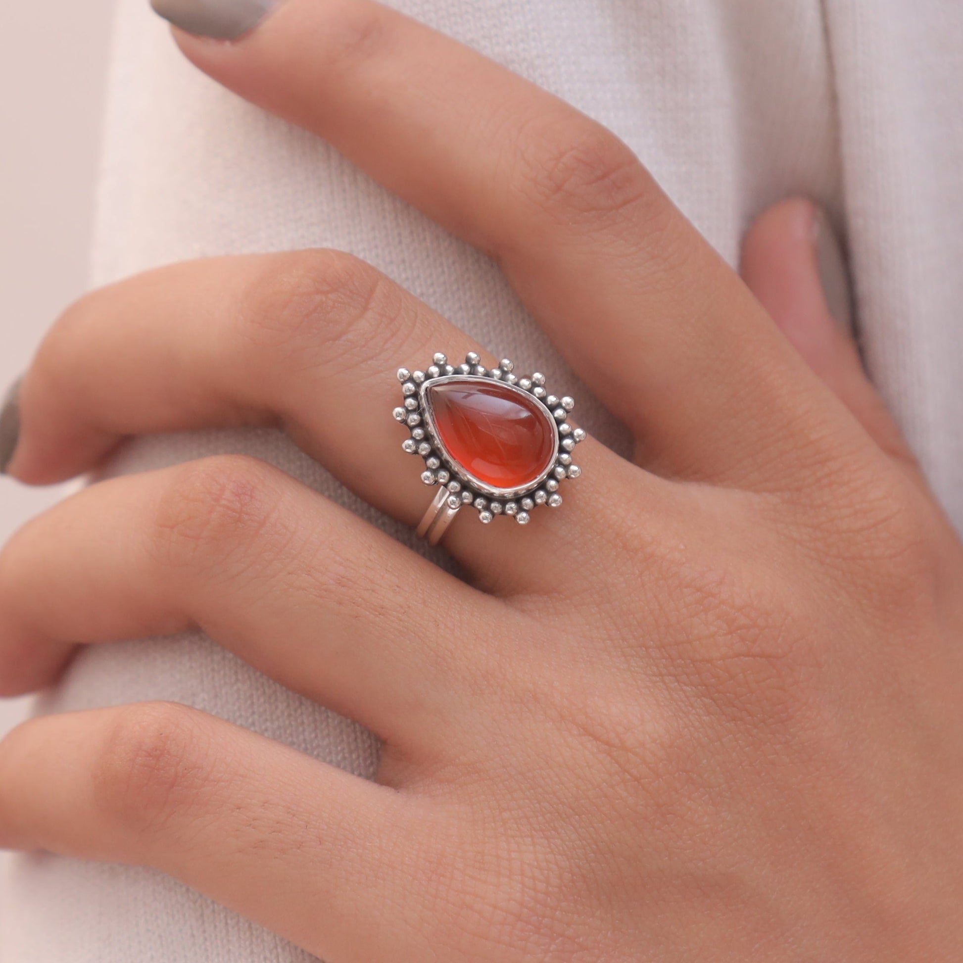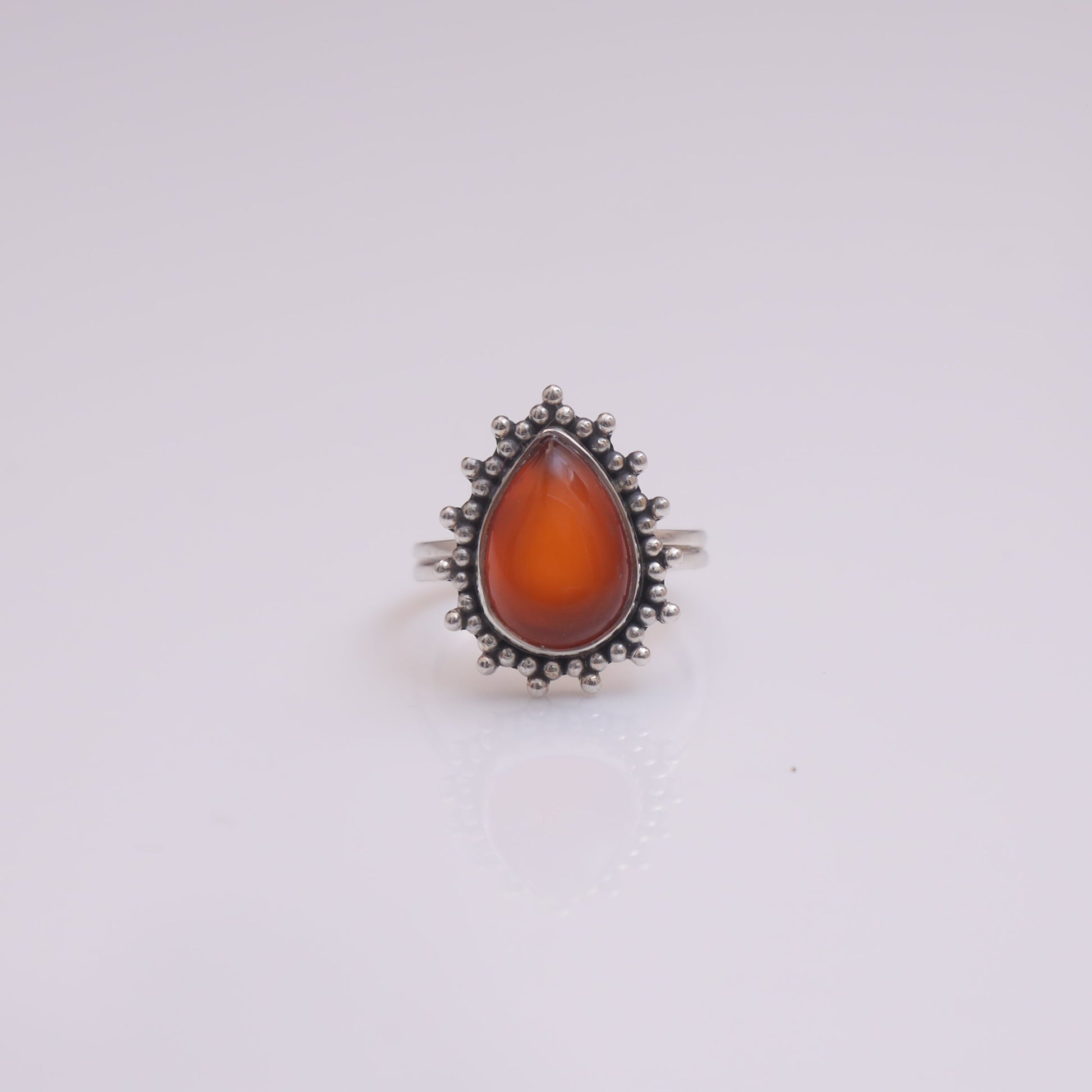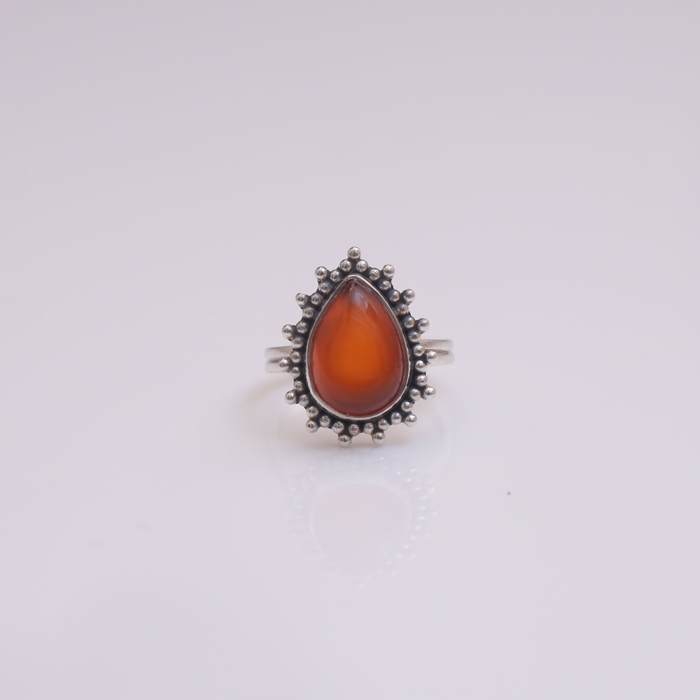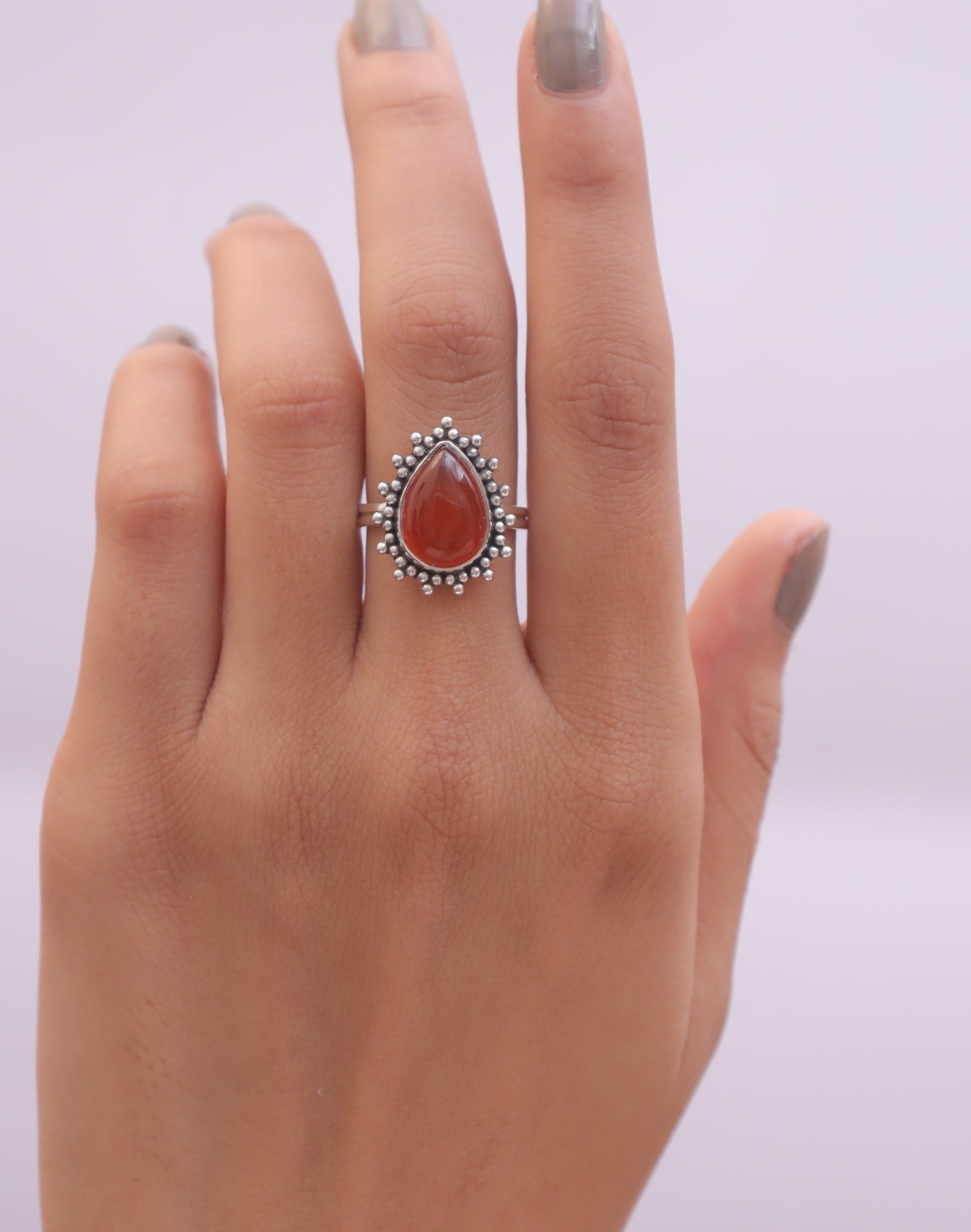 Elevate your style with the Carnelian , a masterpiece that blends natural beauty with refined craftsmanship. The ring features a radiant Carnelian centrepiece, carefully cut to enhance its inherent allure and brilliance. Set in a band crafted from 925 sterling silver, it offers durability and a lasting shine that complements the gemstone’s mesmerizing glow.
