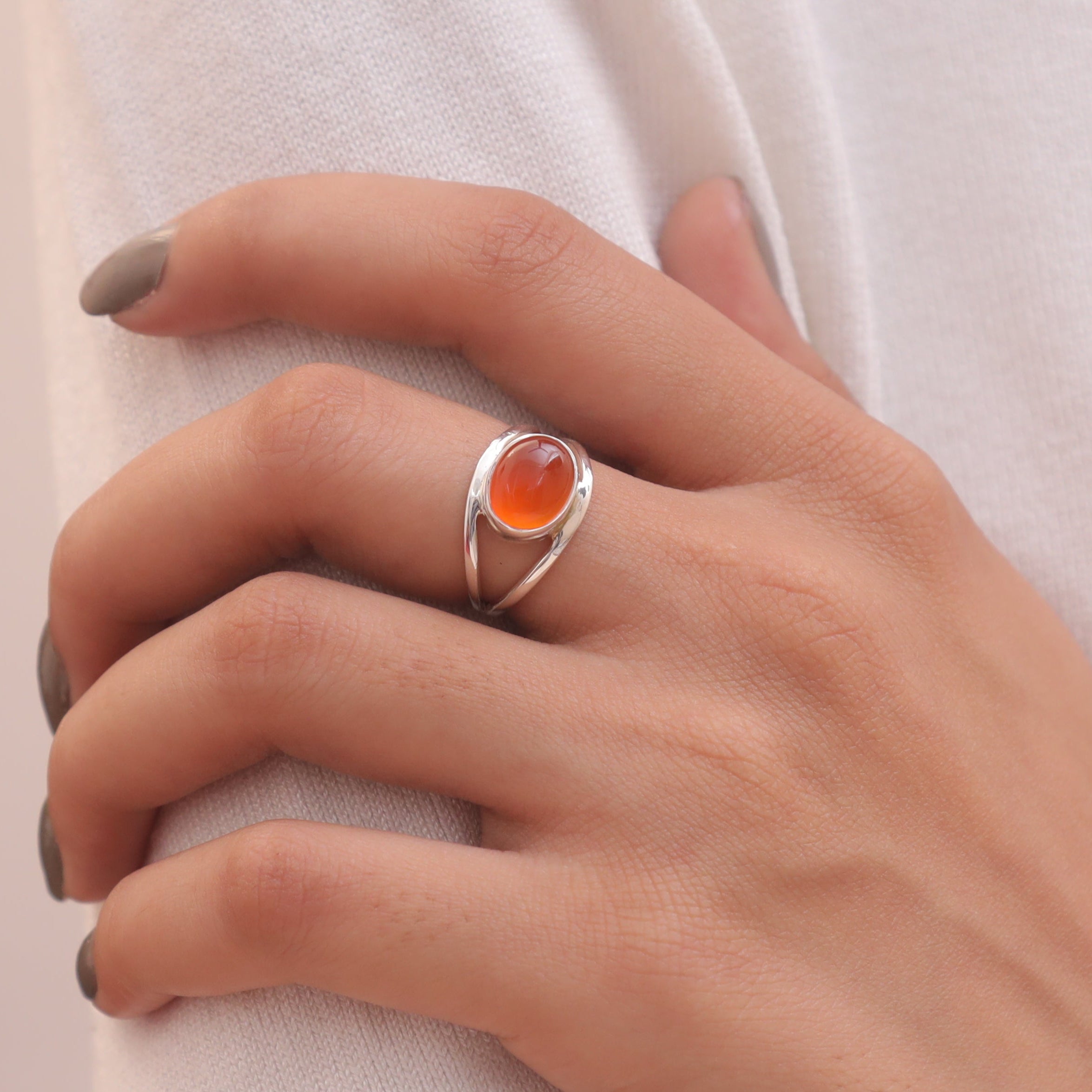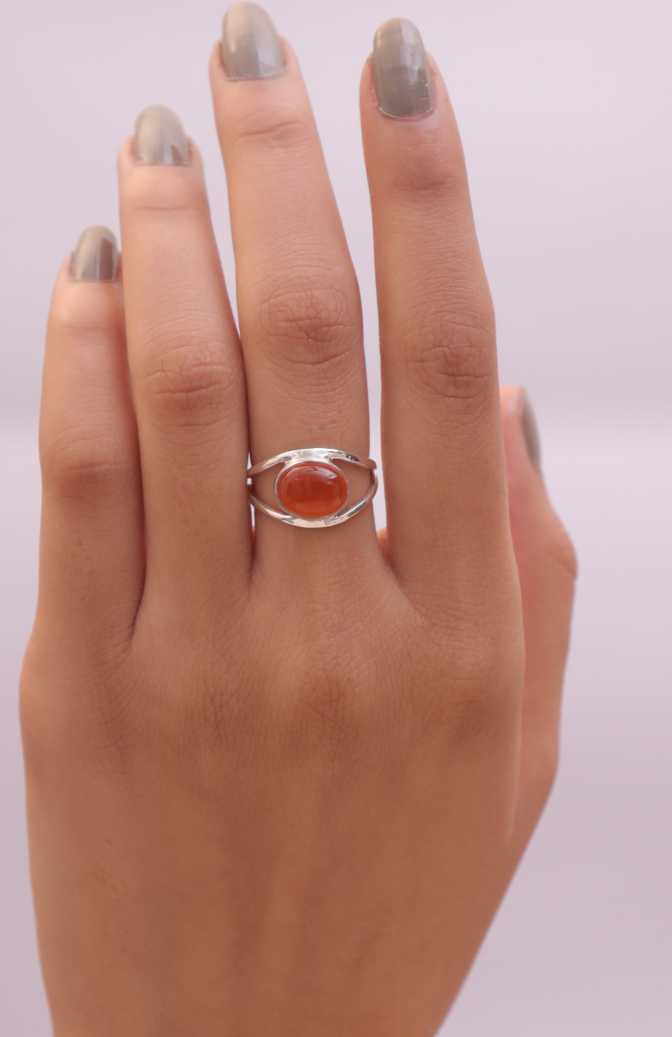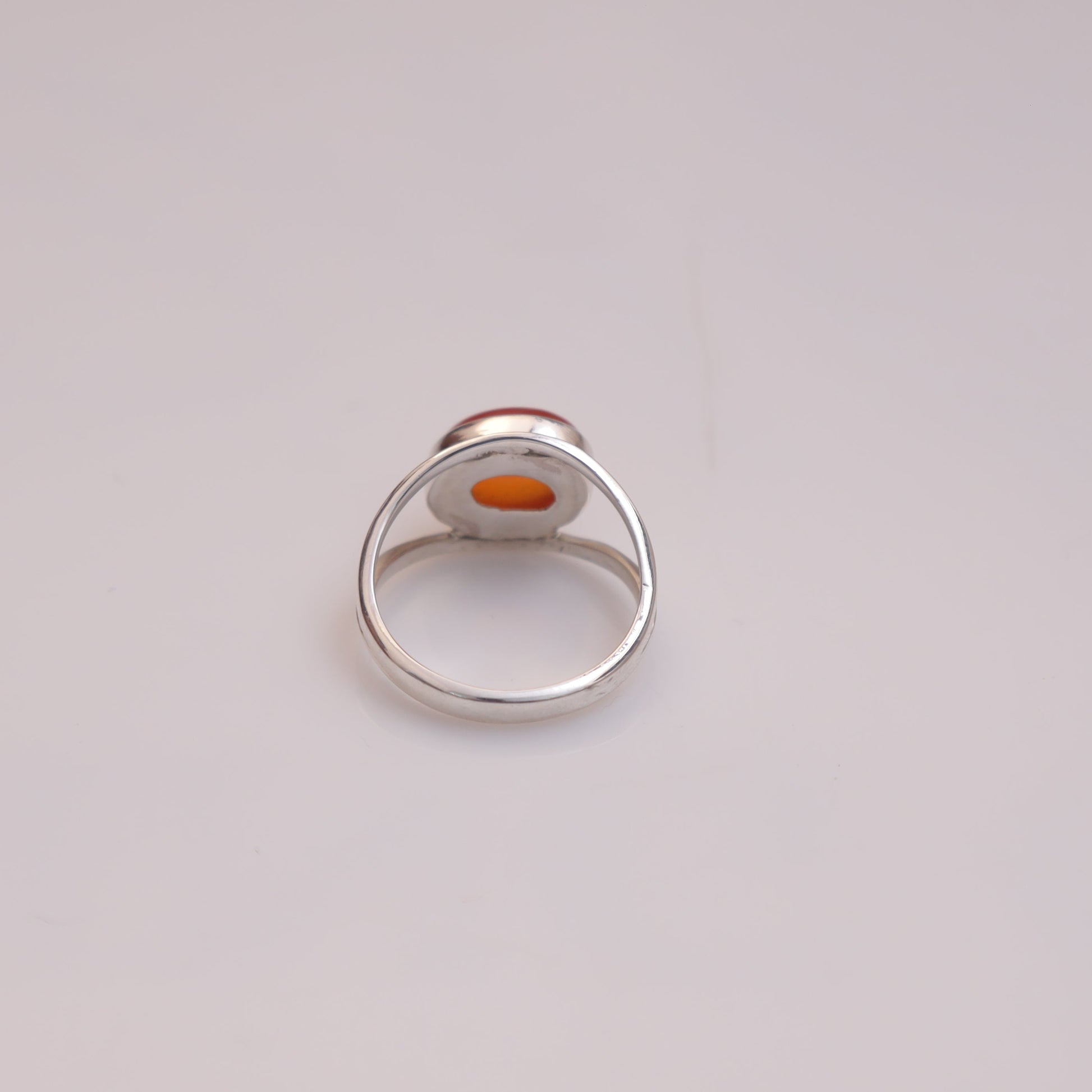 Each detail of the ring showcases expert craftsmanship, from the precisely set prongs securing the Carnelian to the polished silver band ensuring a comfortable fit. The design allows the Carnelian to shine as the focal point, making it a versatile accessory suitable for everyday wear or special occasions.