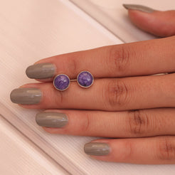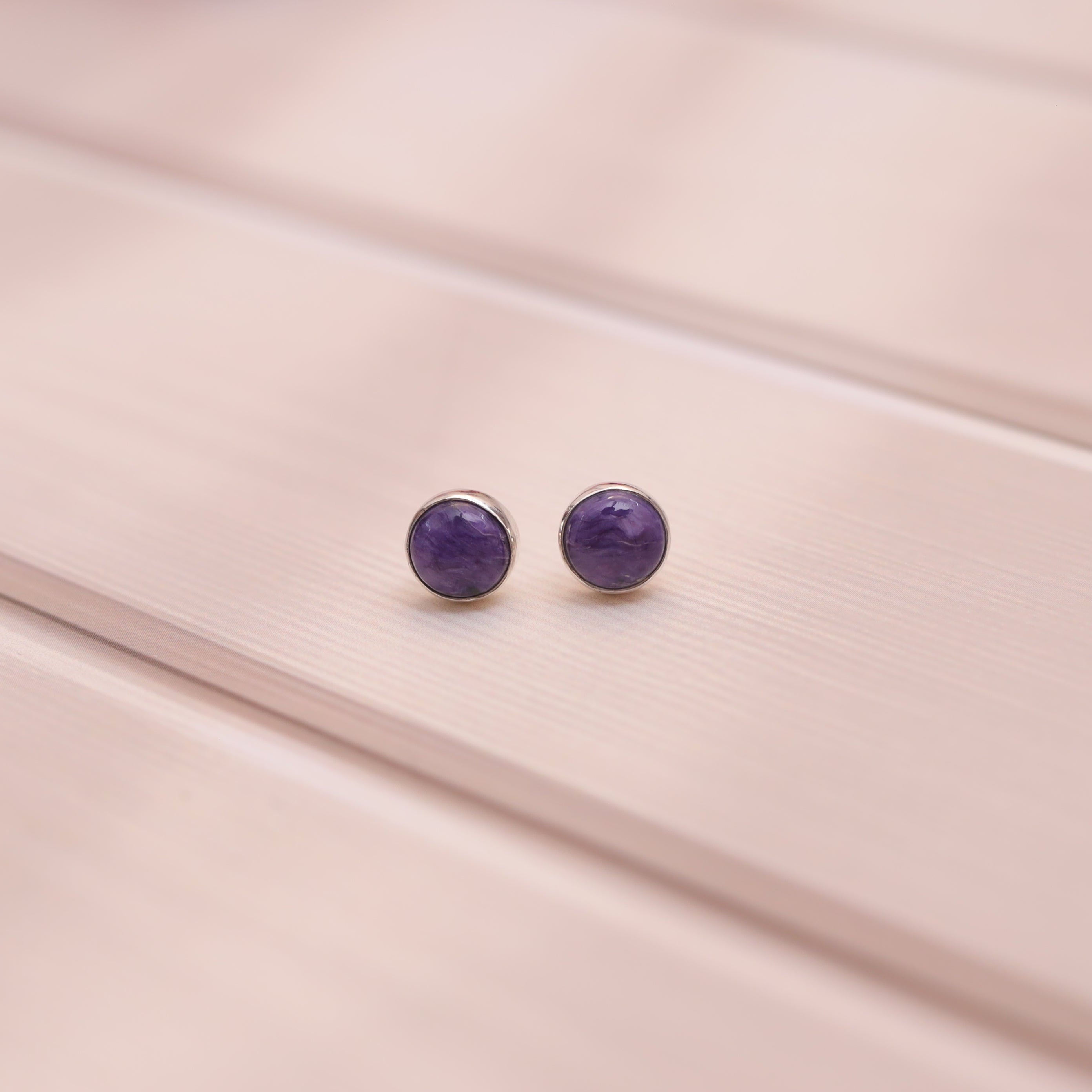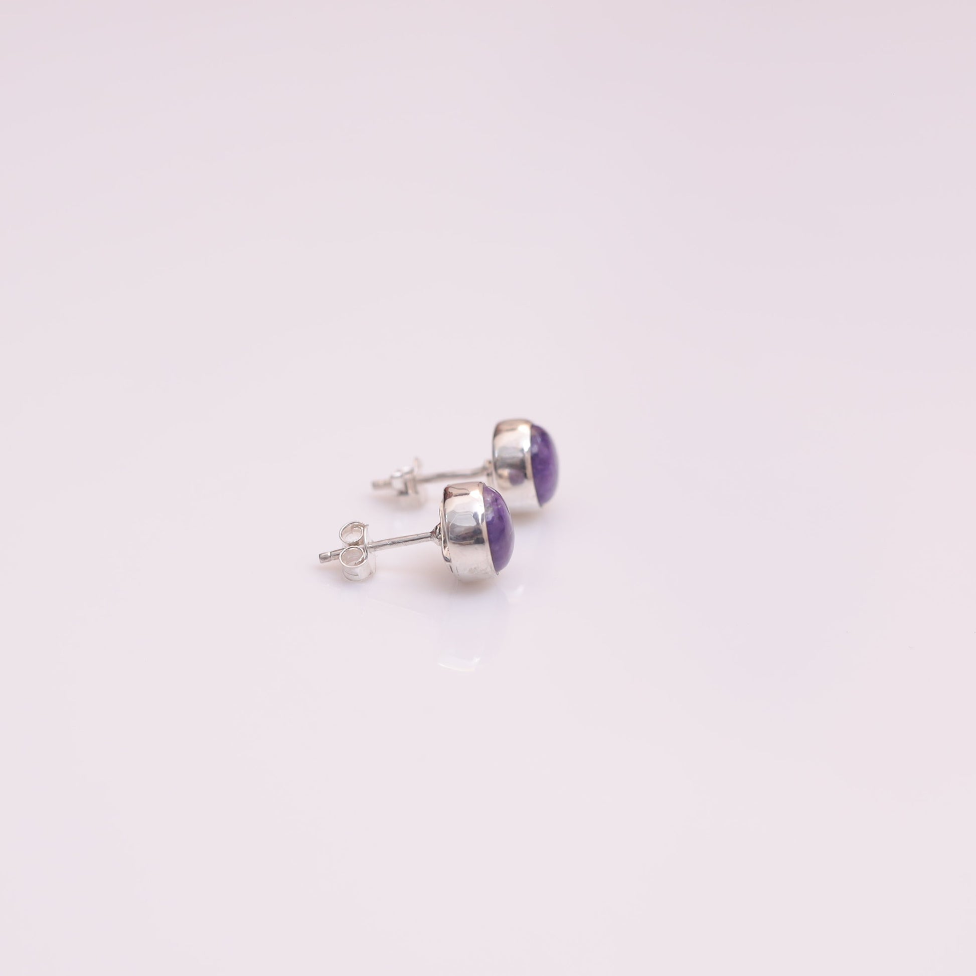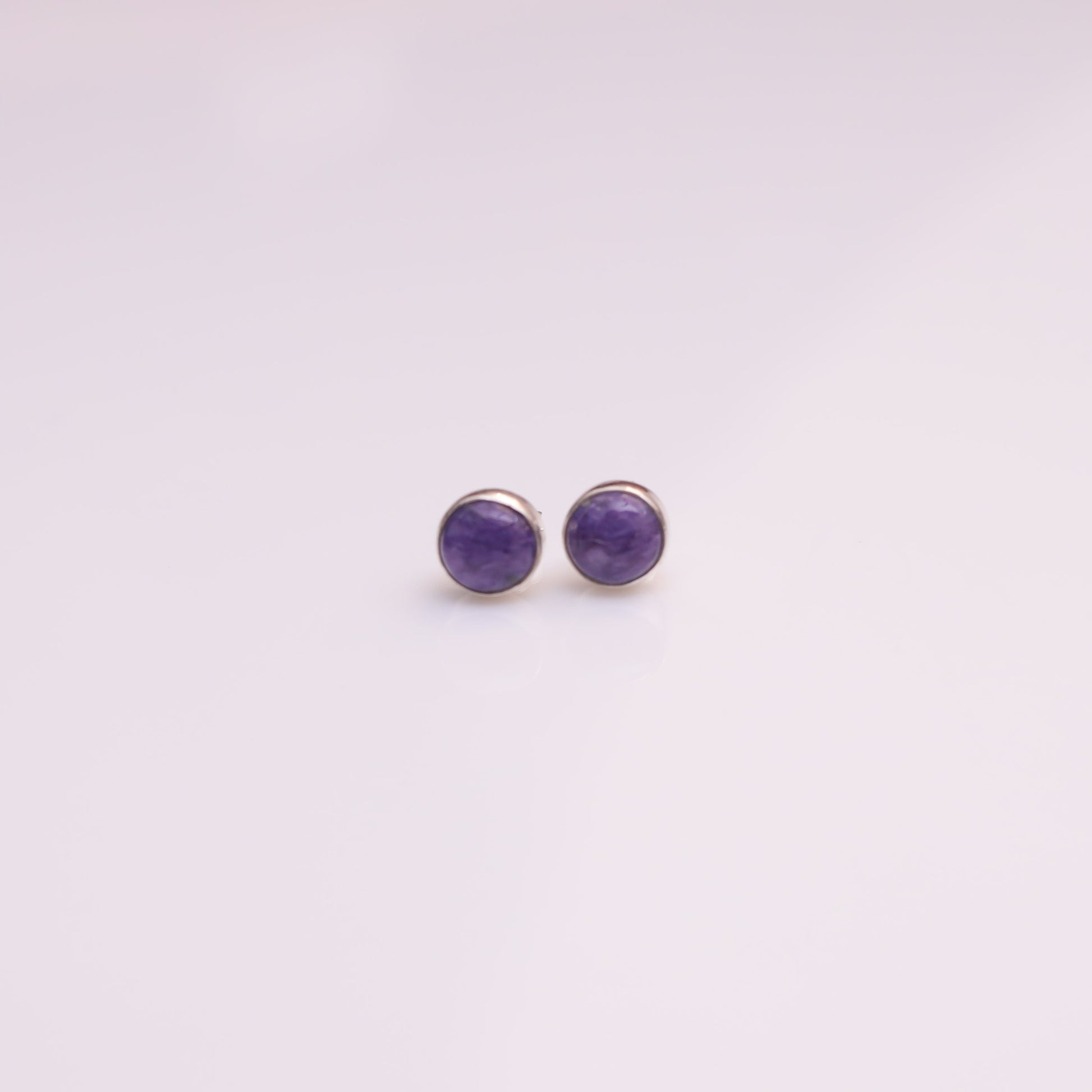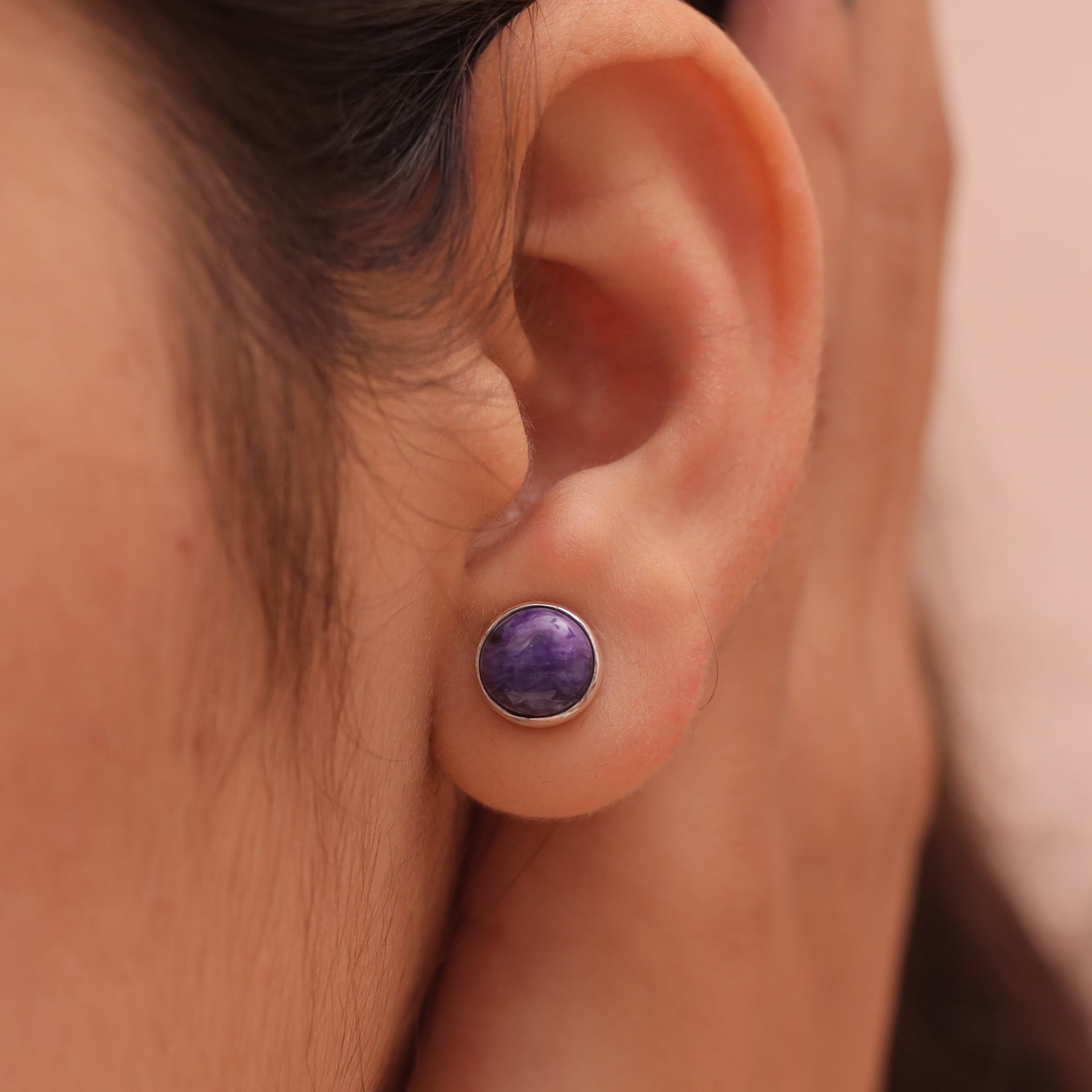 Elevate your style with the Charoite Studs, a masterpiece that blends natural beauty with refined craftsmanship. The Studs features a radiant Charoite centerpiece, carefully cut to enhance its inherent allure and brilliance. Set in a band crafted from 925 sterling silver, it offers durability and a lasting shine that complements the gemstone's vibrant hue.