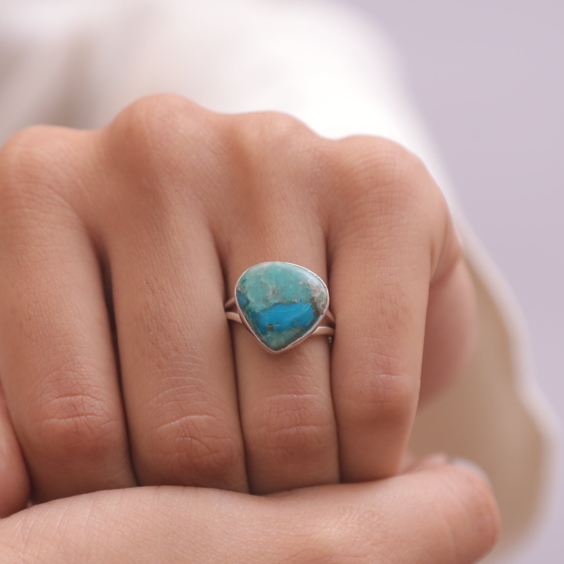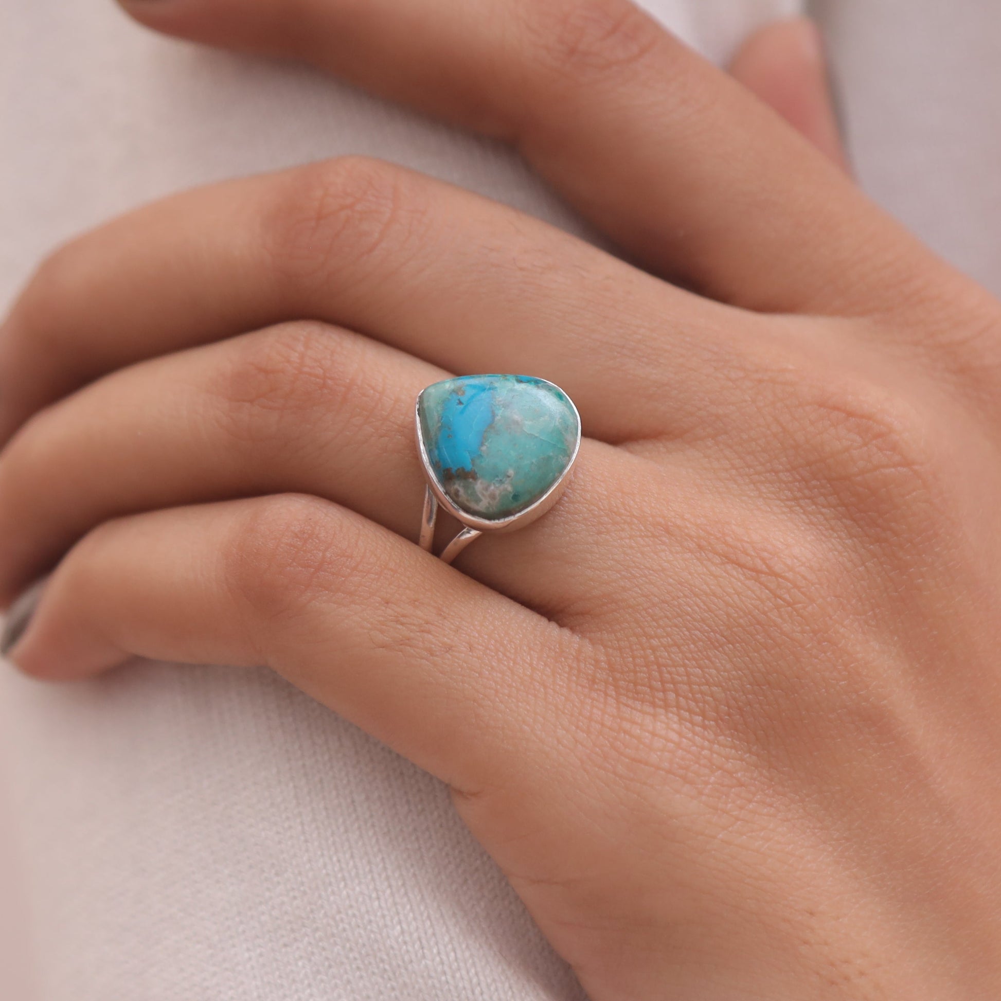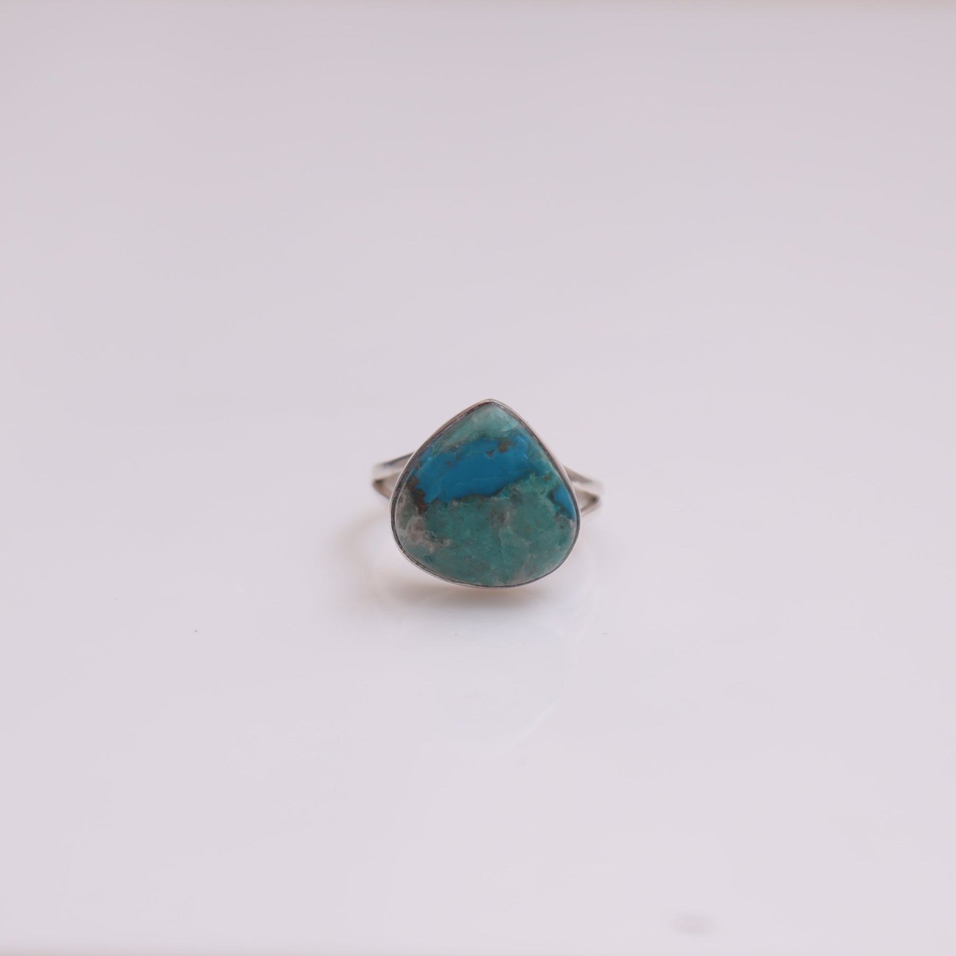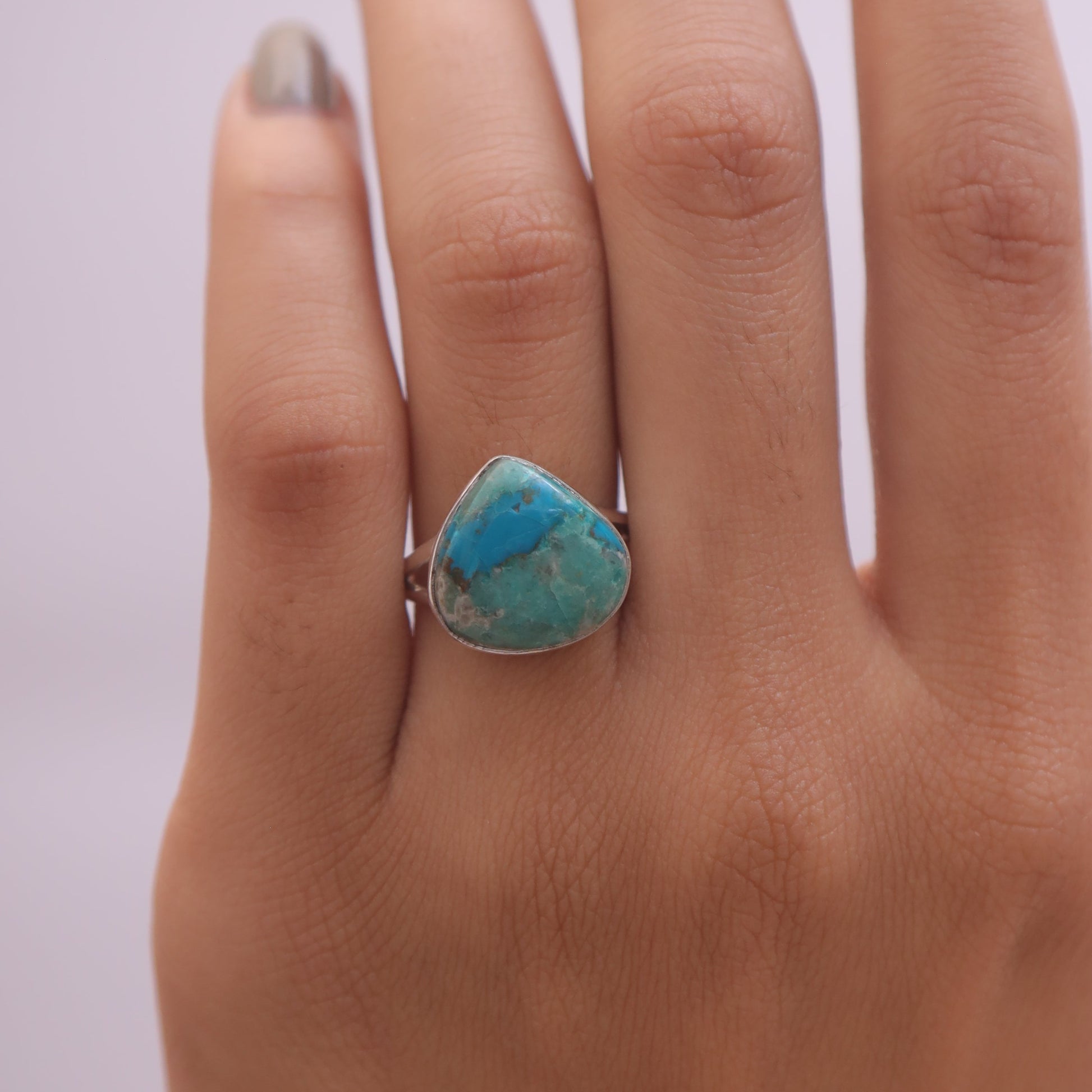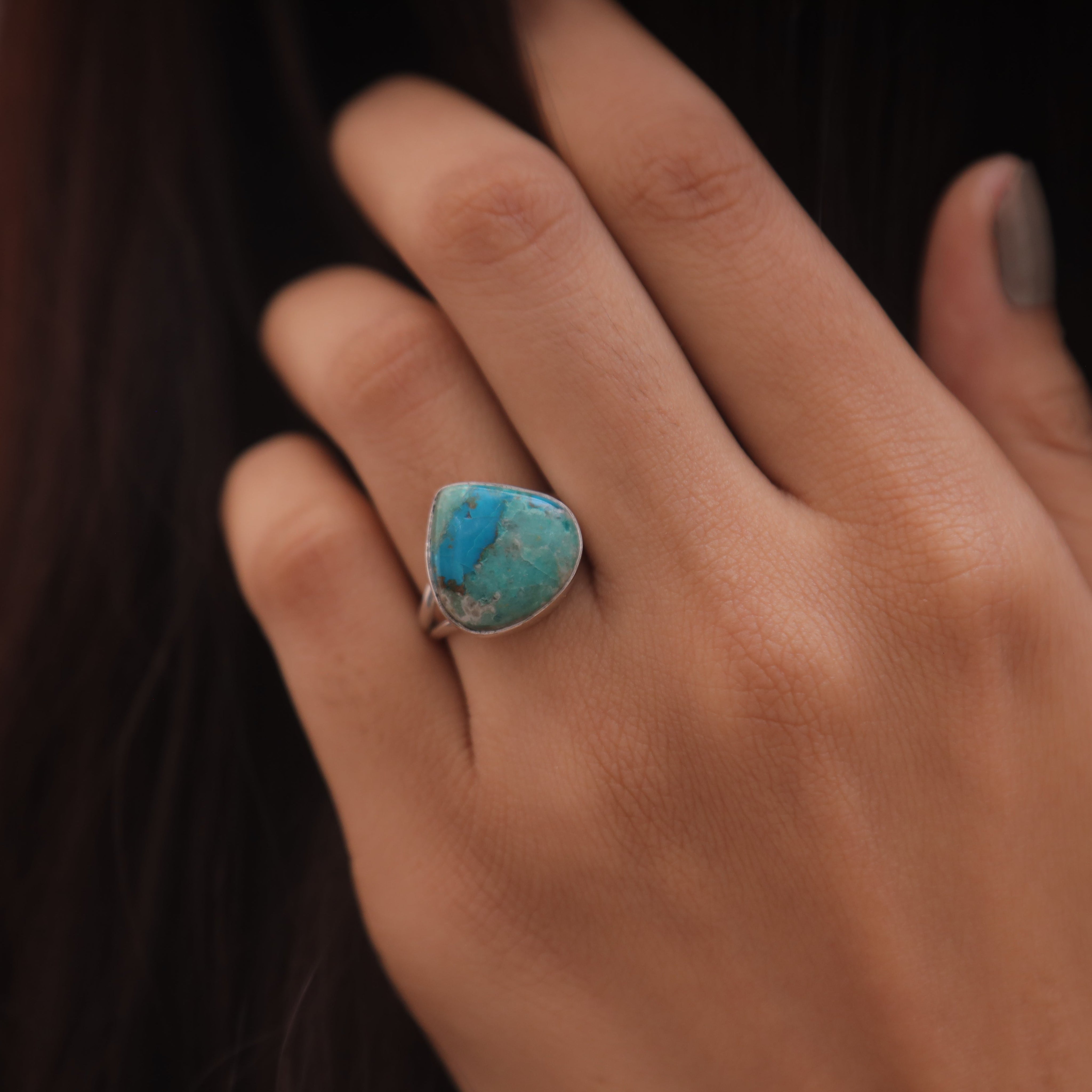 Elevate your style with the Chrysocolla Ring, a masterpiece that blends natural beauty with refined craftsmanship. The ring features a radiant Chrysocolla centerpiece, carefully cut to enhance its inherent allure and brilliance. Set in a band crafted from 925 sterling silver, it offers durability and a lasting shine that complements the gemstone's vibrant hue.