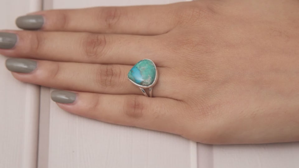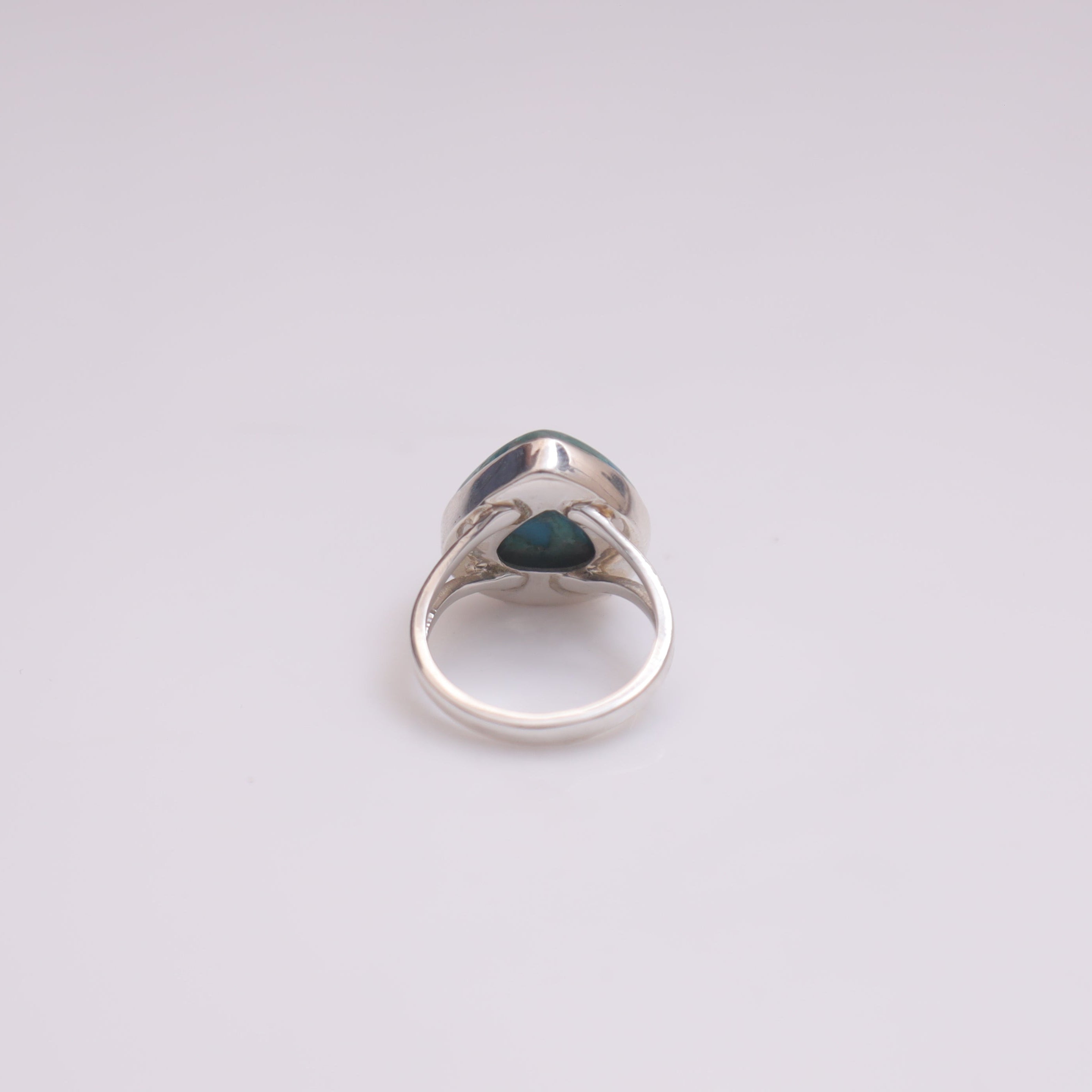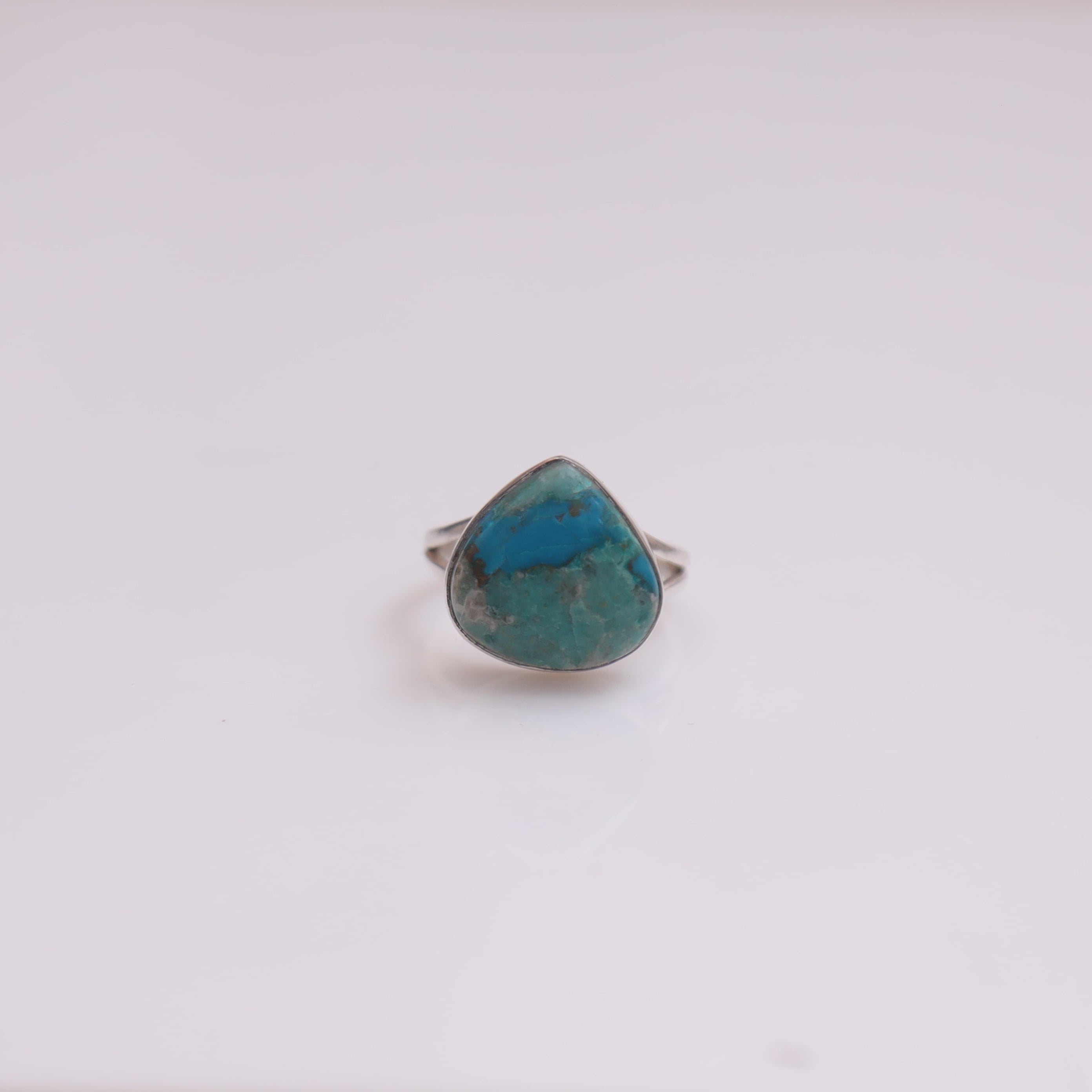 Each detail of the ring showcases expert craftsmanship, from the precisely set prongs securing the Chrysocolla to the polished silver band ensuring a comfortable fit. The design allows the Chrysocolla to shine as the focal point, making it a versatile accessory suitable for everyday wear or special occasions.