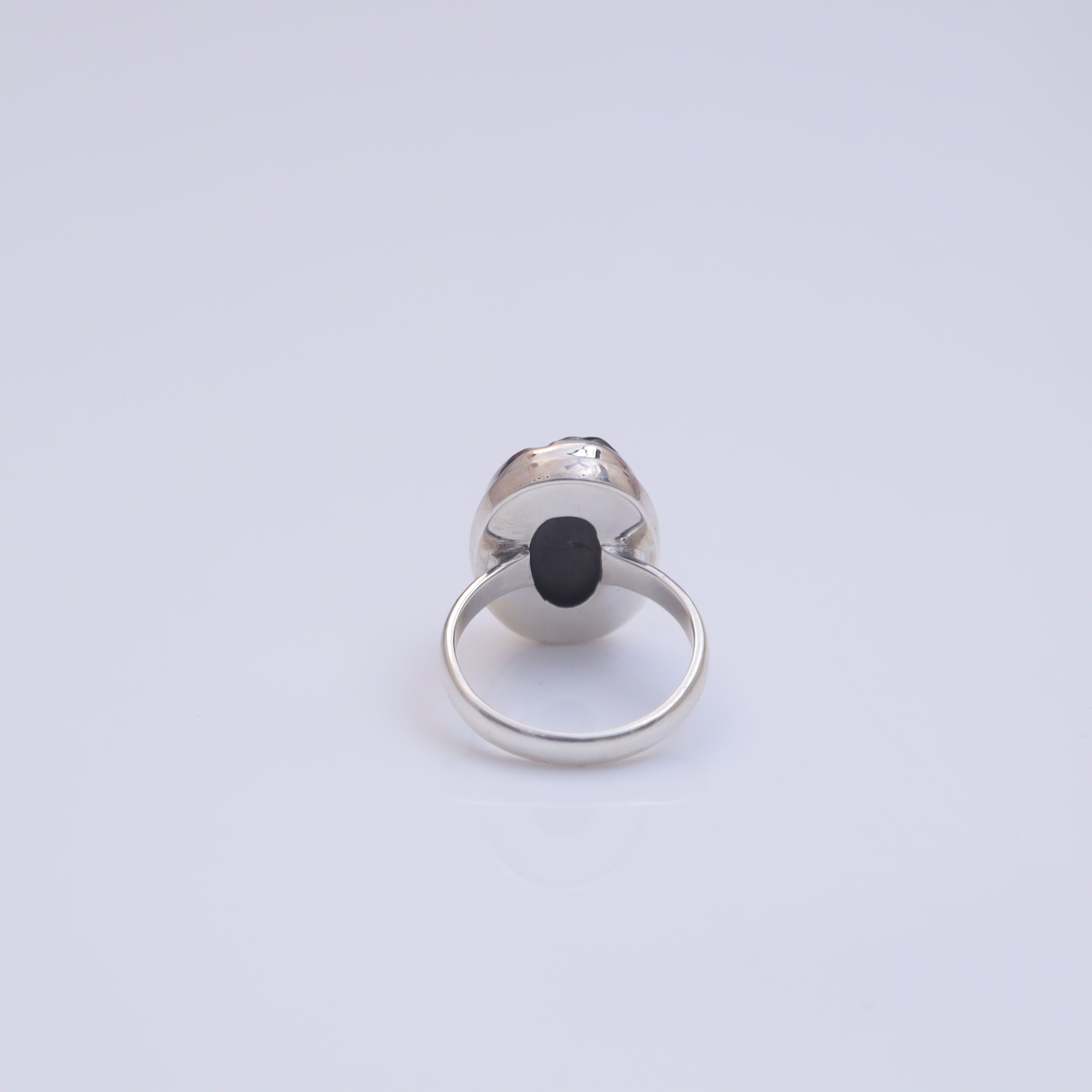 Each detail of the ring showcases expert craftsmanship, from the precisely set prongs securing the Shungite to the polished silver band ensuring a comfortable fit. The design allows the Shungite to shine as the focal point, making it a versatile accessory suitable for everyday wear or special occasions.