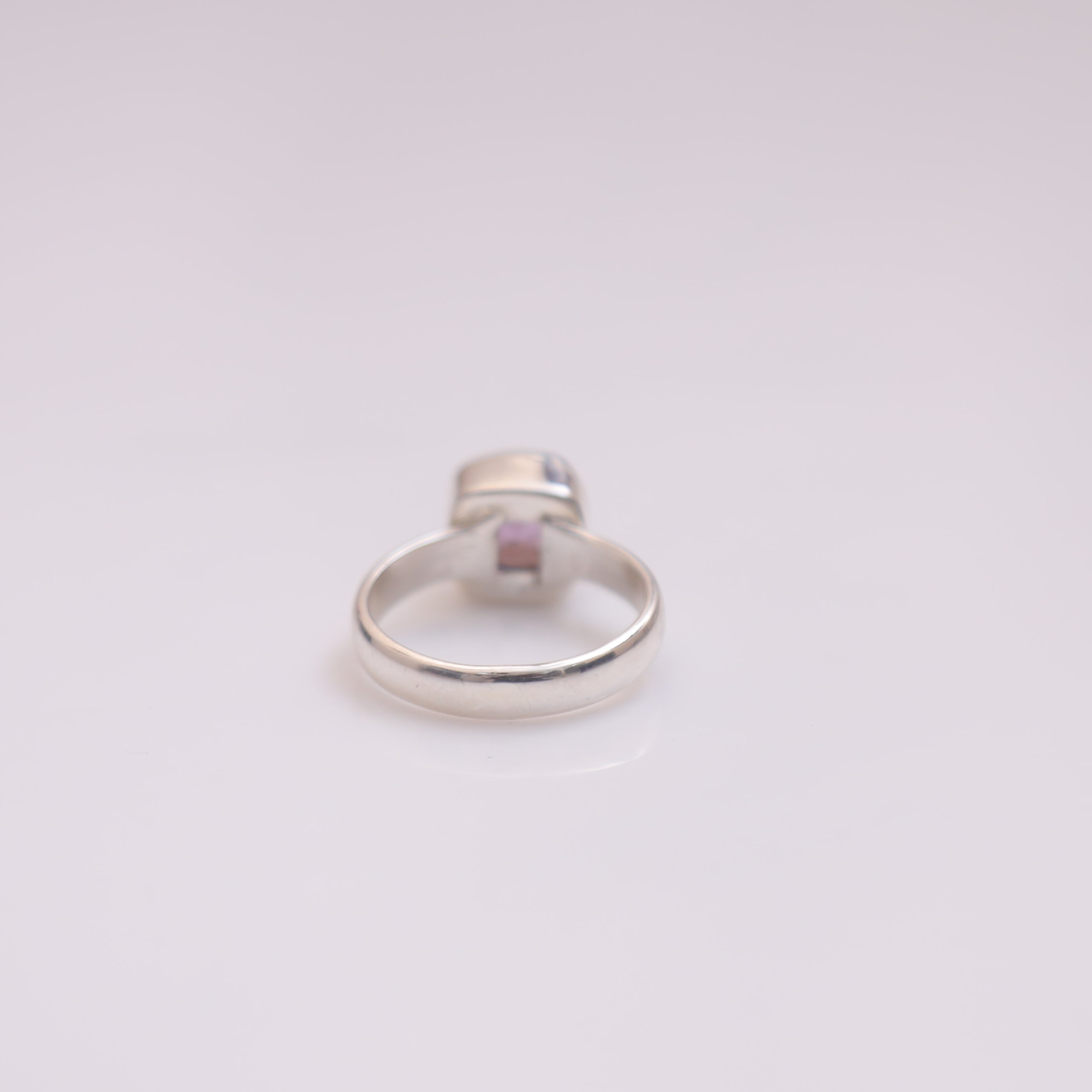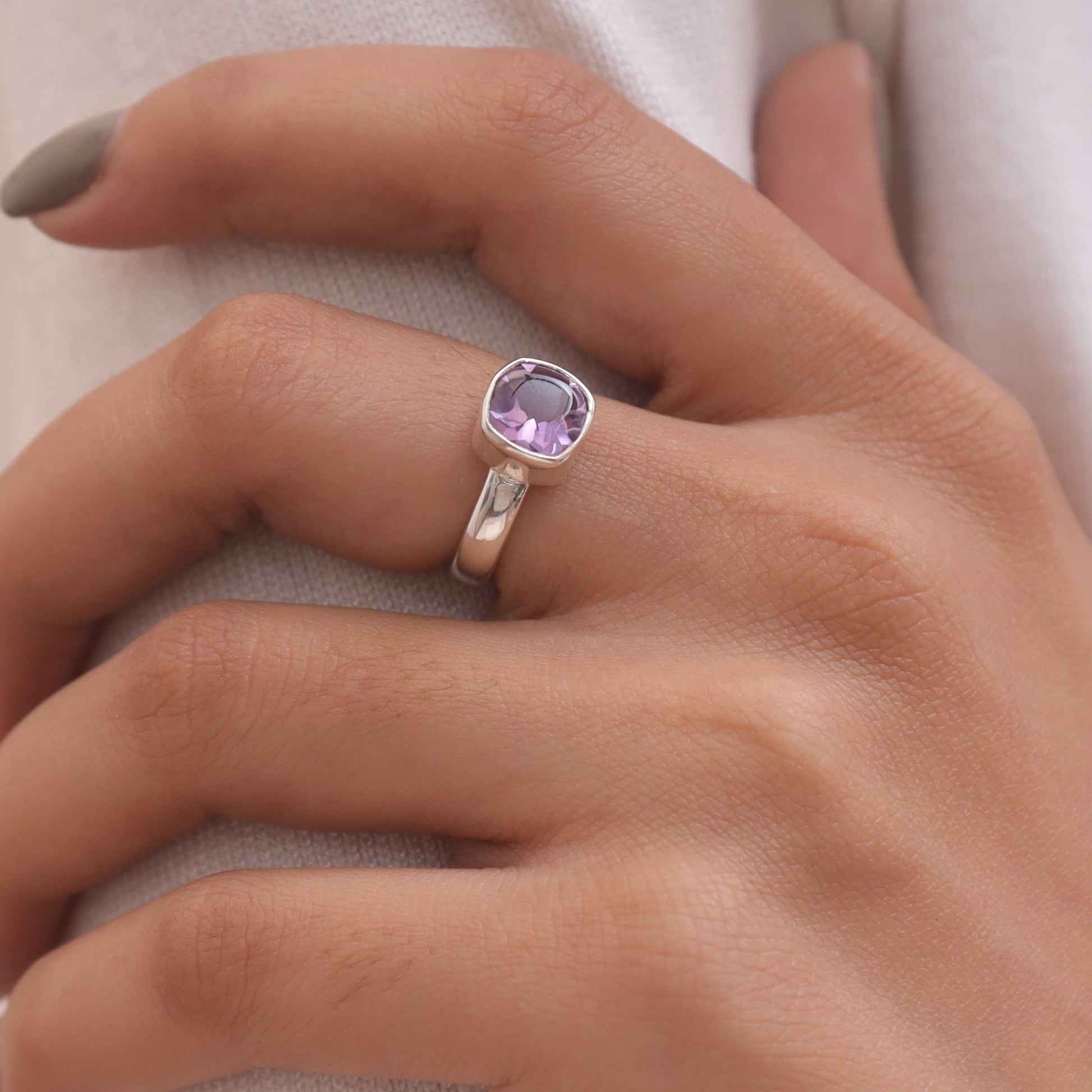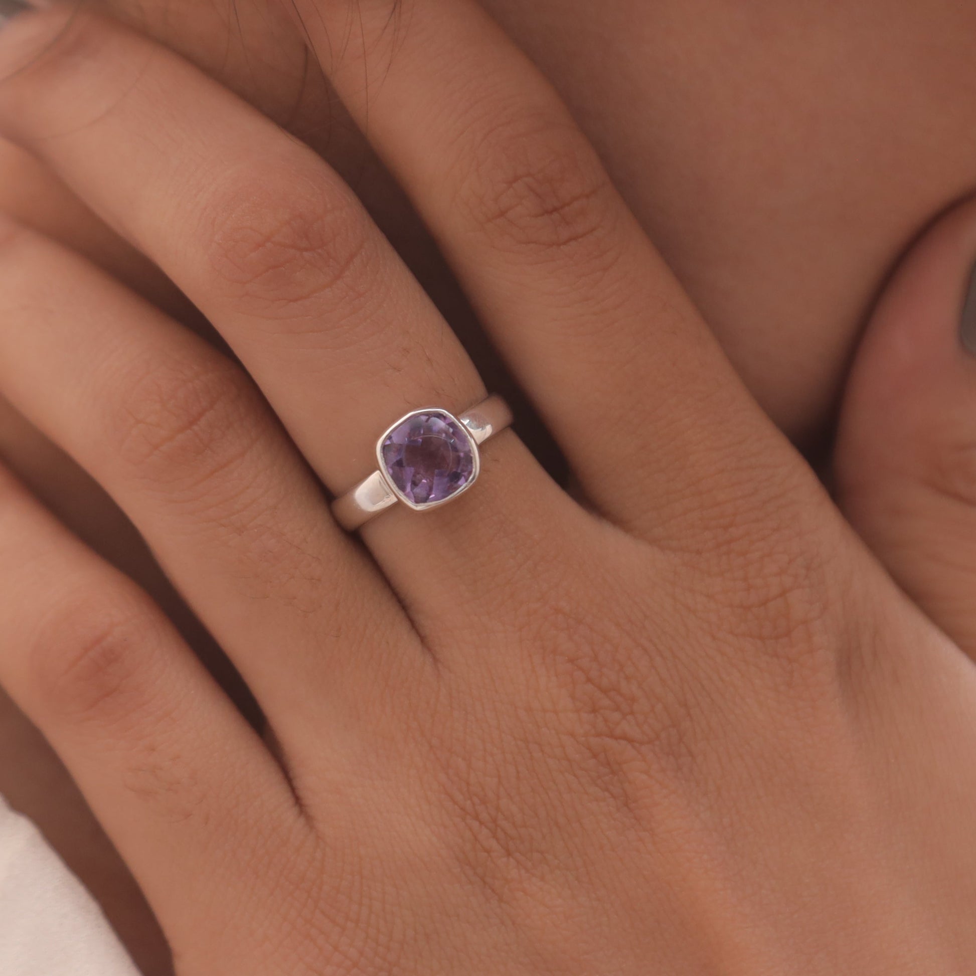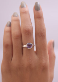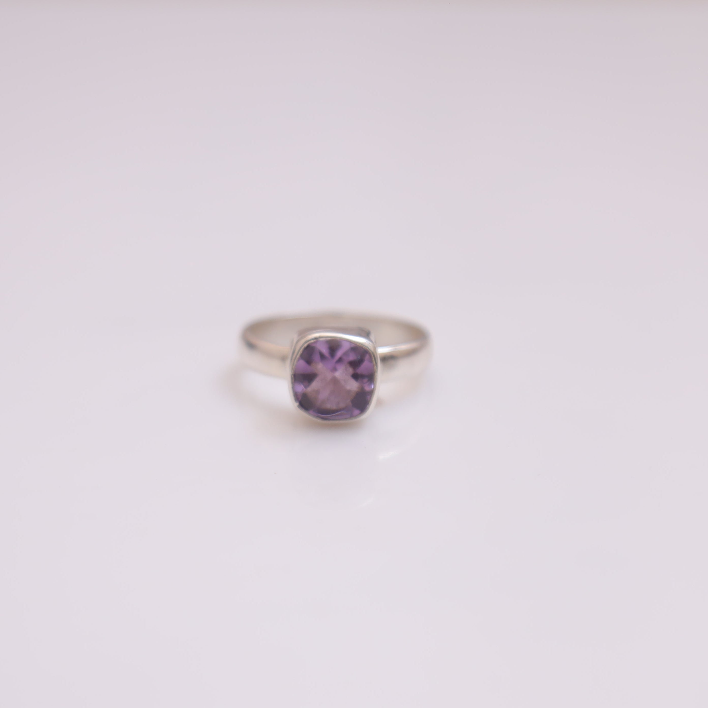 Each detail of the ring showcases expert craftsmanship, from the precisely set prongs securing the Amethyst to the polished silver band ensuring a comfortable fit. The design allows the Amethyst to shine as the focal point, making it a versatile accessory suitable for everyday wear or special occasions.