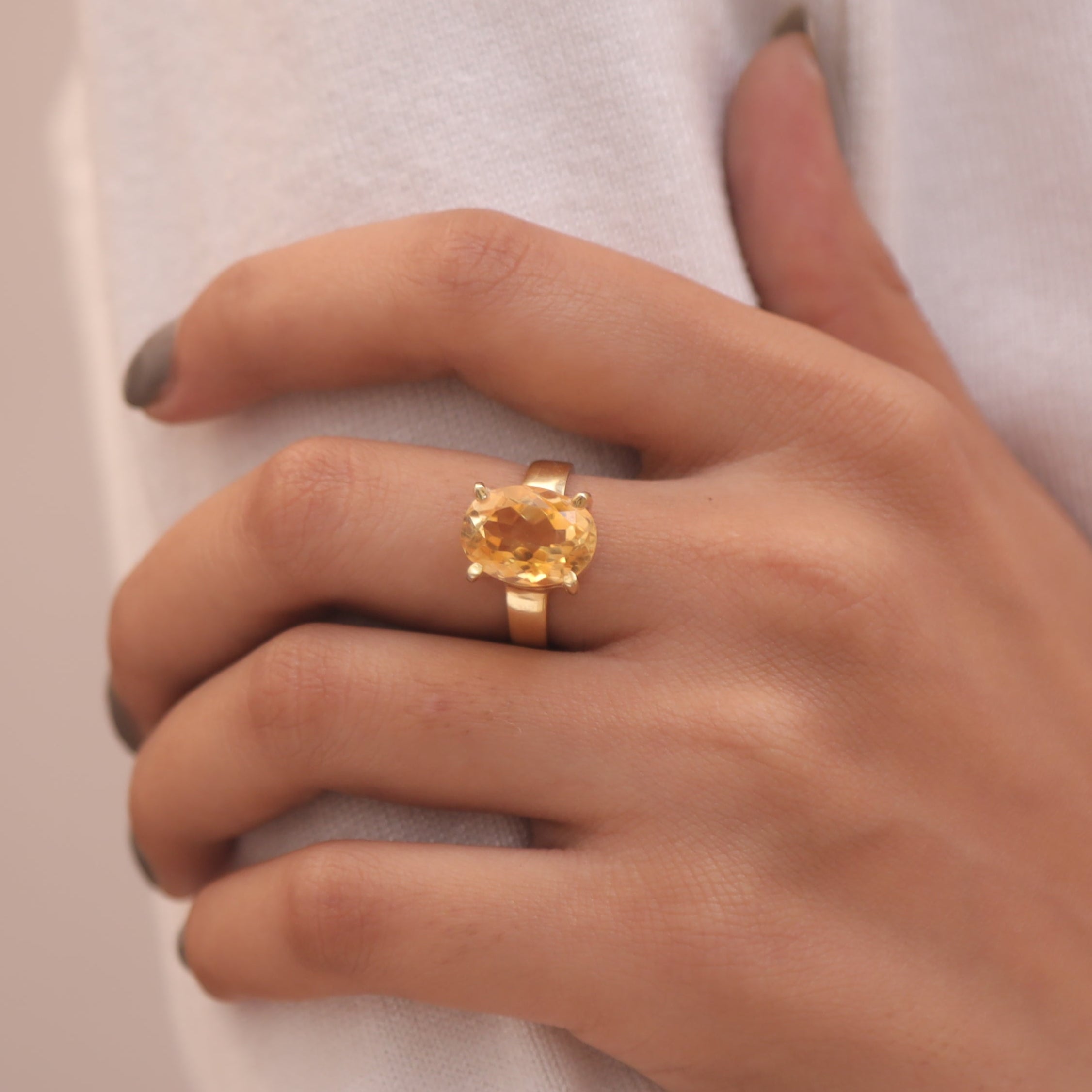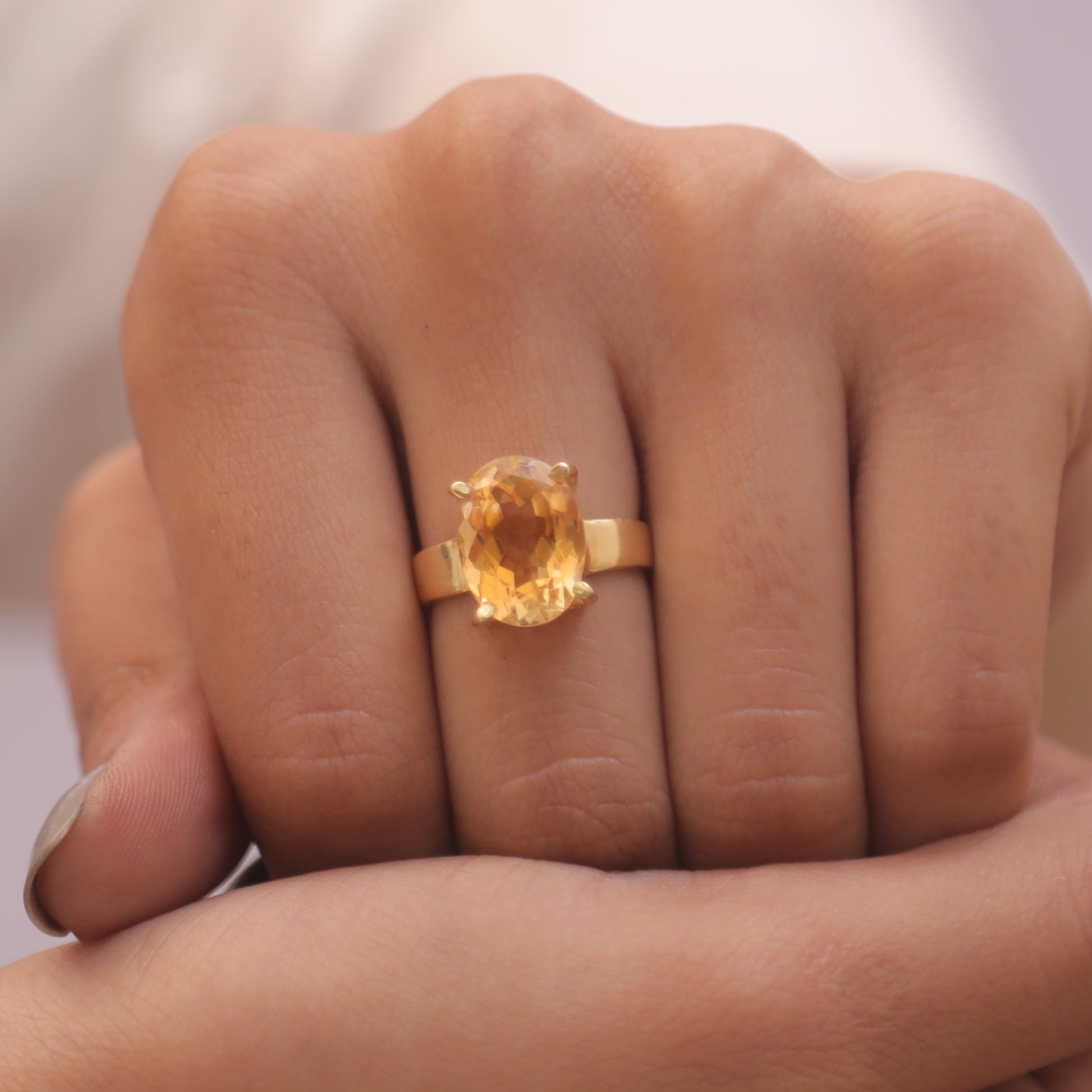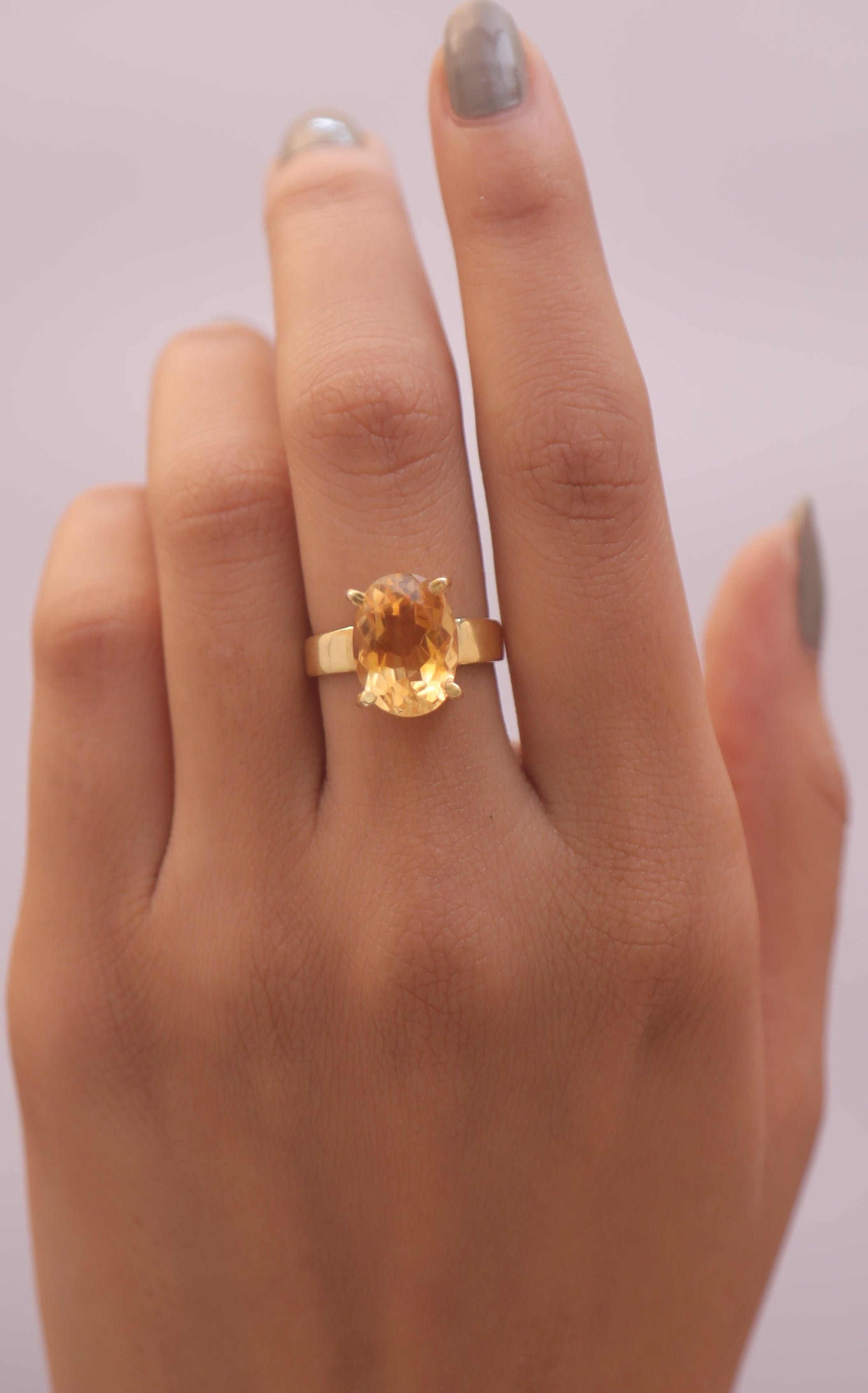 Each detail of the ring showcases expert craftsmanship, from the precisely set prongs securing the Citrine to the polished silver band ensuring a comfortable fit. The design allows the Citrine to shine as the focal point, making it a versatile accessory suitable for everyday wear or special occasions.