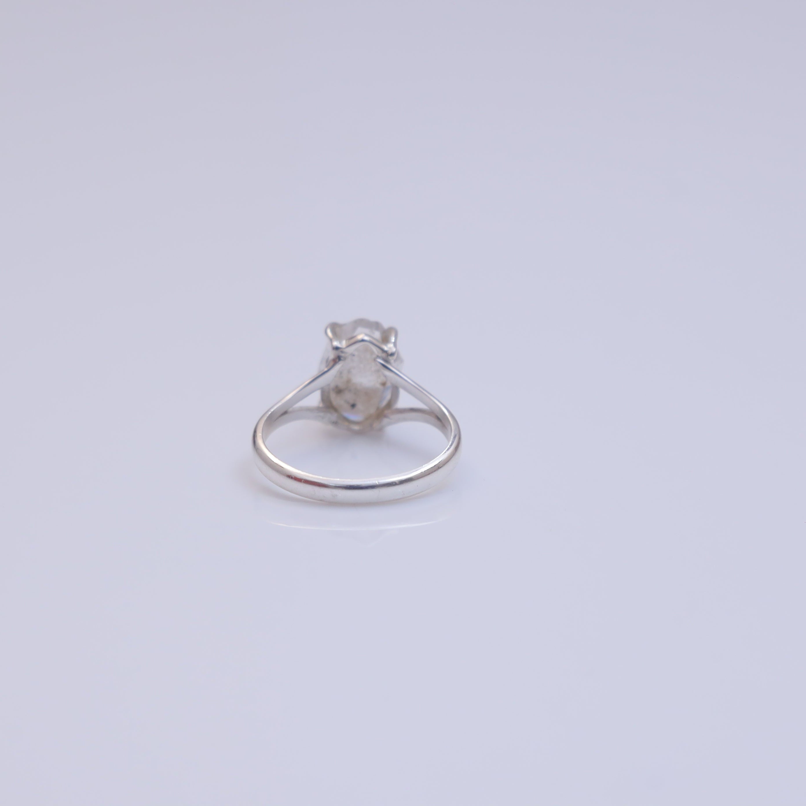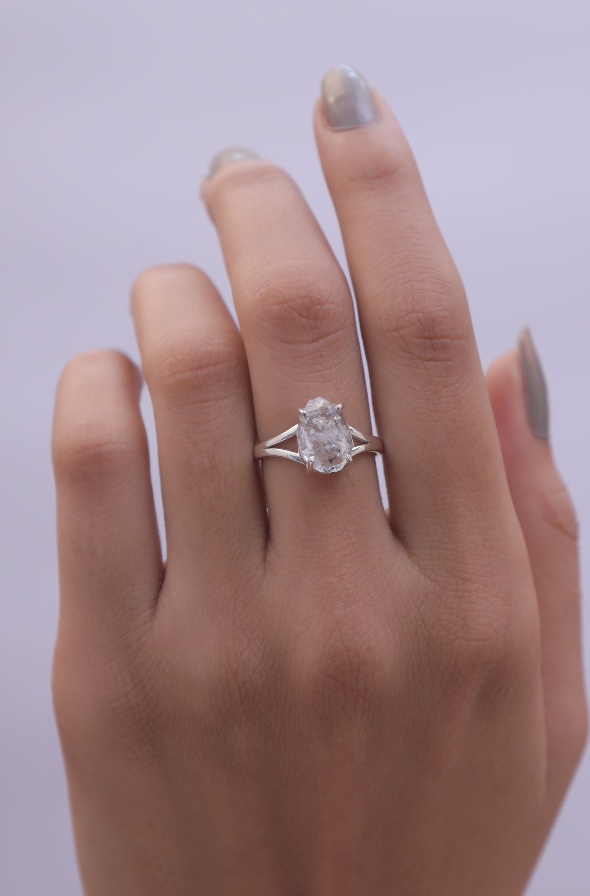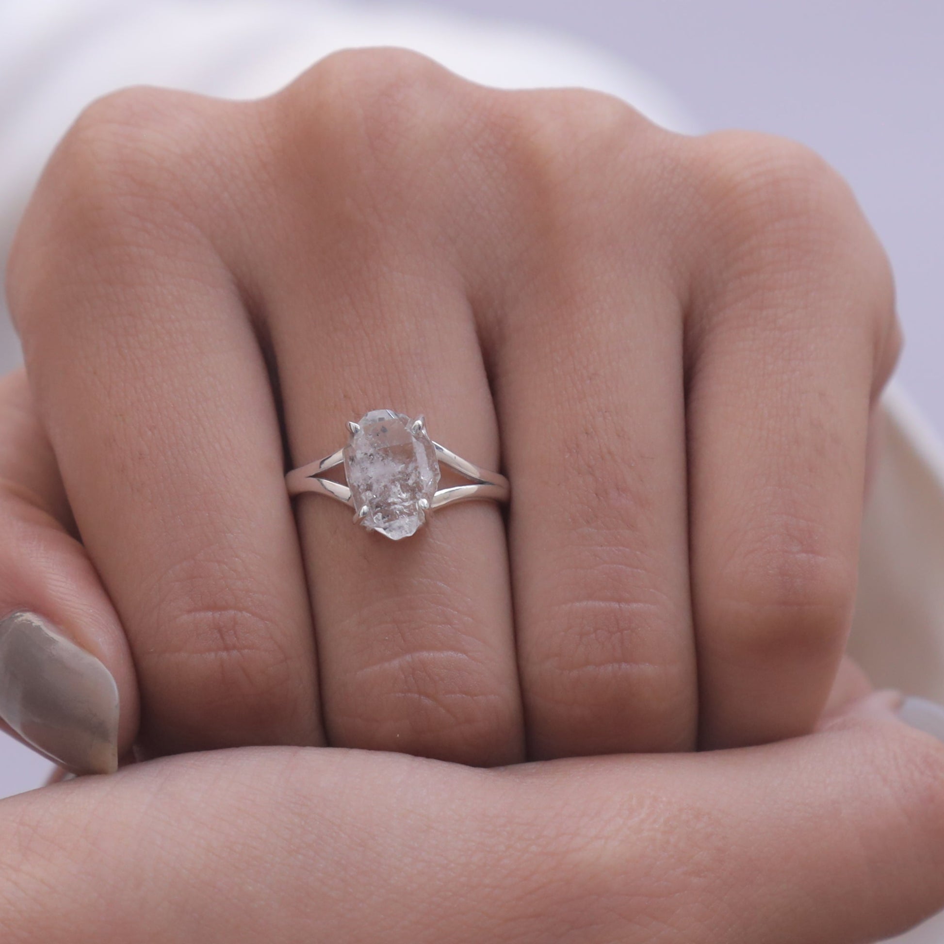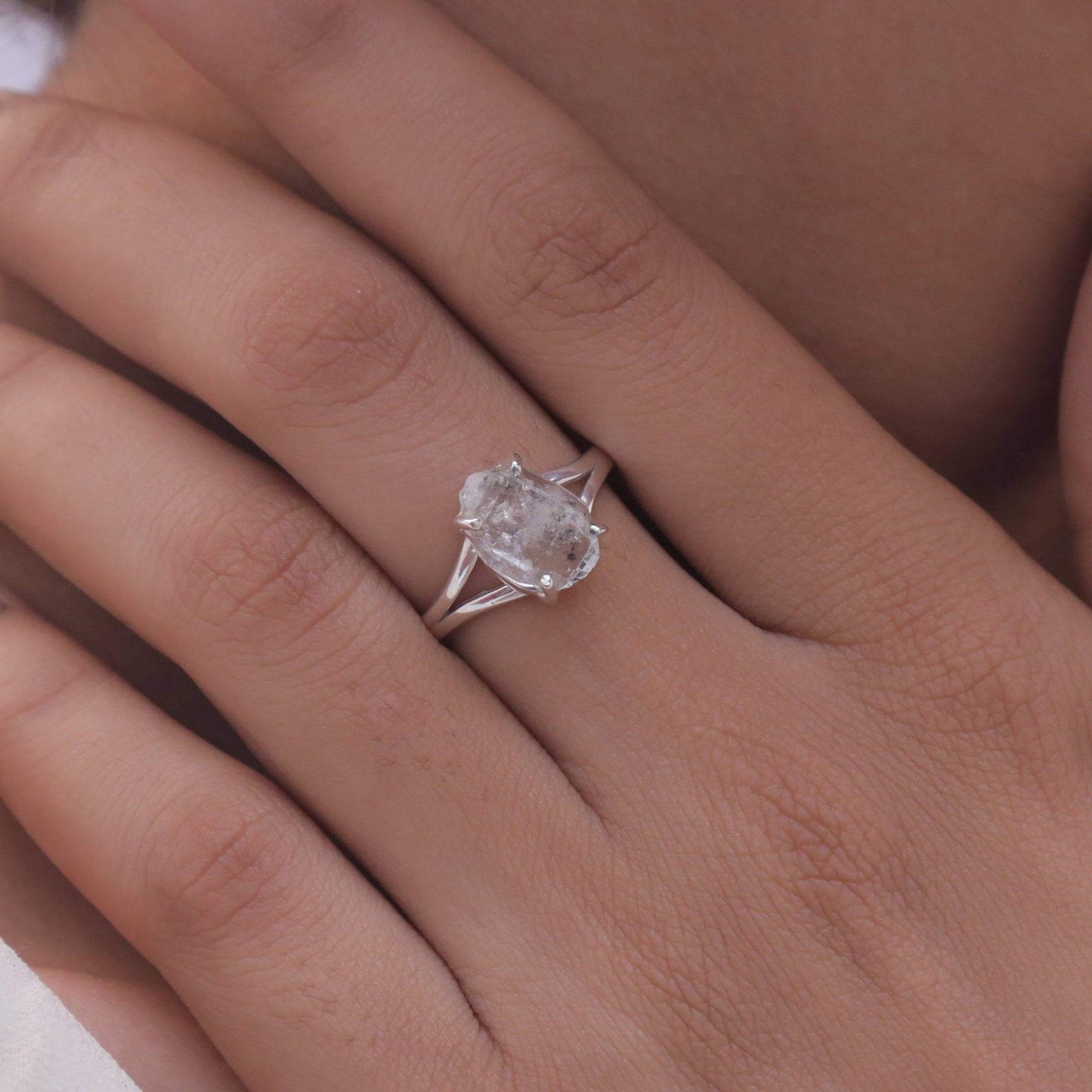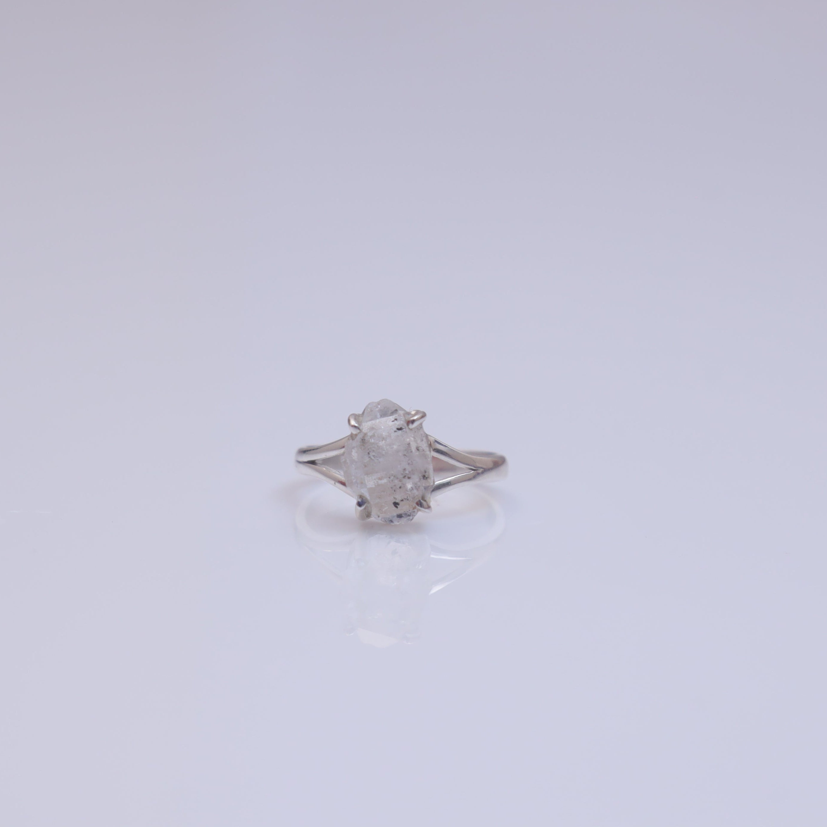 Each detail of the ring showcases expert craftsmanship, from the precisely set prongs securing the Herkimer to the polished silver band ensuring a comfortable fit. The design allows the Herkimer to shine as the focal point, making it a versatile accessory suitable for everyday wear or special occasions.