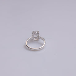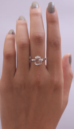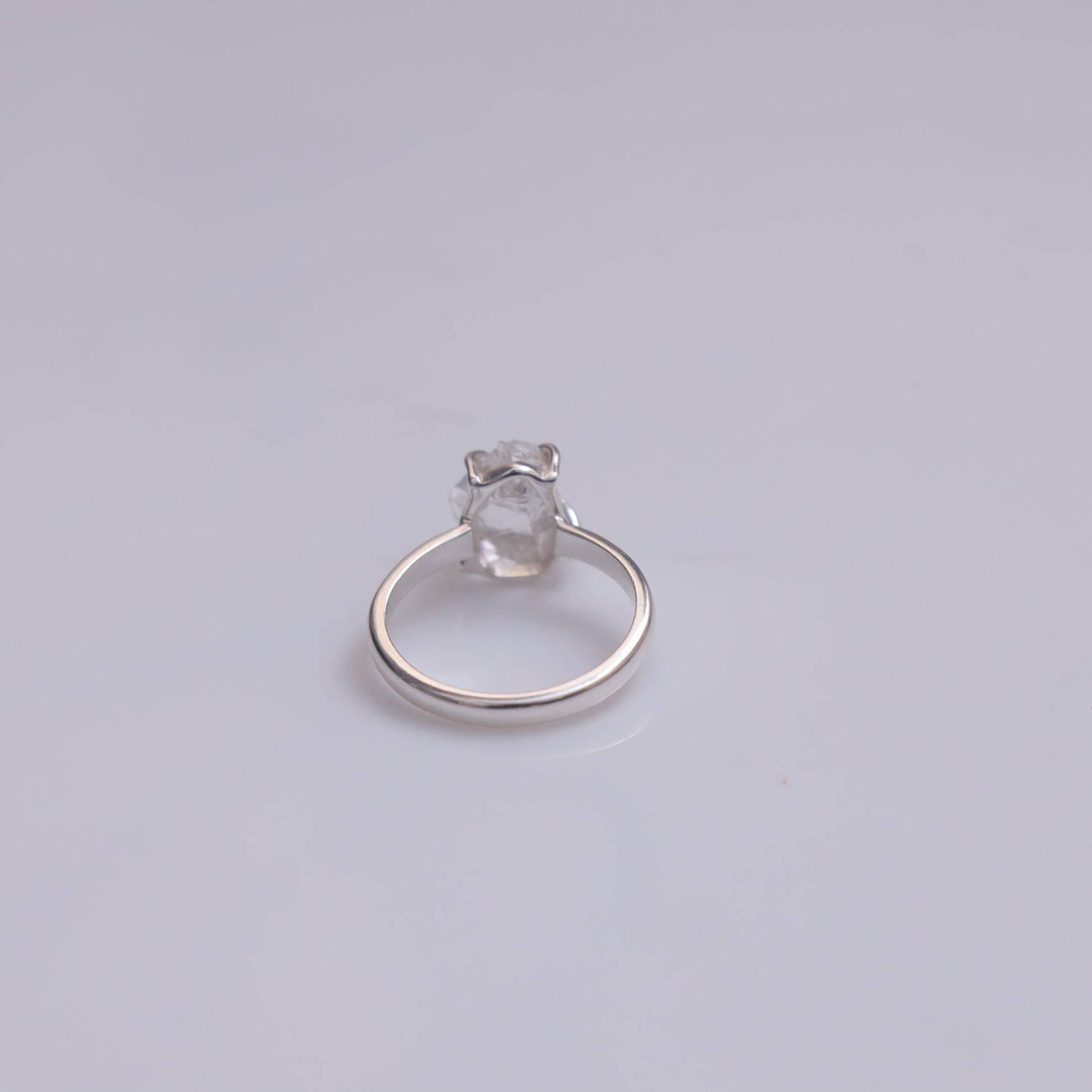 Each detail of the ring showcases expert craftsmanship, from the precisely set prongs securing the Herkimer to the polished silver band ensuring a comfortable fit. The design allows the Herkimer to shine as the focal point, making it a versatile accessory suitable for everyday wear or special occasions.