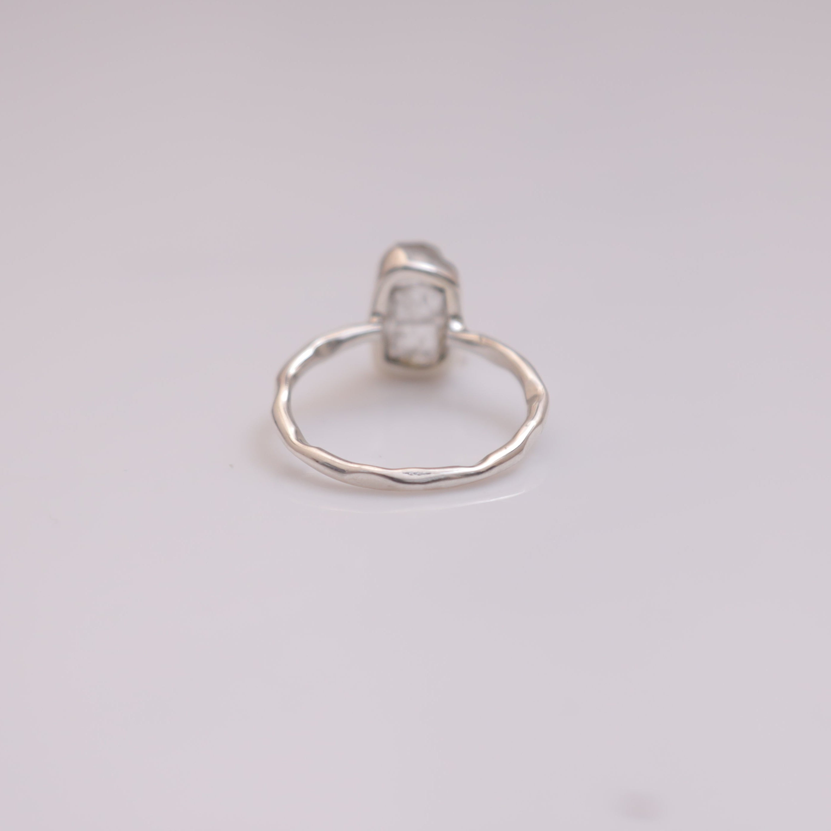 Each detail of the ring showcases expert craftsmanship, from the precisely set prongs securing the Herkimer to the polished silver band ensuring a comfortable fit. The design allows the Herkimer to shine as the focal point, making it a versatile accessory suitable for everyday wear or special occasions.