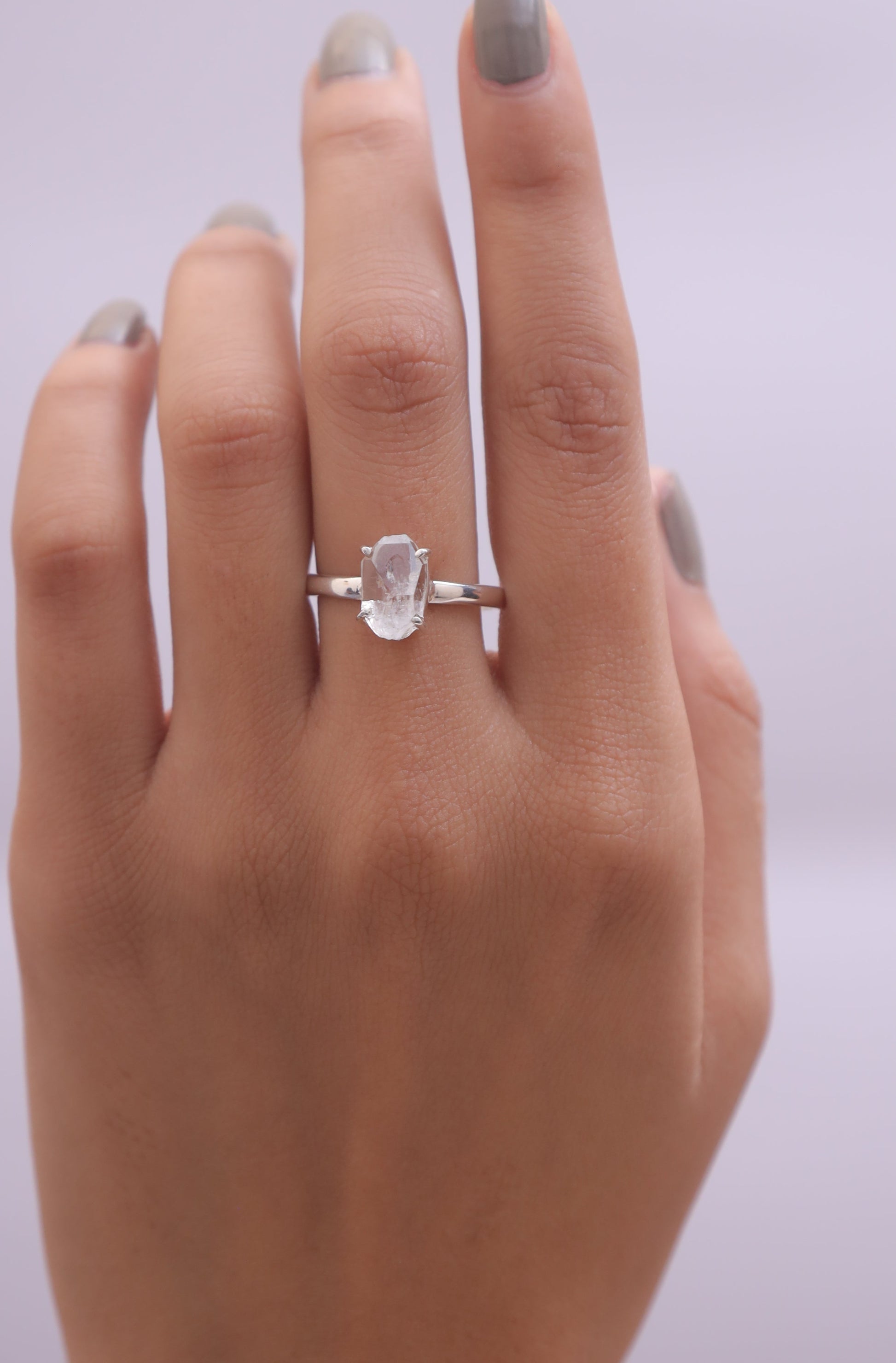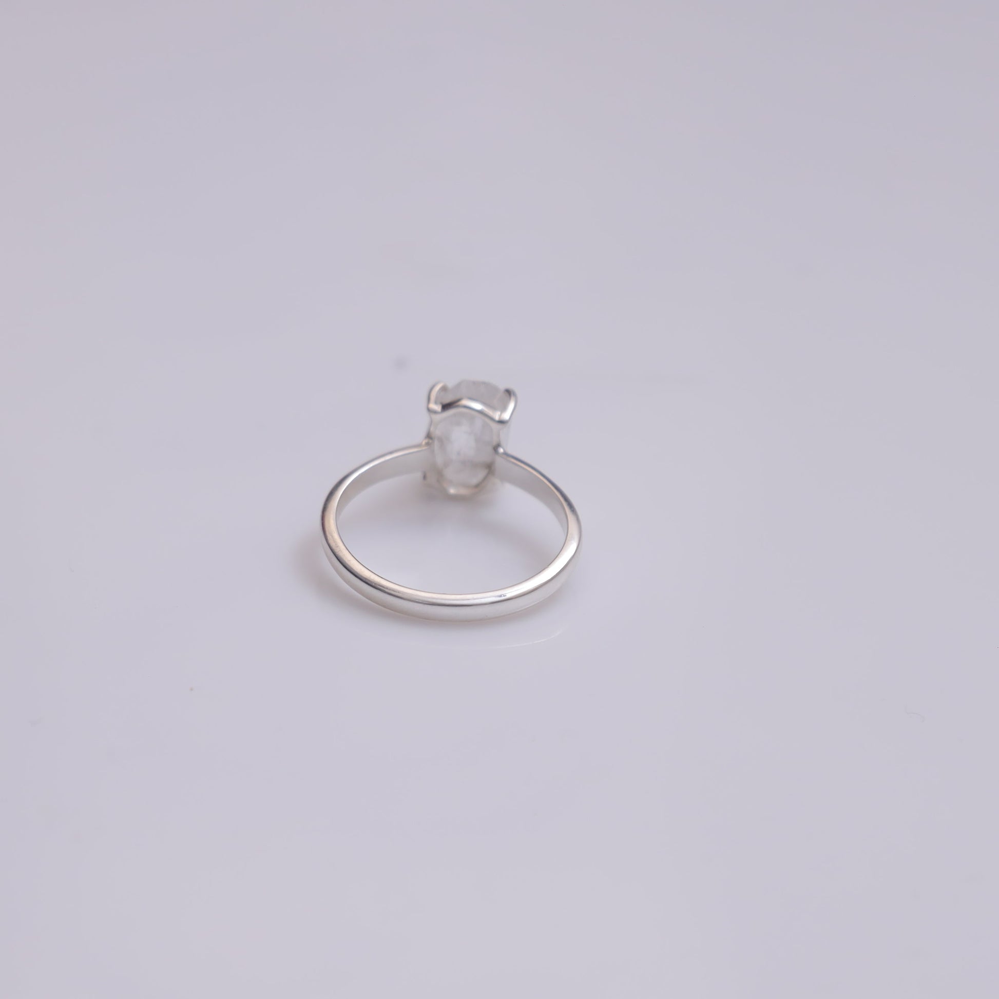 Each detail of the ring showcases expert craftsmanship, from the precisely set prongs securing the Herkimer to the polished silver band ensuring a comfortable fit. The design allows the Herkimer to shine as the focal point, making it a versatile accessory suitable for everyday wear or special occasions.