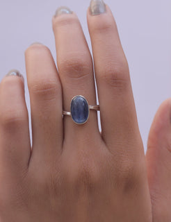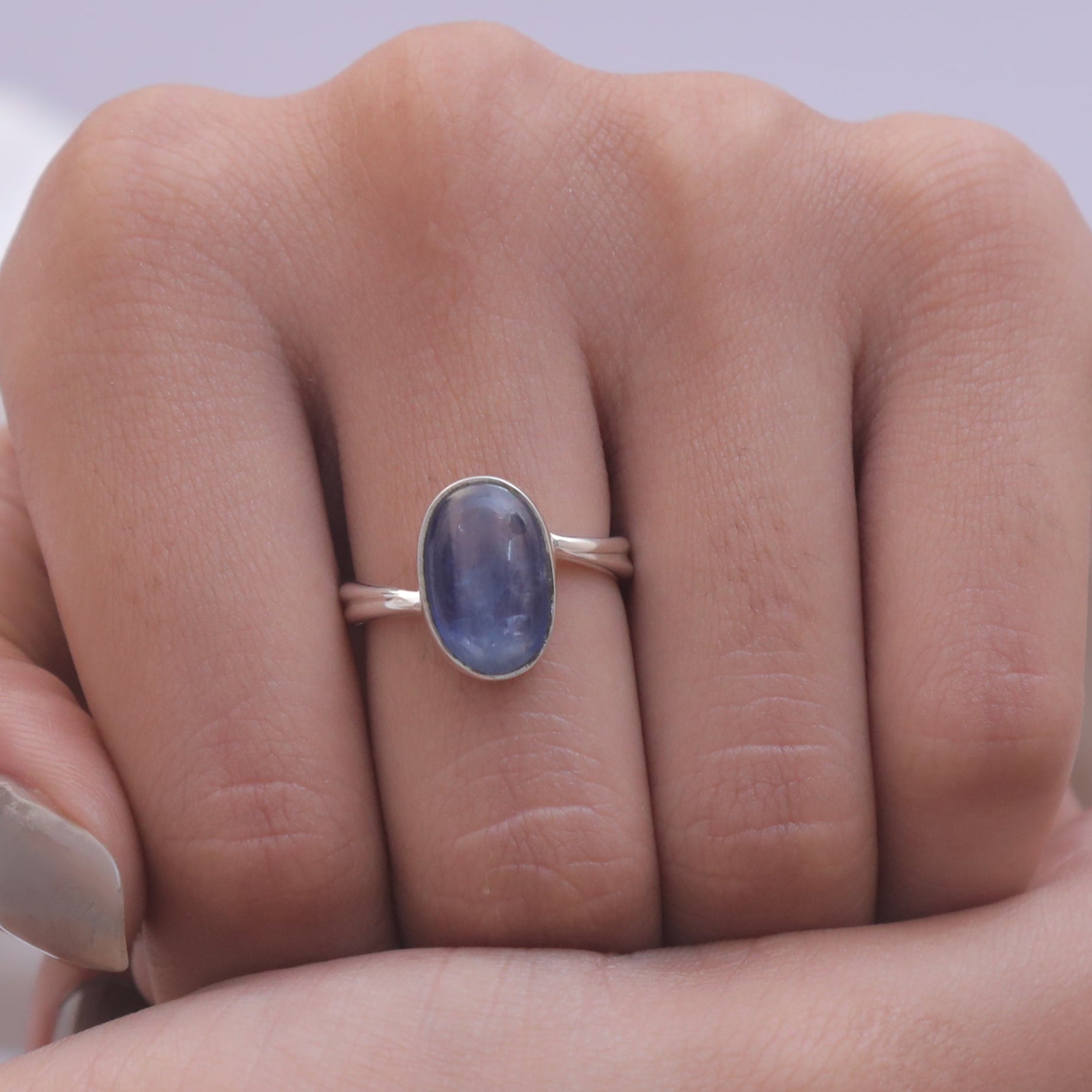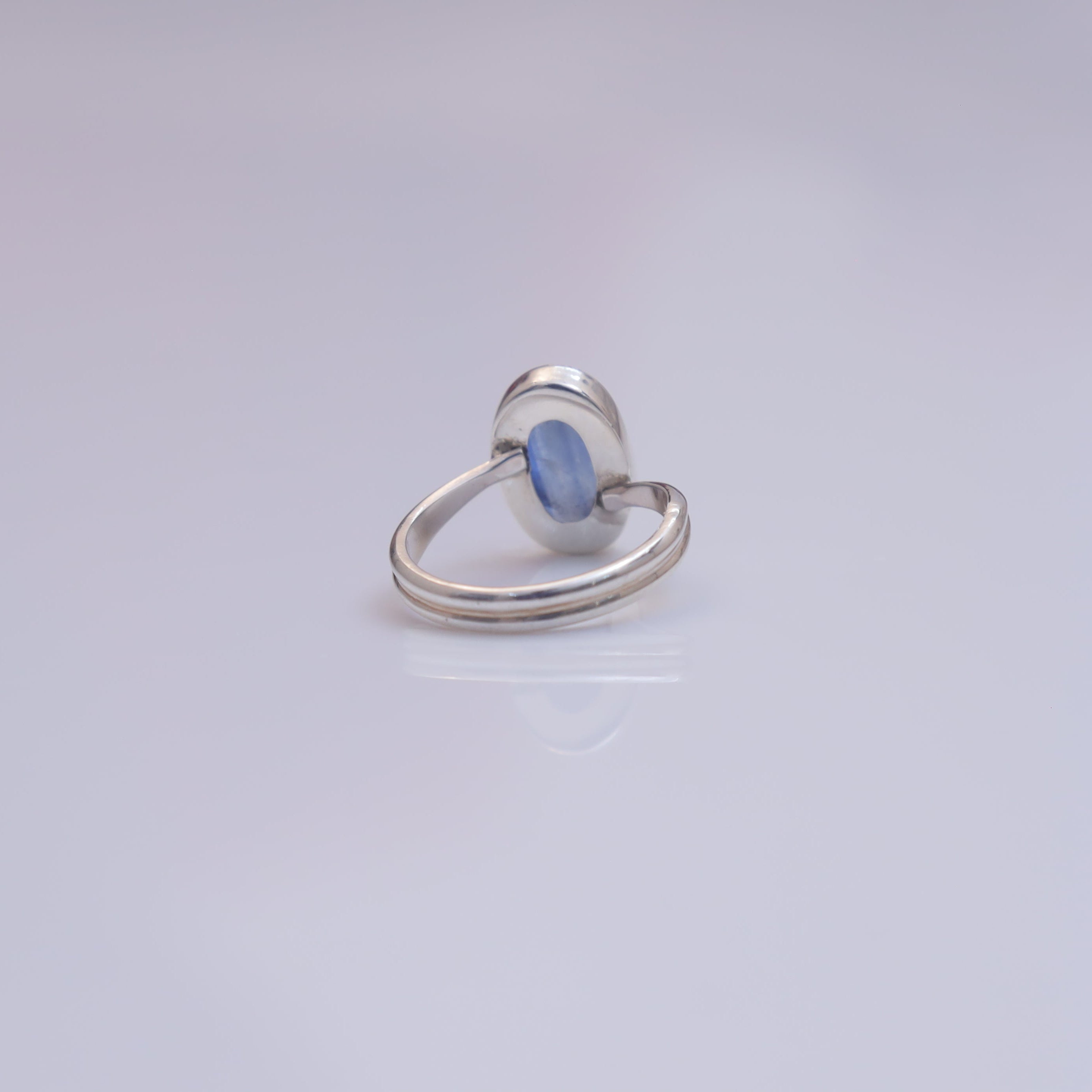 Each detail of the ring showcases expert craftsmanship, from the precisely set prongs securing the Kyanite to the polished silver band ensuring a comfortable fit. The design allows the Kyanite to shine as the focal point, making it a versatile accessory suitable for everyday wear or special occasions.
