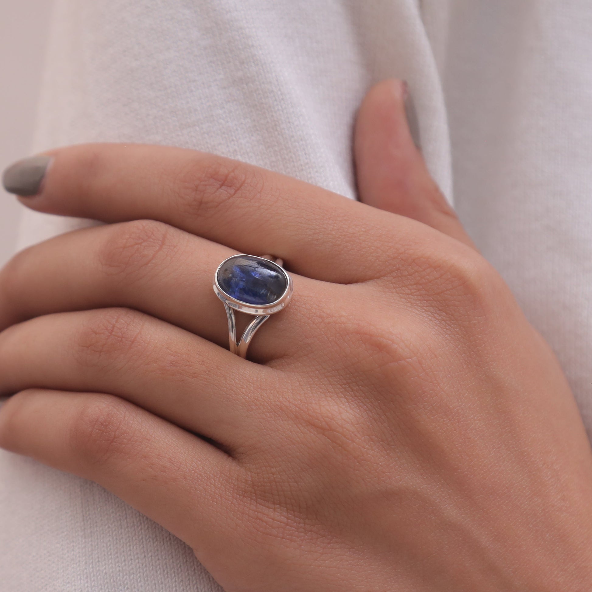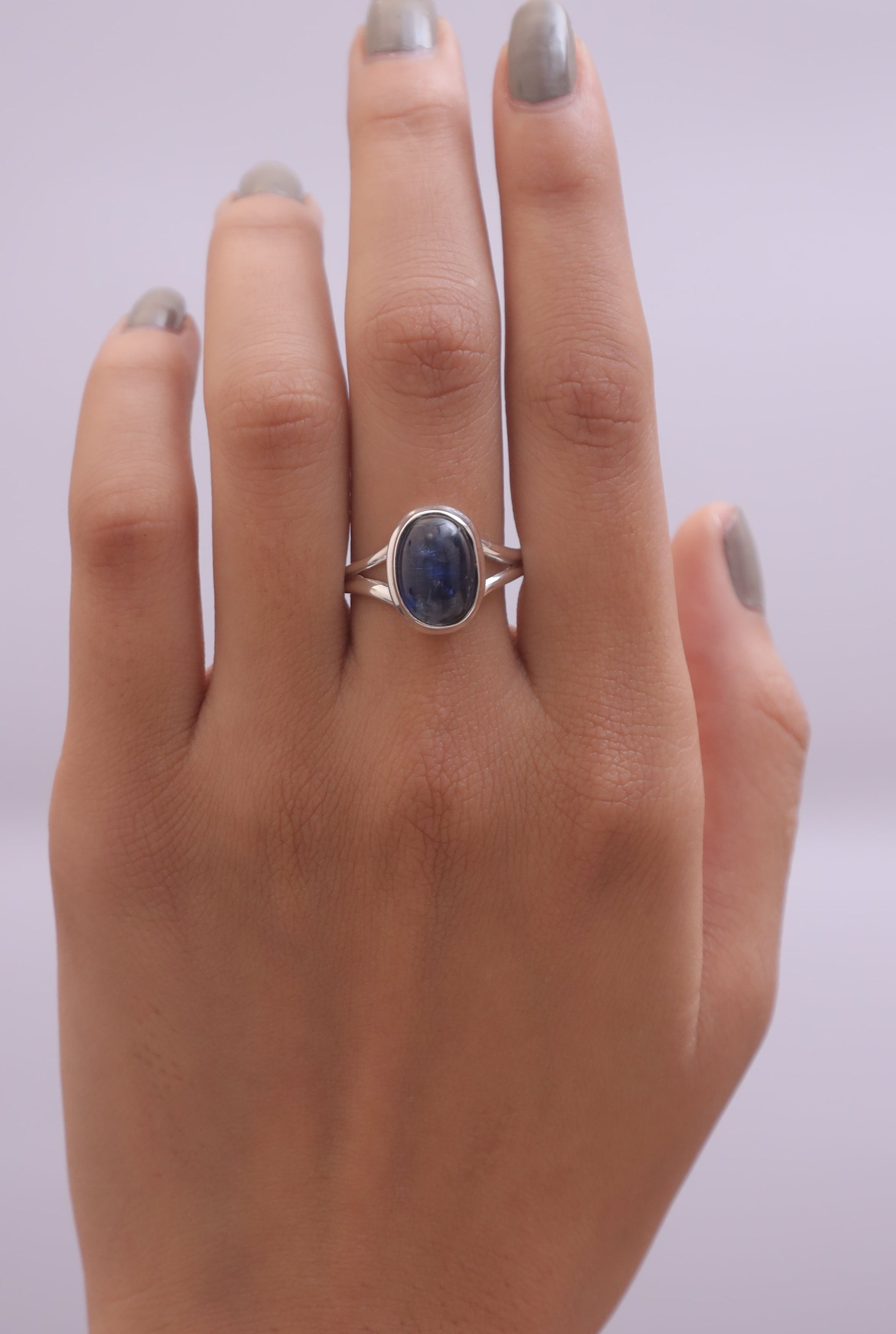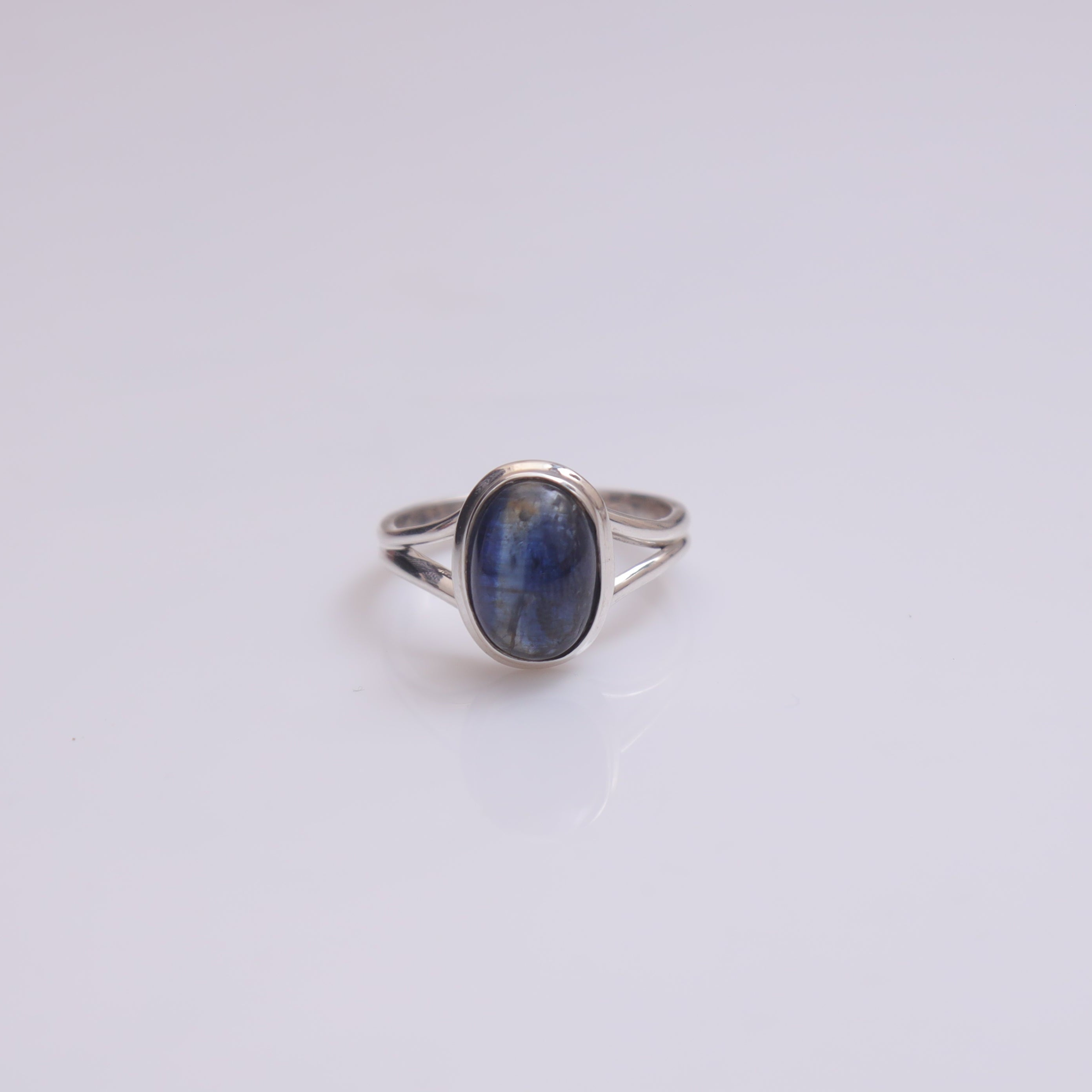 Each detail of the ring showcases expert craftsmanship, from the precisely set prongs securing the Kyanite to the polished silver band ensuring a comfortable fit. The design allows the Kyanite to shine as the focal point, making it a versatile accessory suitable for everyday wear or special occasions.