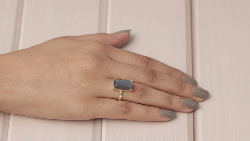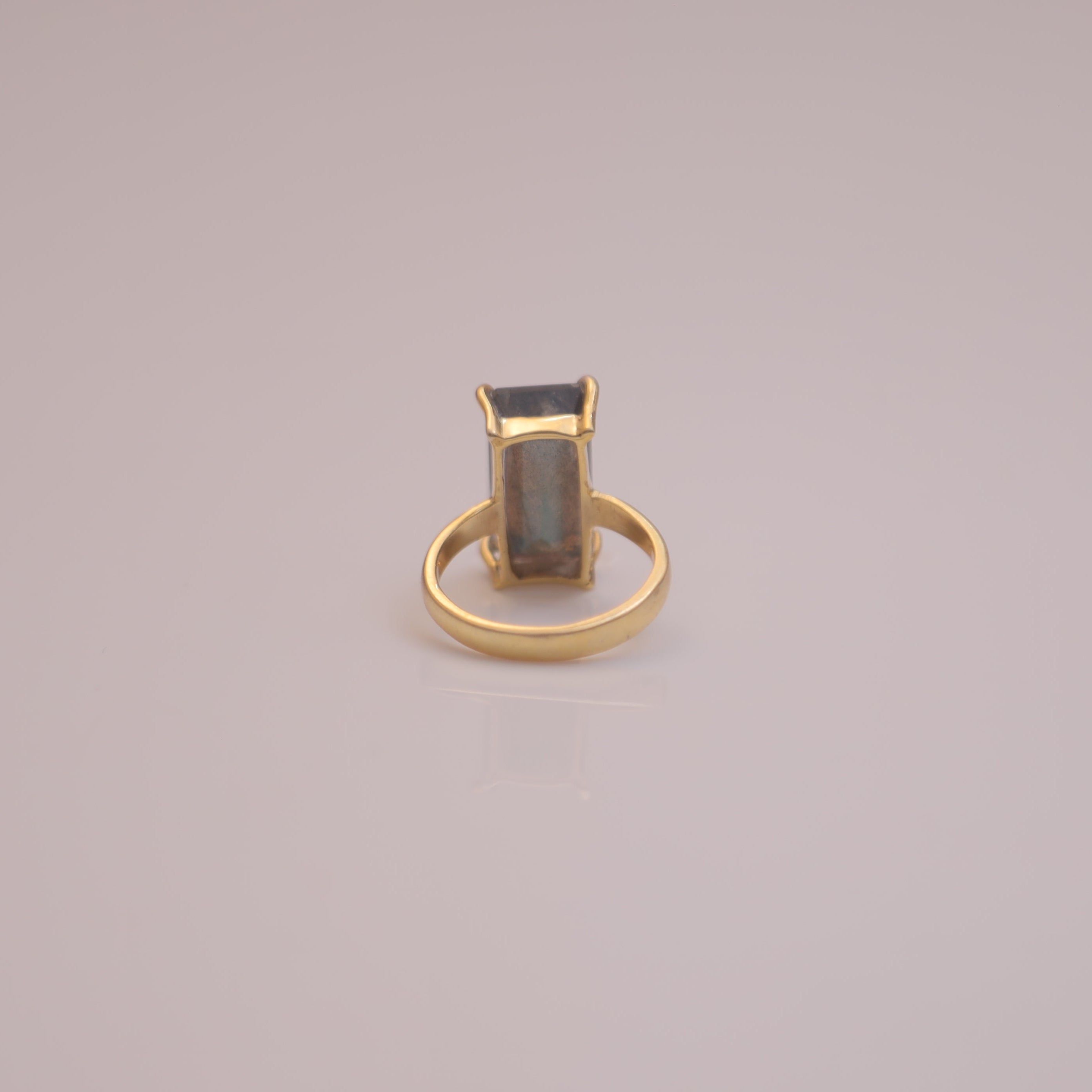 Each detail of the ring showcases expert craftsmanship, from the precisely set prongs securing the Labradorite to the polished silver band ensuring a comfortable fit. The design allows the Labradorite to shine as the focal point, making it a versatile accessory suitable for everyday wear or special occasions.
