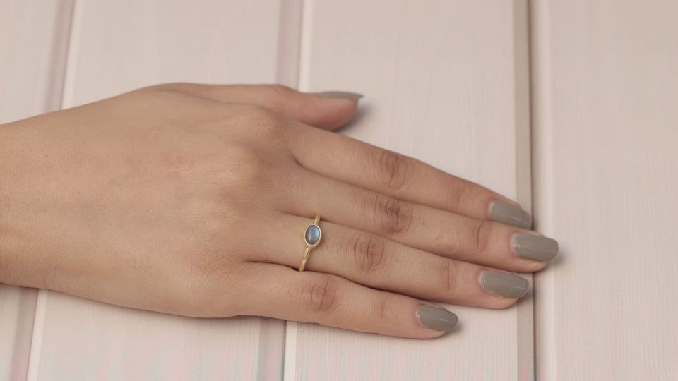 Each detail of the ring showcases expert craftsmanship, from the precisely set prongs securing the Labradorite to the polished silver band ensuring a comfortable fit. The design allows the Labradorite to shine as the focal point, making it a versatile accessory suitable for everyday wear or special occasions.
