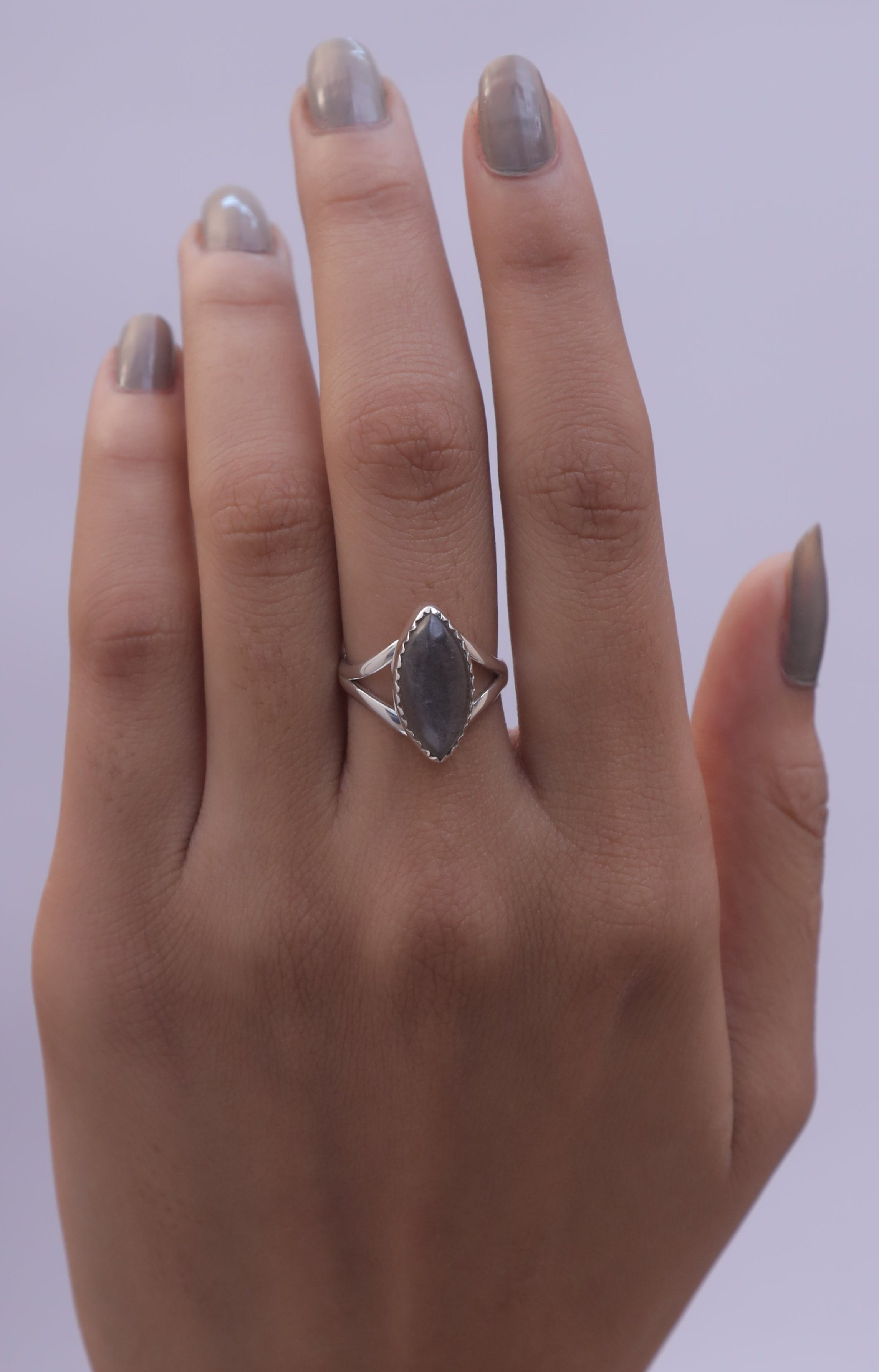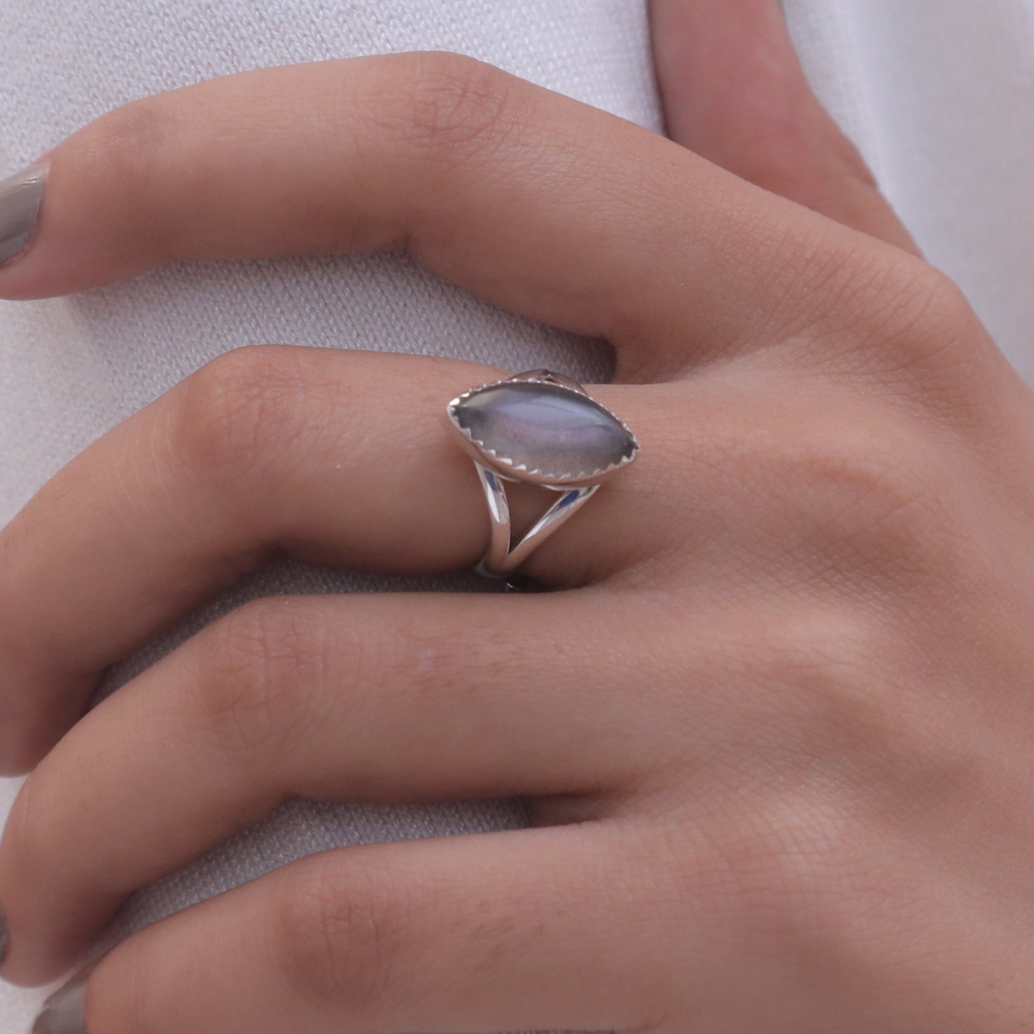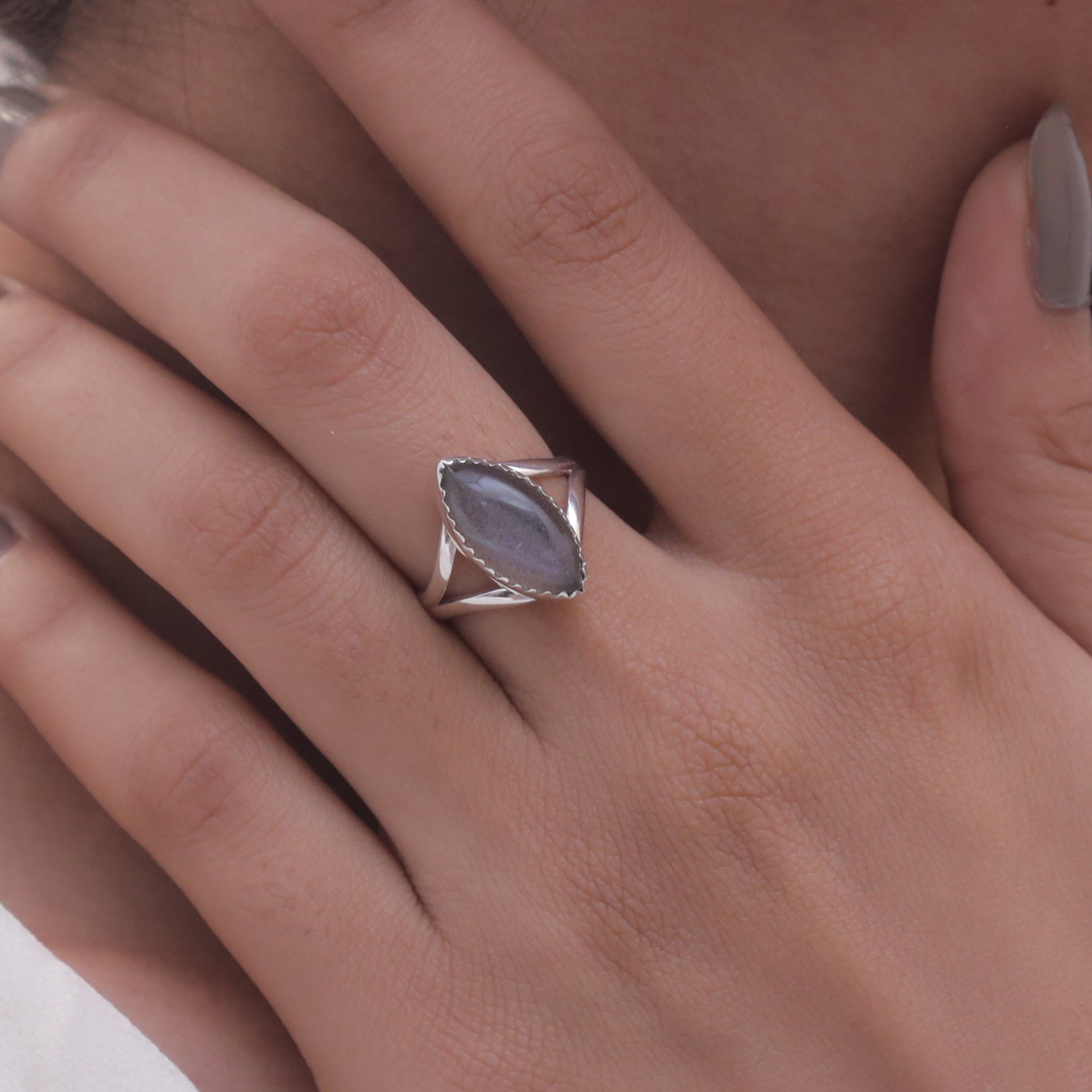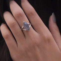 Elevate your style with the Purple Labradorite , a masterpiece that blends natural beauty with refined craftsmanship. The ring features a radiant Purple Labradorite centrepiece, carefully cut to enhance its inherent allure and brilliance. Set in a band crafted from 925 sterling silver, it offers durability and a lasting shine that complements the gemstone’s mesmerizing glow.