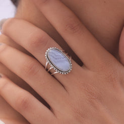 Elevate your style with the Blue Lace Agate , a masterpiece that blends natural beauty with refined craftsmanship. The ring features a radiant Blue Lace Agate centerpiece, carefully cut to enhance its inherent allure and brilliance. Set in a band crafted from 925 sterling silver, it offers durability and a lasting shine that complements the gemstone’s mesmerizing glow.