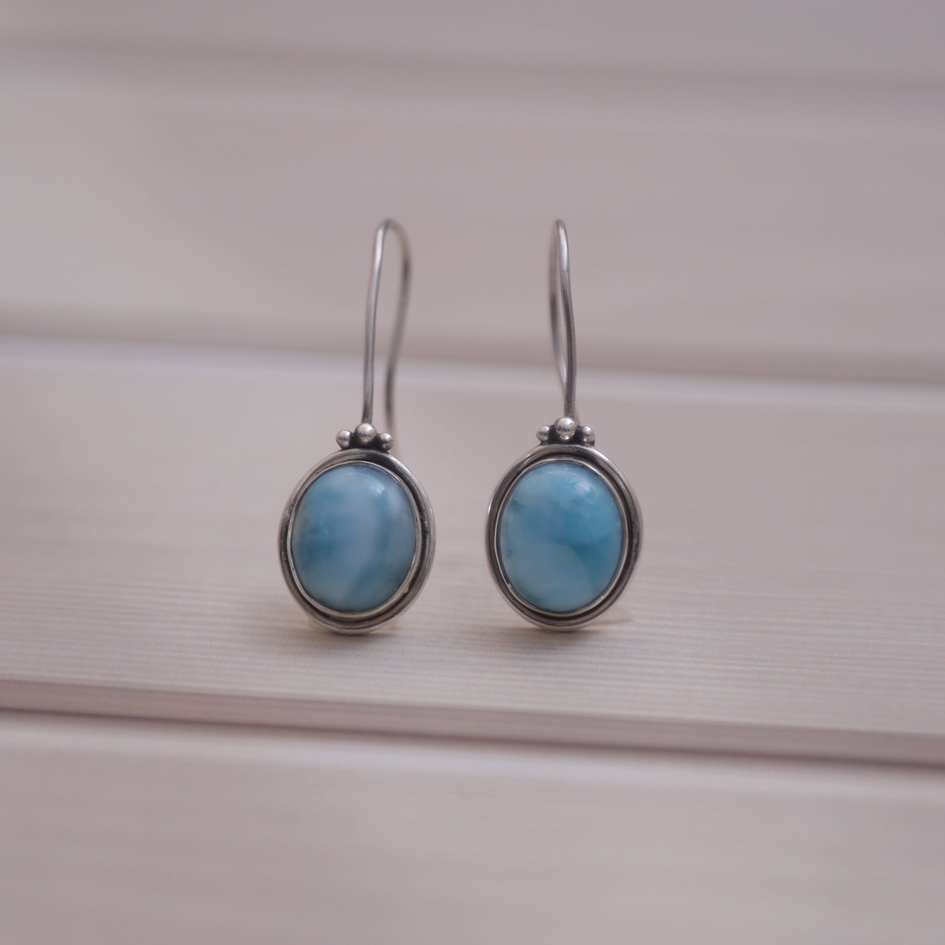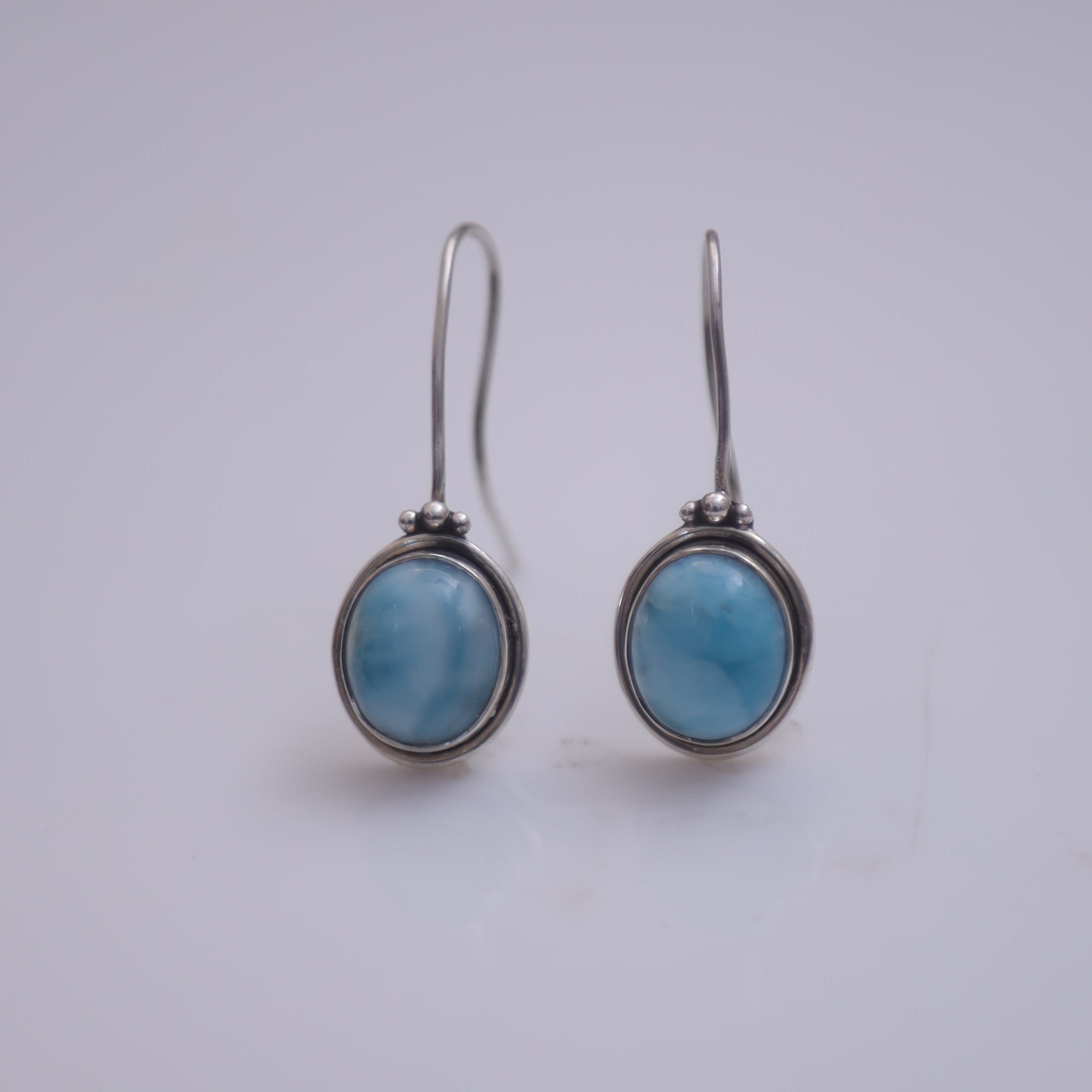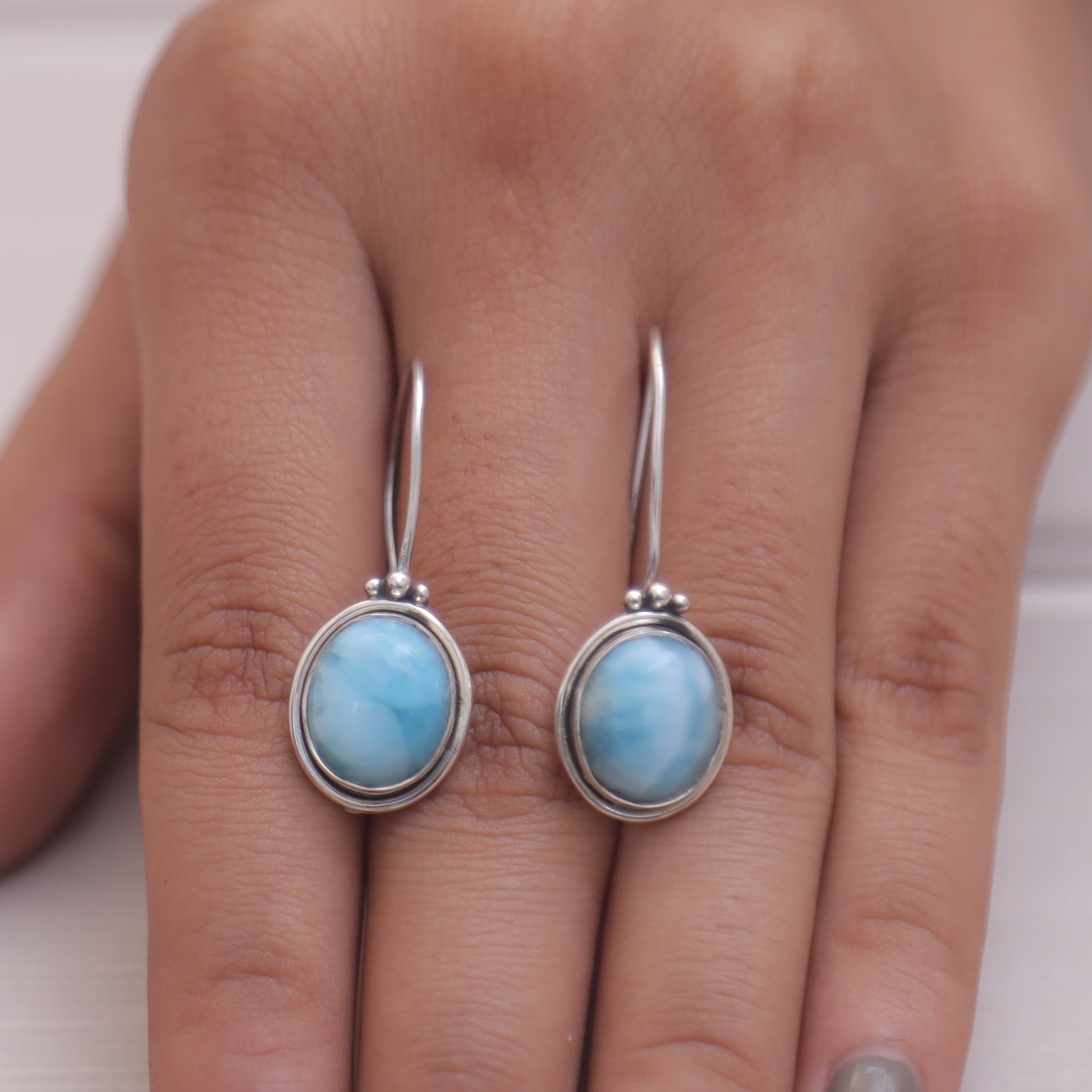 Crafted with precision, the larimar is securely held by polished prongs, allowing it to shine as the focal point of each Earrings . The design ensures comfort and a perfect fit, making these Earrings versatile for everyday wear or special occasions.