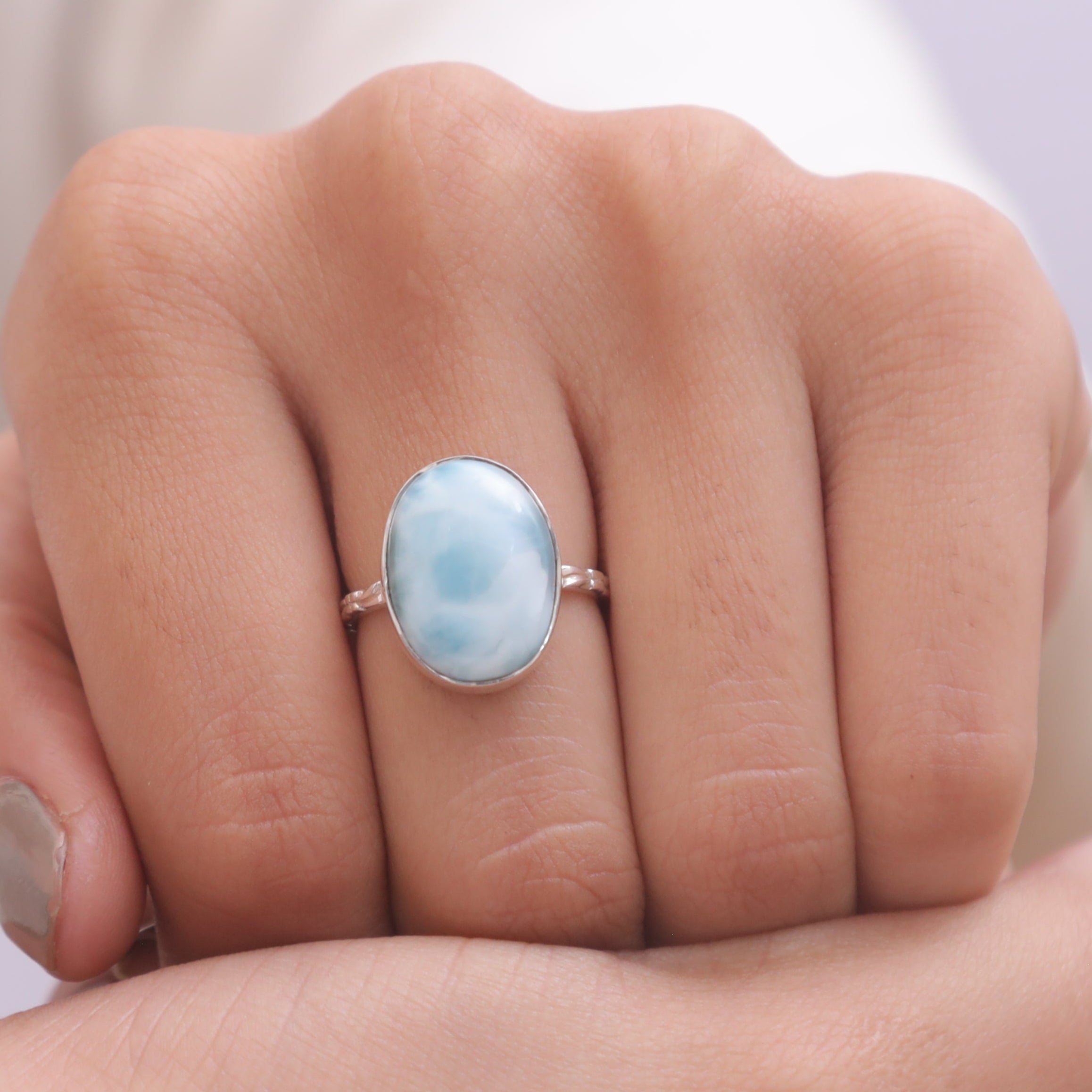 Elevate your style with the Larimar Ring, a masterpiece that blends natural beauty with refined craftsmanship. The ring features a radiant Larimar centerpiece, carefully cut to enhance its inherent allure and brilliance. Set in a band crafted from 925 sterling silver, it offers durability and a lasting shine that complements the gemstone's vibrant hue.