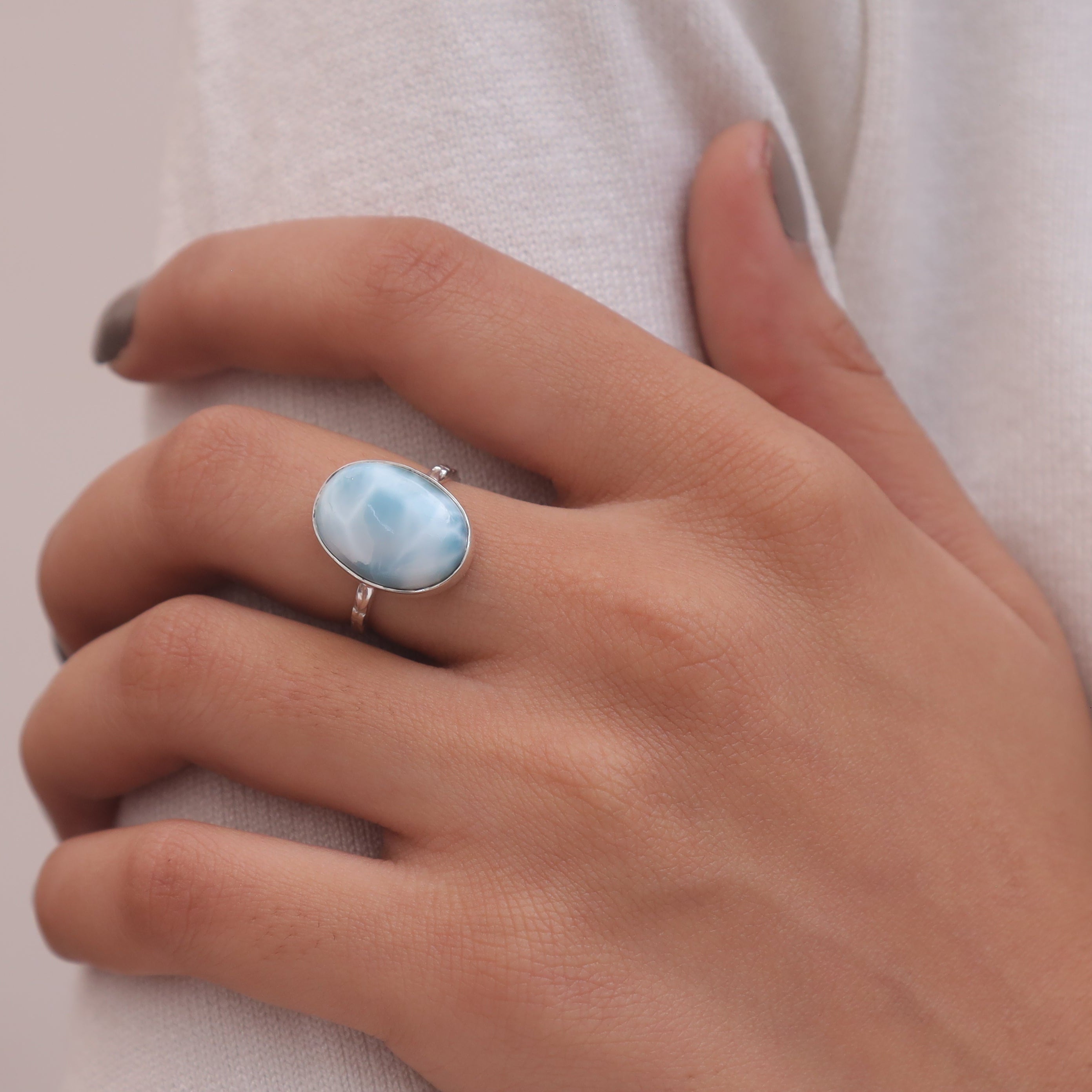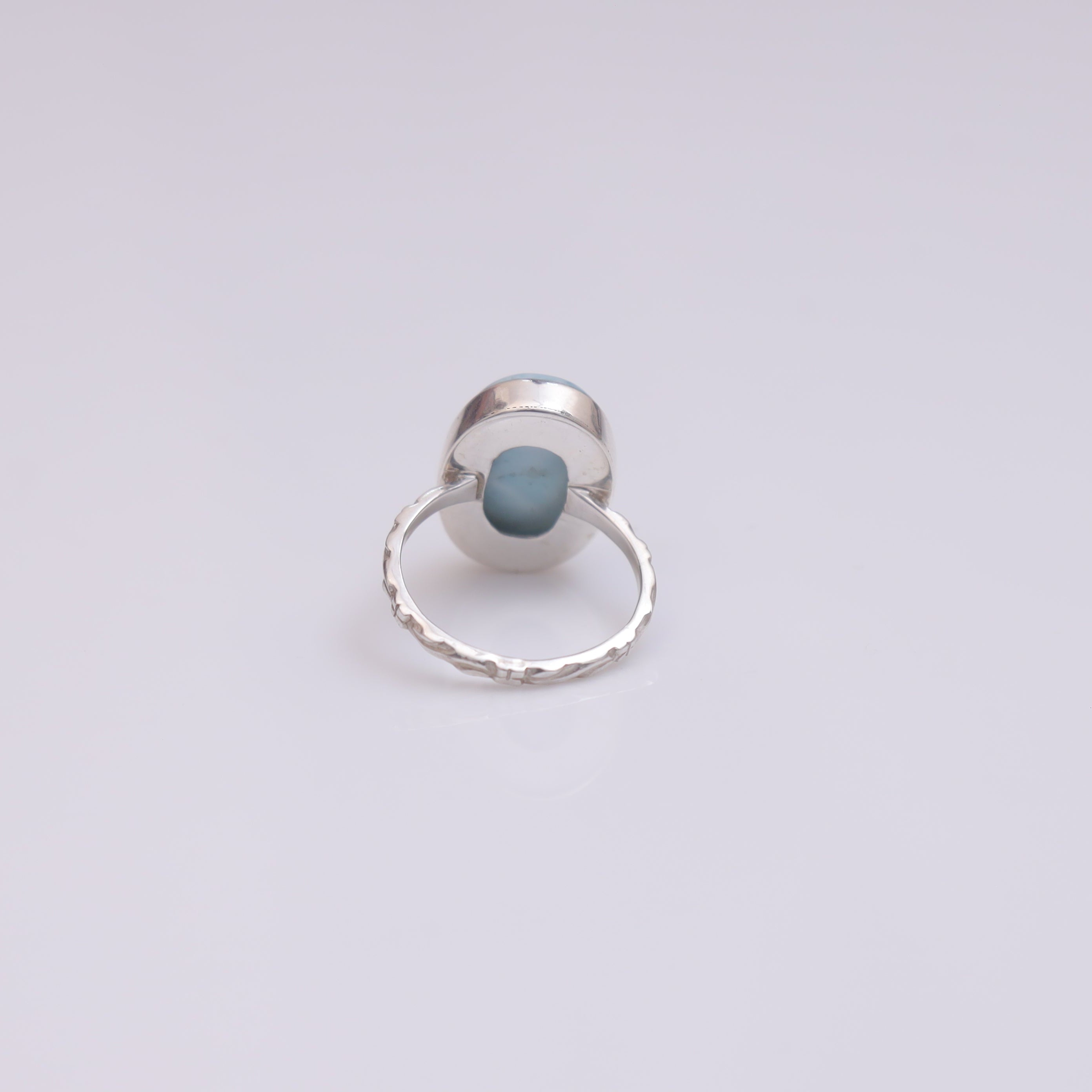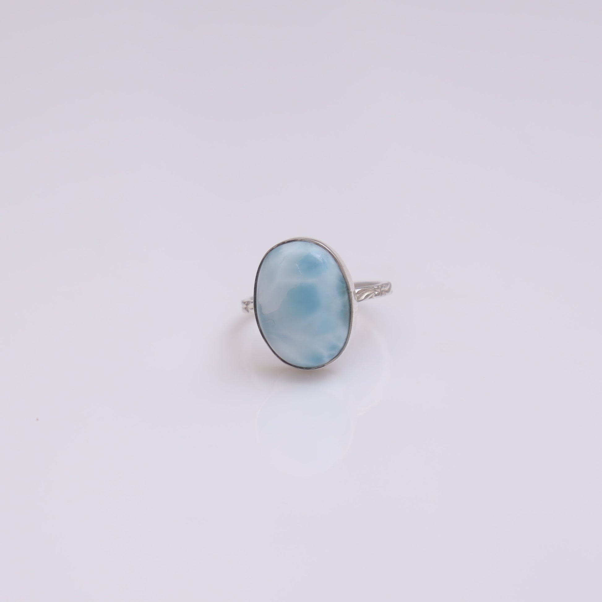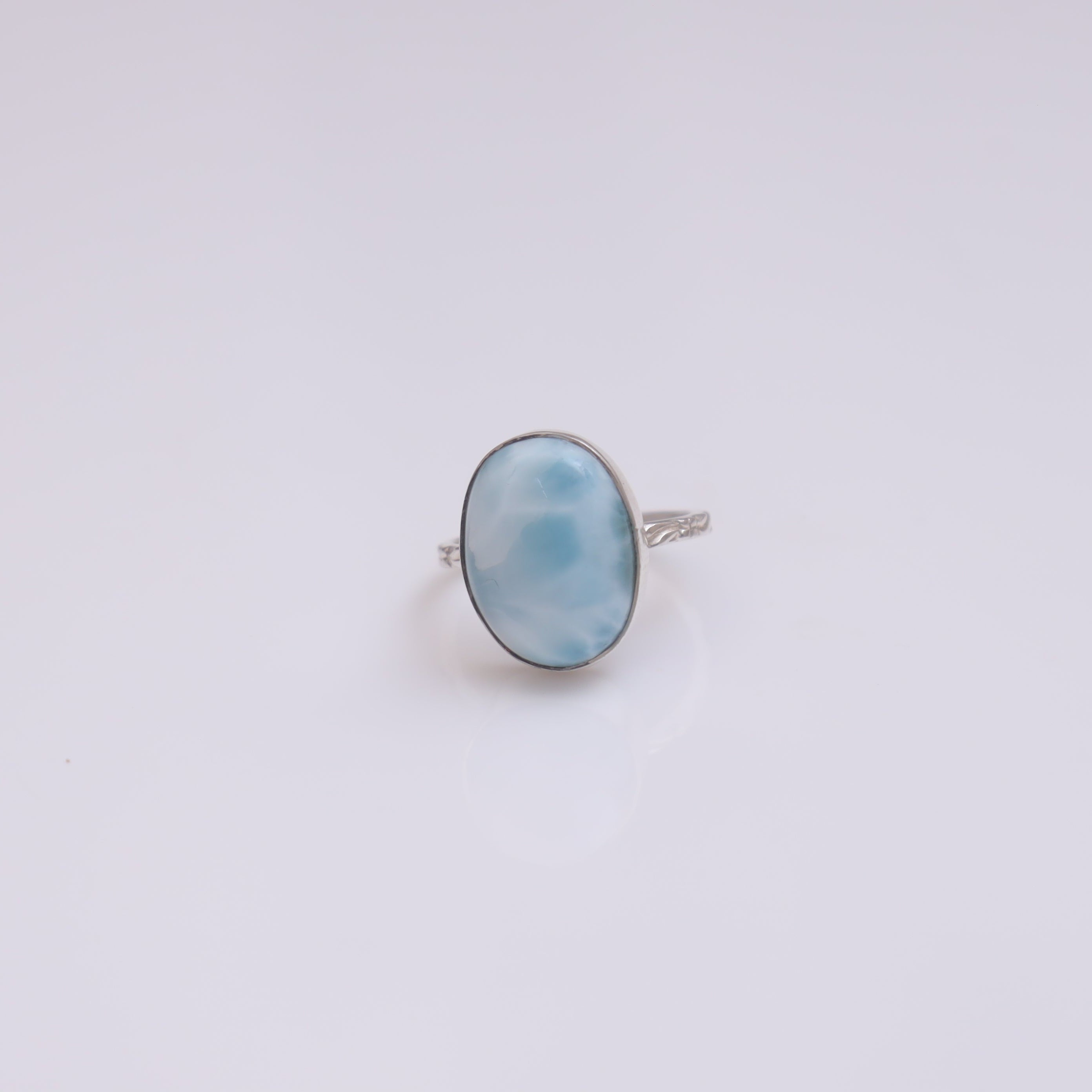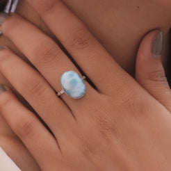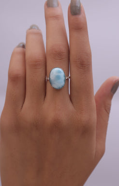 Each detail of the ring showcases expert craftsmanship, from the precisely set prongs securing the Larimar to the polished silver band ensuring a comfortable fit. The design allows the Larimar to shine as the focal point, making it a versatile accessory suitable for everyday wear or special occasions.