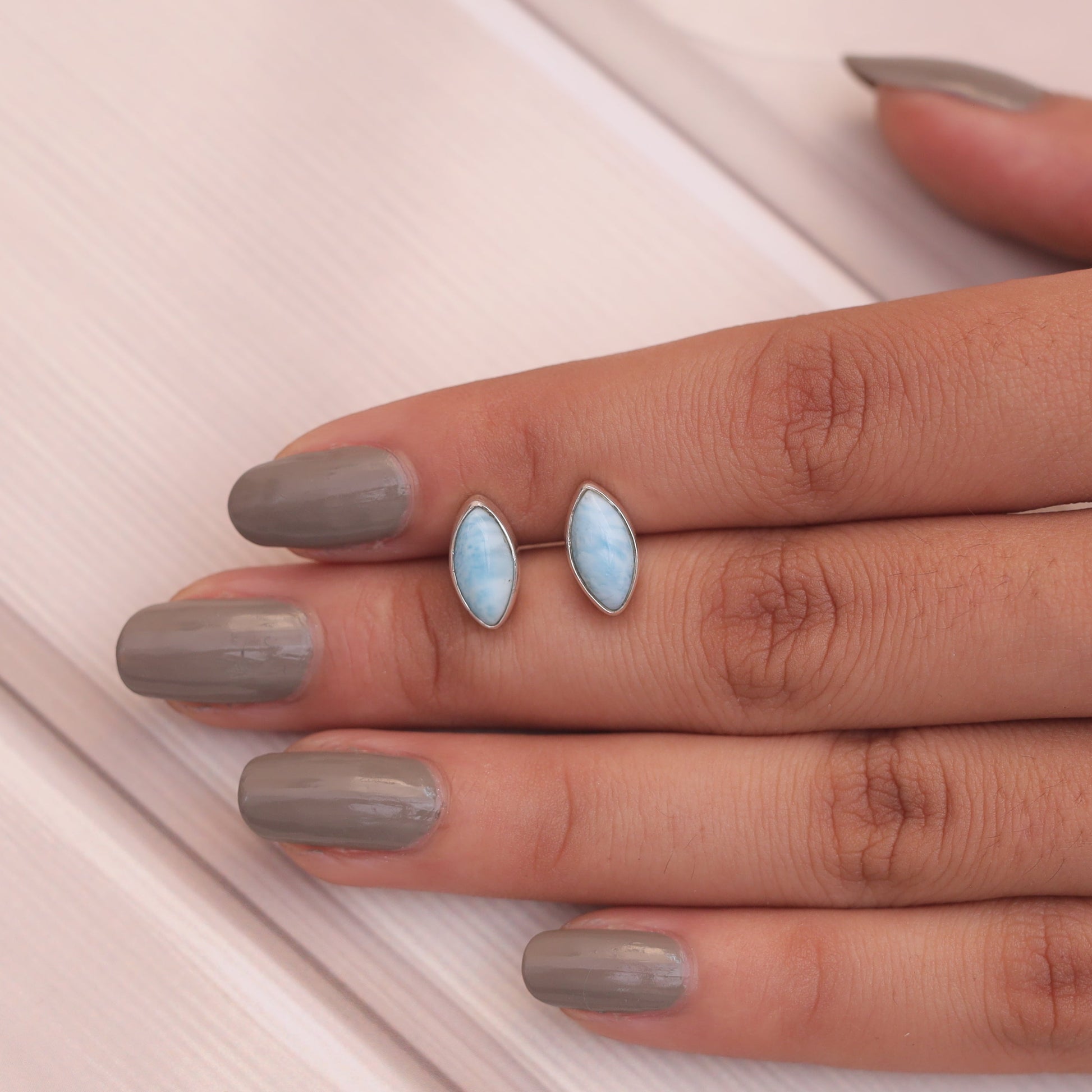 Crafted with precision, the larimar is securely held by polished prongs, allowing it to shine as the focal point of each Studs. The design ensures comfort and a perfect fit, making these studs versatile for everyday wear or special occasions.