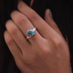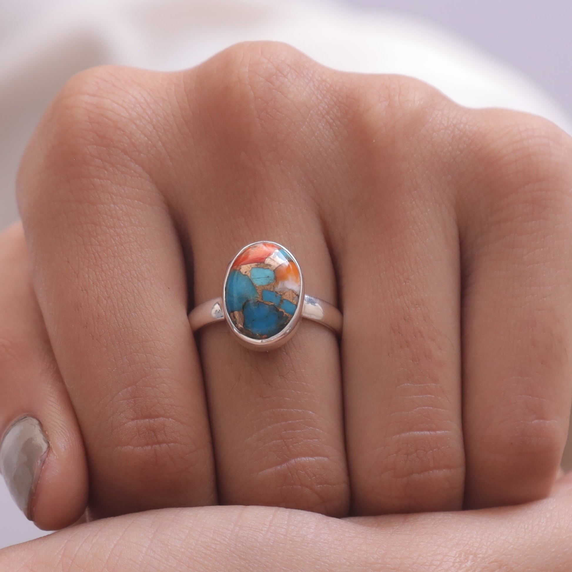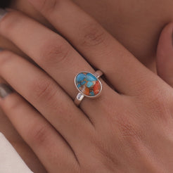Elevate your style with the Oyster Turquoise Ring, a masterpiece that blends natural beauty with refined craftsmanship. The ring features a radiant Oyster Turquoise centrepiece, carefully cut to enhance its inherent allure and brilliance. Set in a band crafted from 925 sterling silver, it offers durability and a lasting shine that complements the gemstone's vibrant hue.